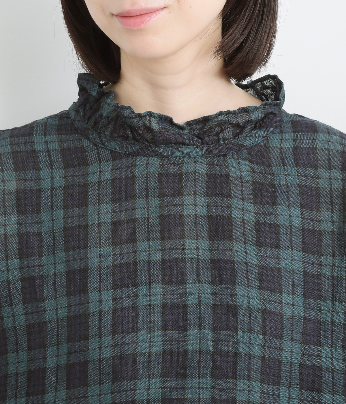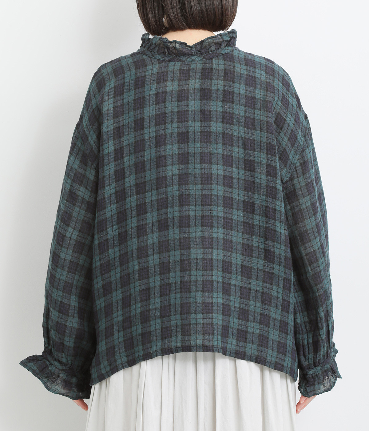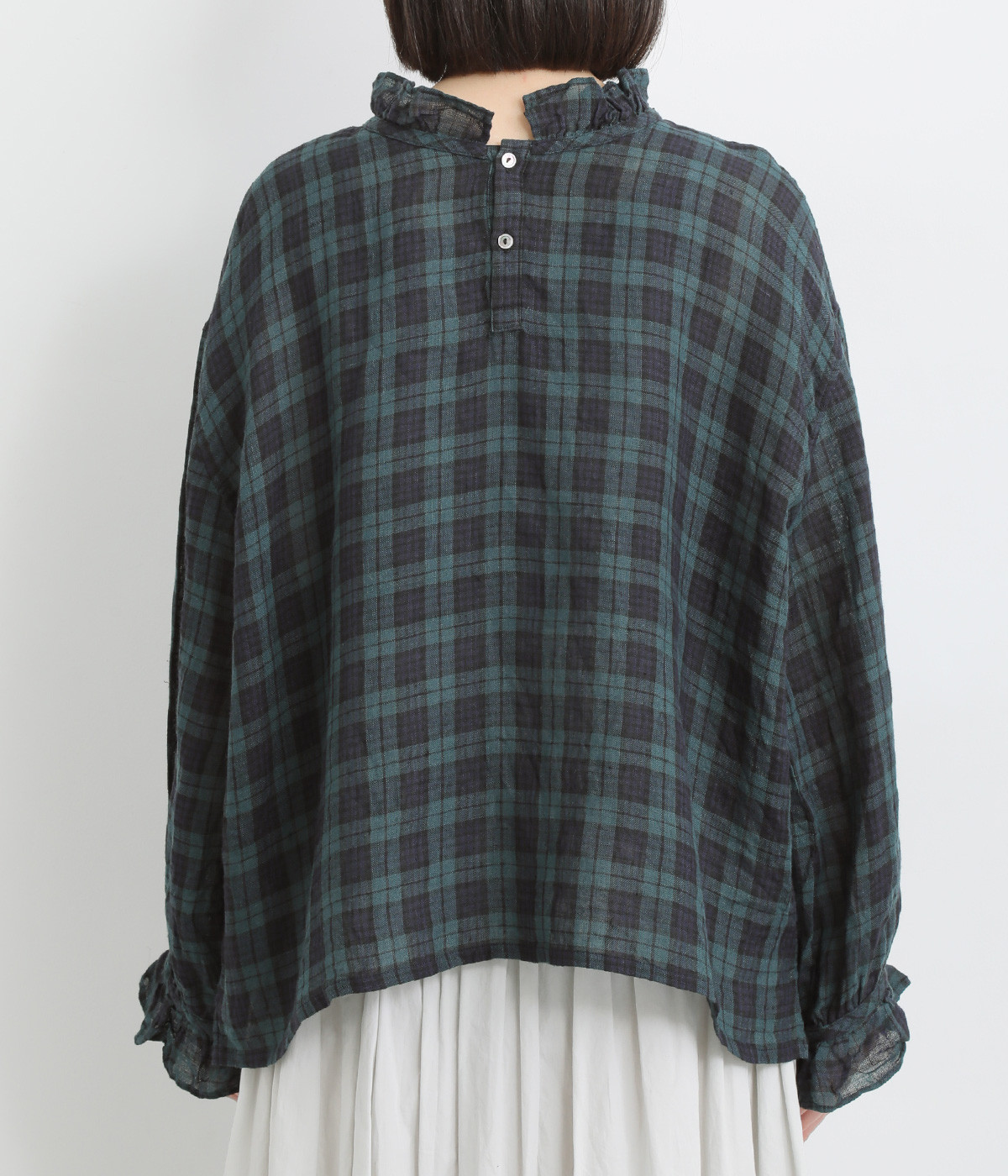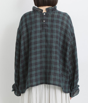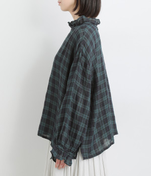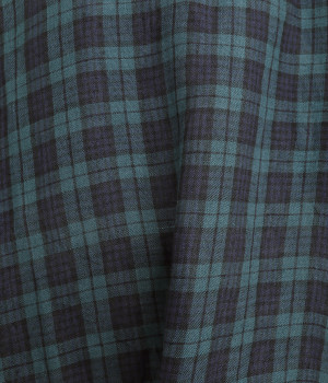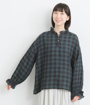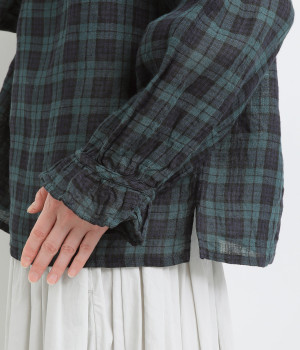 やわらかくも張りやコシ感のあるリネン素材を用いています。薄手で通気性も良く、ロングシーズン快適に着まわせる生地感です。ブラックウォッチのチェック柄が雰囲気のいい仕上がり。