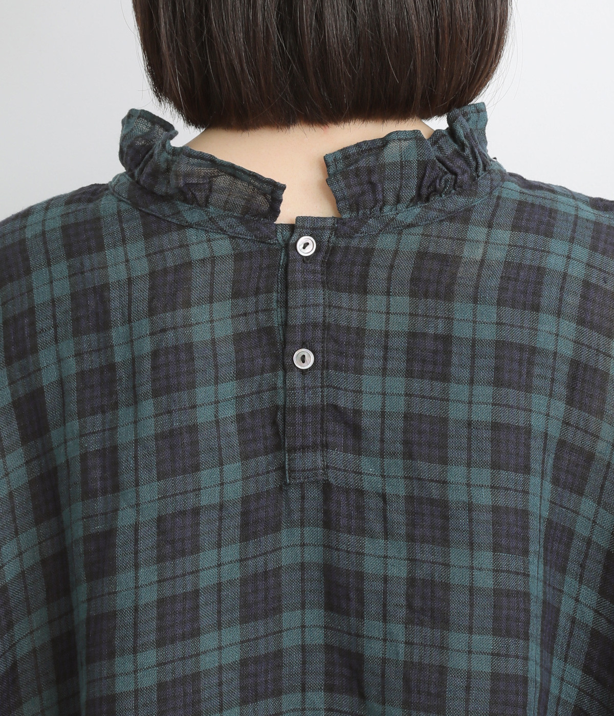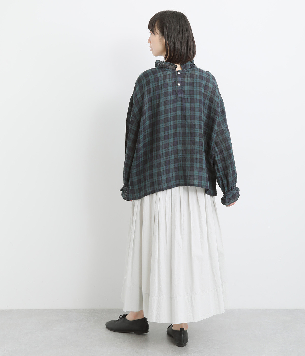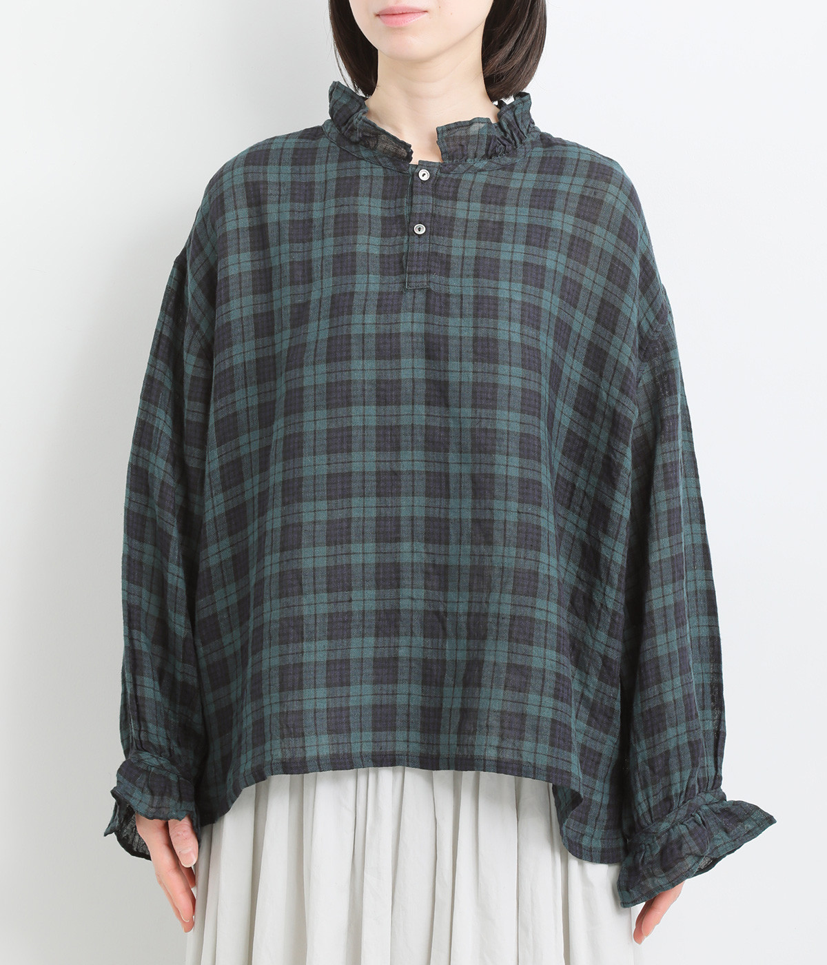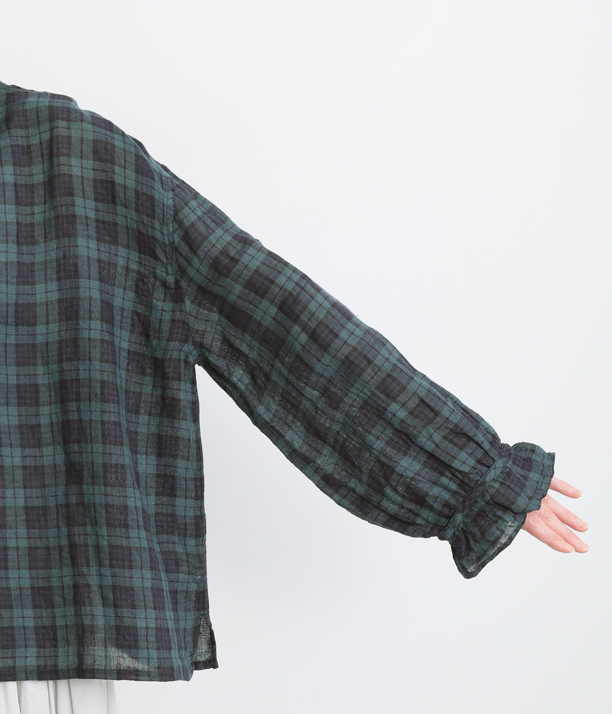 やわらかくも張りやコシ感のあるリネン素材を用いています。薄手で通気性も良く、ロングシーズン快適に着まわせる生地感です。ブラックウォッチのチェック柄が雰囲気のいい仕上がり。