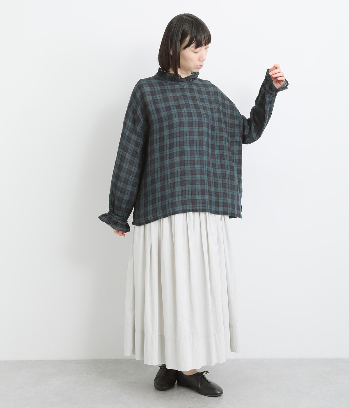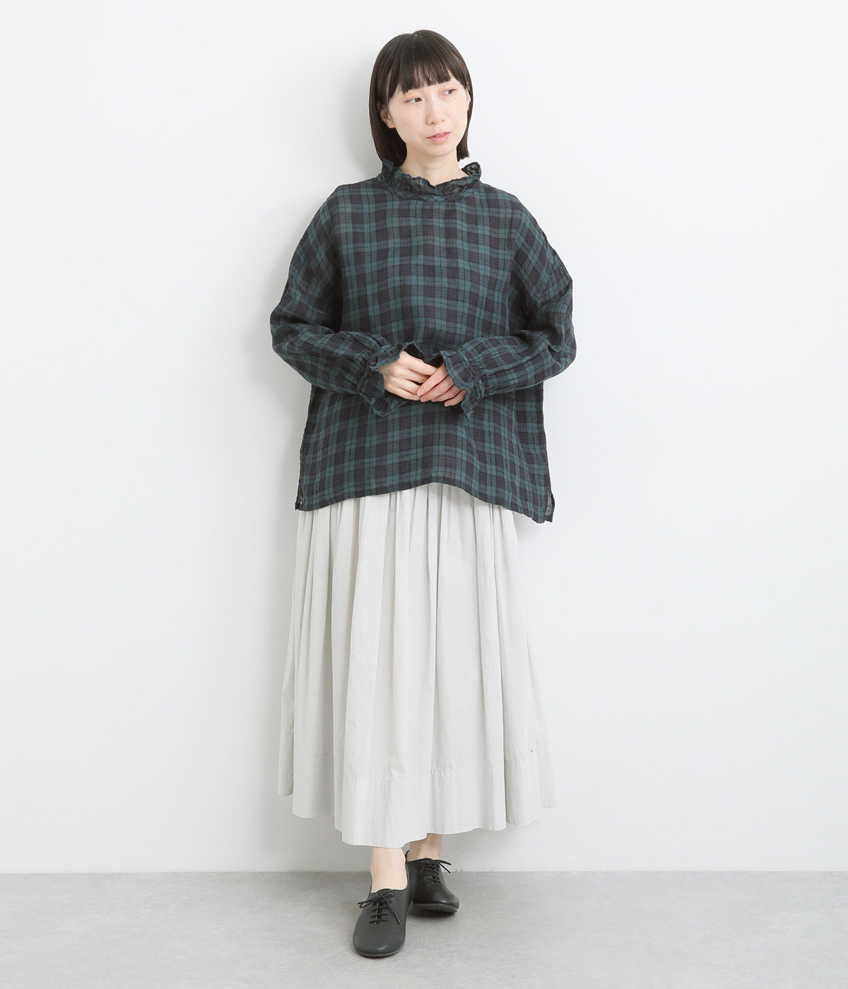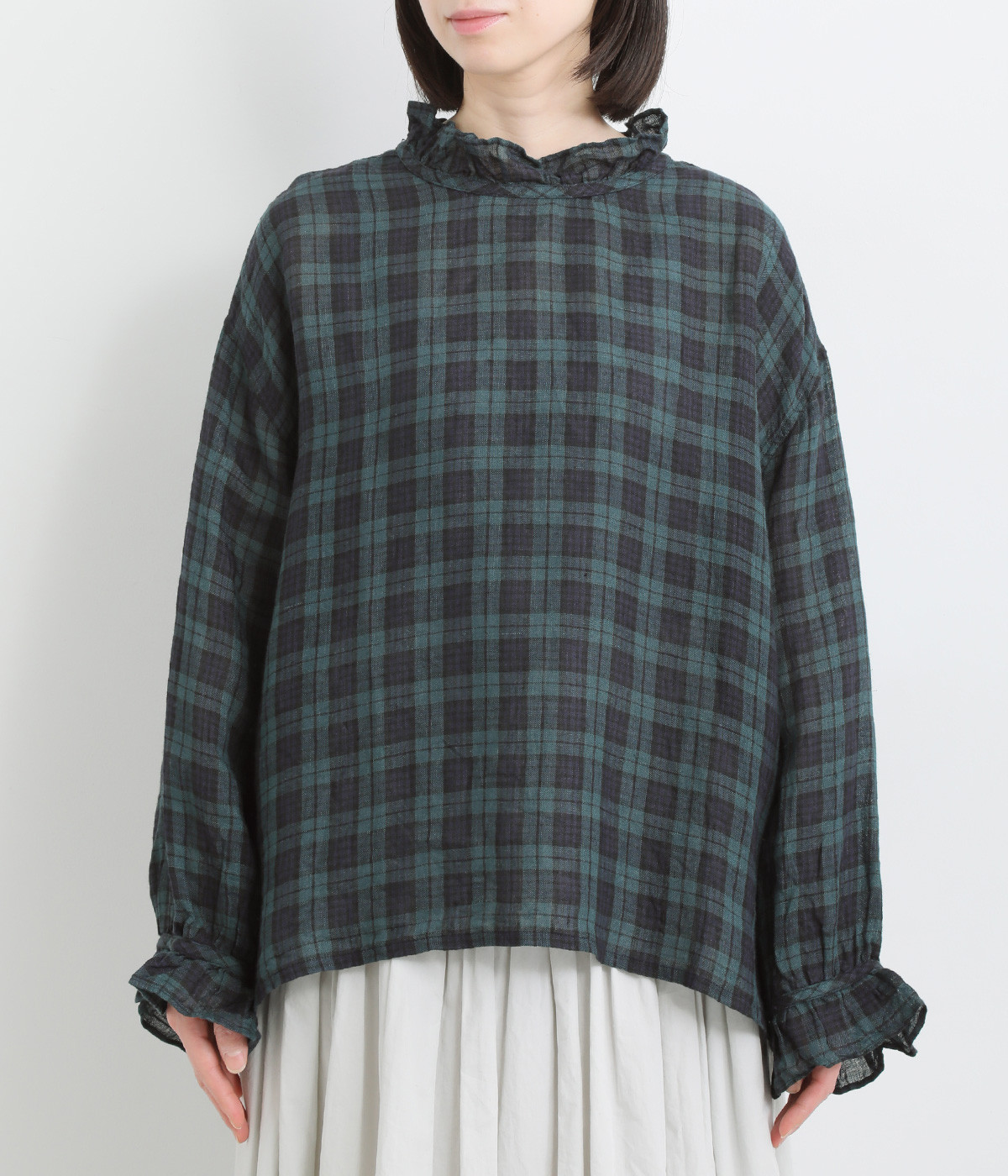 やわらかくも張りやコシ感のあるリネン素材を用いています。薄手で通気性も良く、ロングシーズン快適に着まわせる生地感です。ブラックウォッチのチェック柄が雰囲気のいい仕上がり。