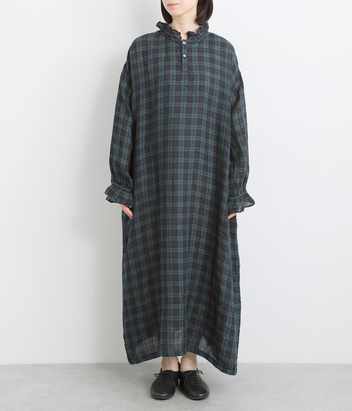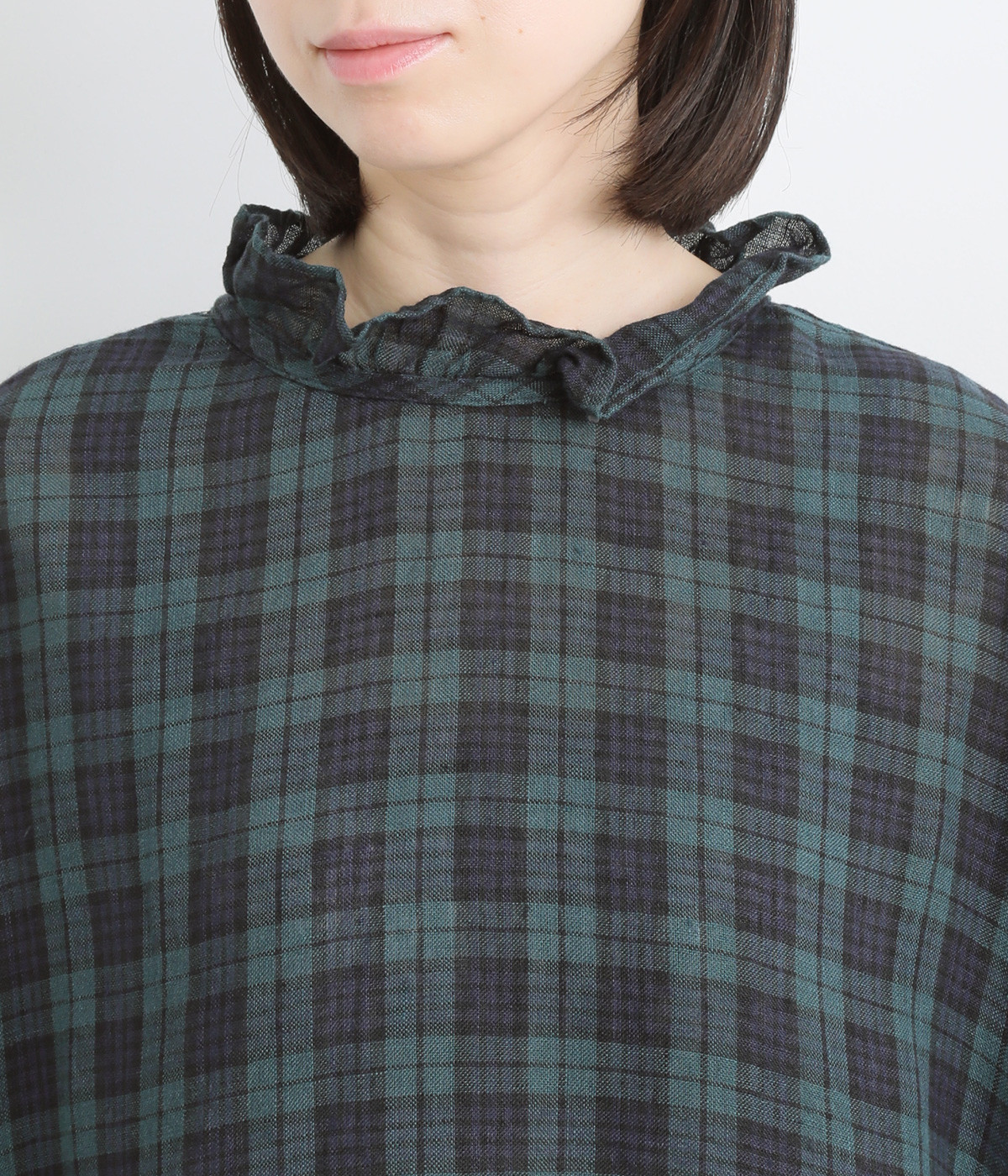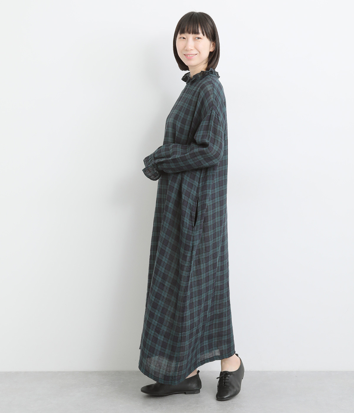 やわらかくも張りやコシ感のあるリネン素材を用いています。薄手で通気性も良く、ロングシーズン快適に着まわせる生地感です。ブラックウォッチのチェック柄が雰囲気のいい仕上がり。