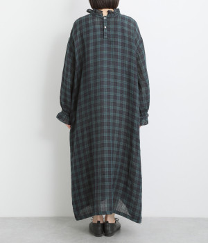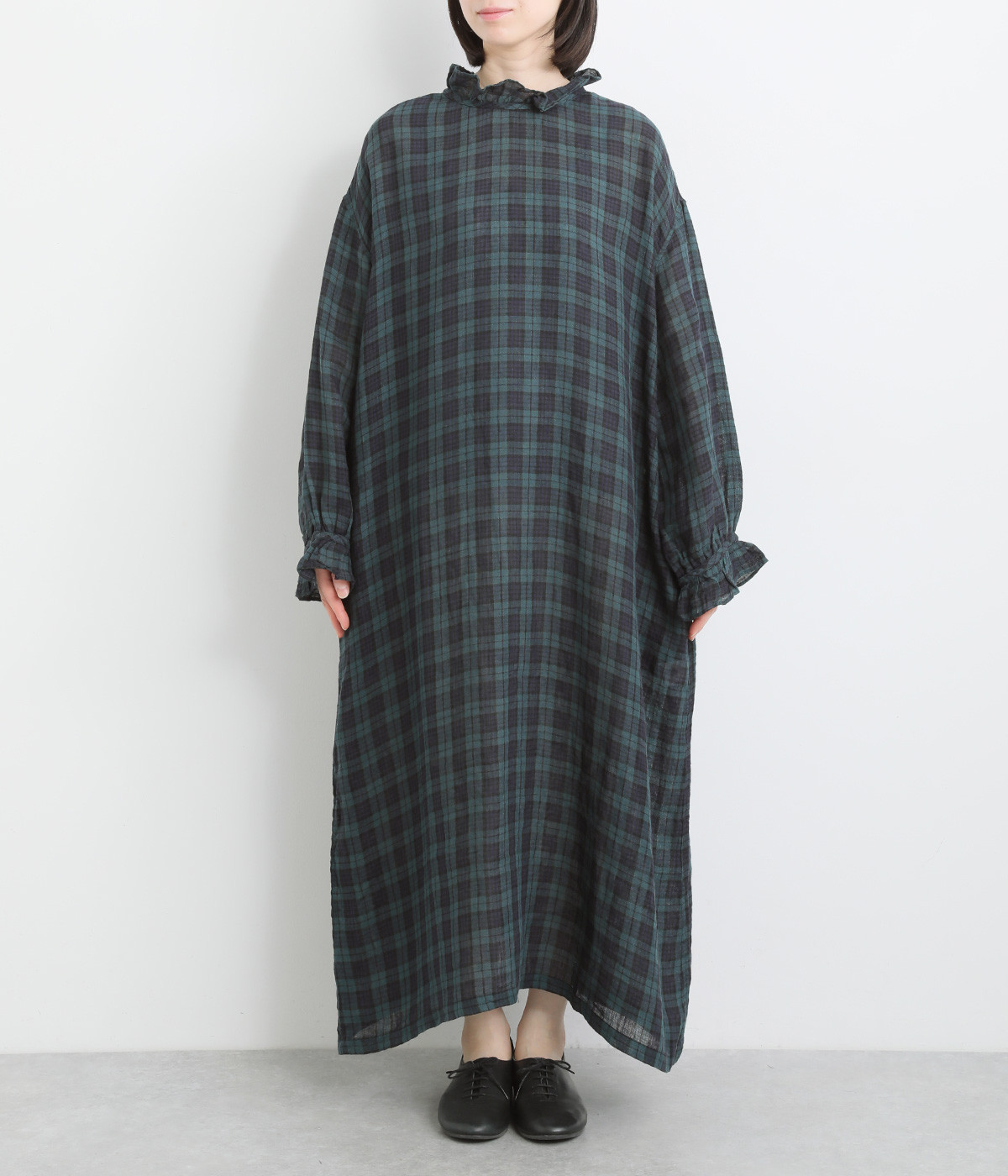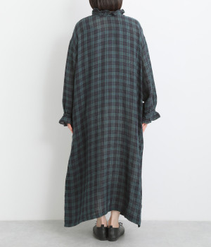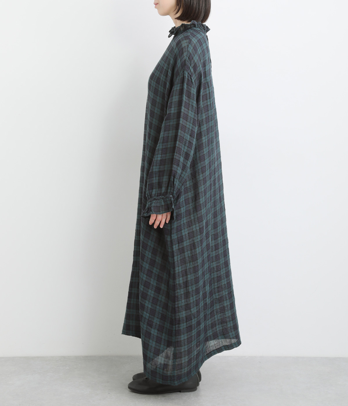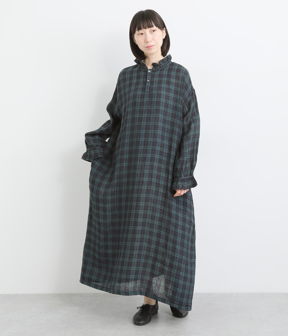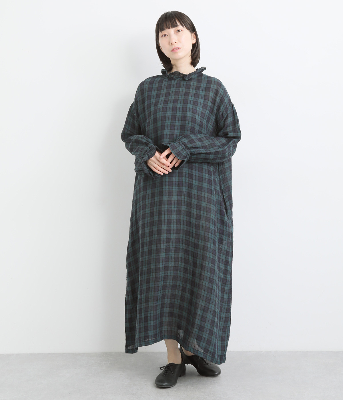 やわらかくも張りやコシ感のあるリネン素材を用いています。薄手で通気性も良く、ロングシーズン快適に着まわせる生地感です。ブラックウォッチのチェック柄が雰囲気のいい仕上がり。