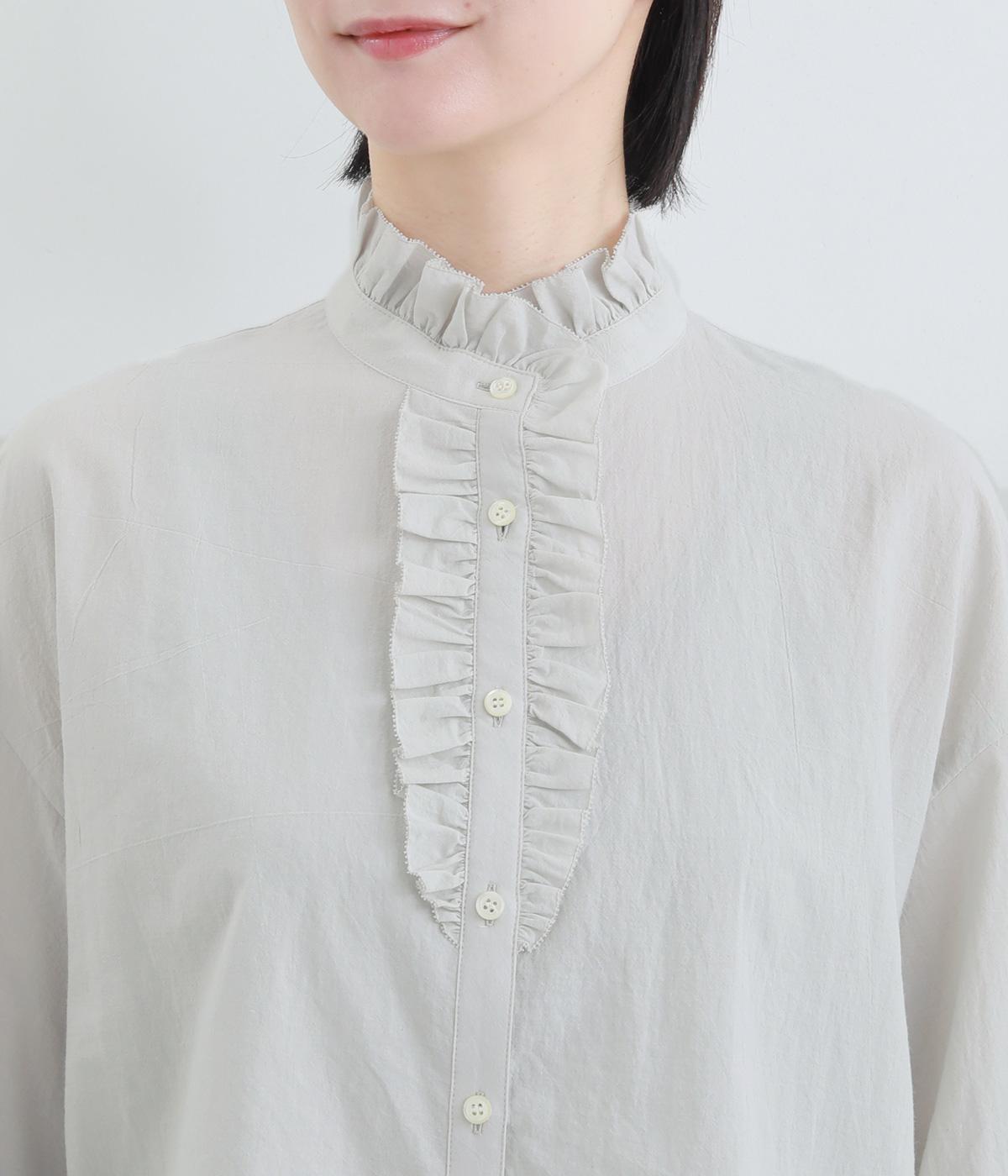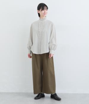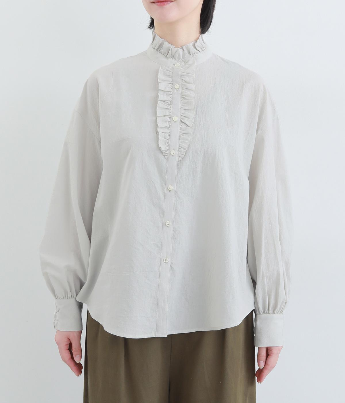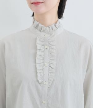 着心地のよさがポイントのフリルブラウス。襟と前立てのフリルが華やかさをもたらします。ニットやスウェットにインしてフリルをちらりとのぞかせたり、ジャンパースカートと合わせたりするのもおすすめです。