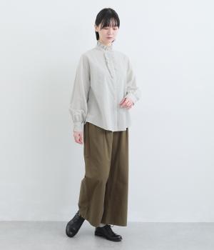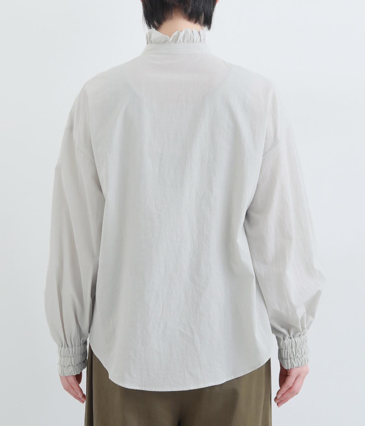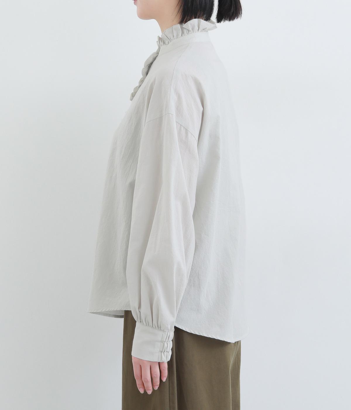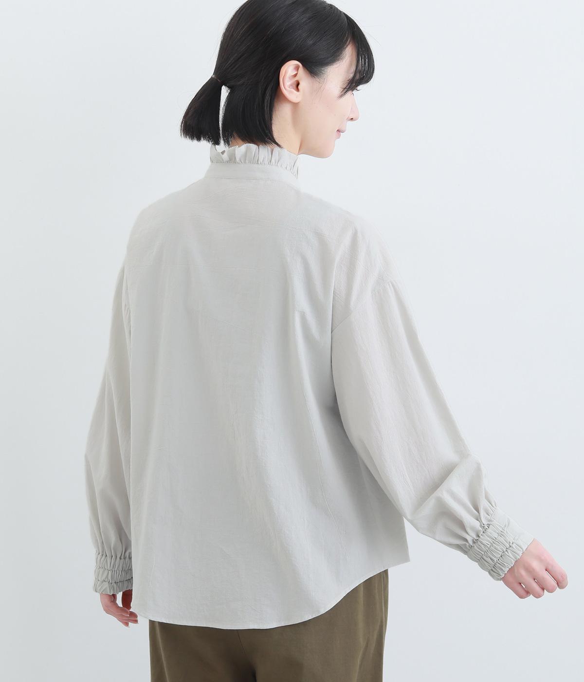 着心地のよさがポイントのフリルブラウス。襟と前立てのフリルが華やかさをもたらします。ニットやスウェットにインしてフリルをちらりとのぞかせたり、ジャンパースカートと合わせたりするのもおすすめです。