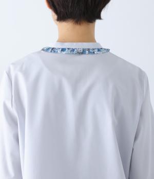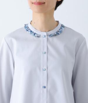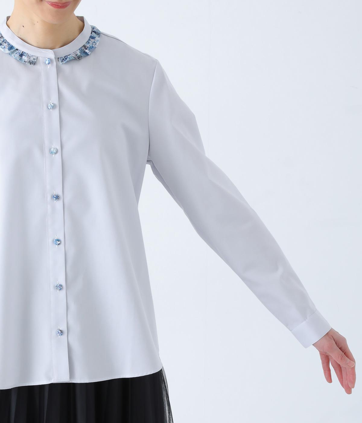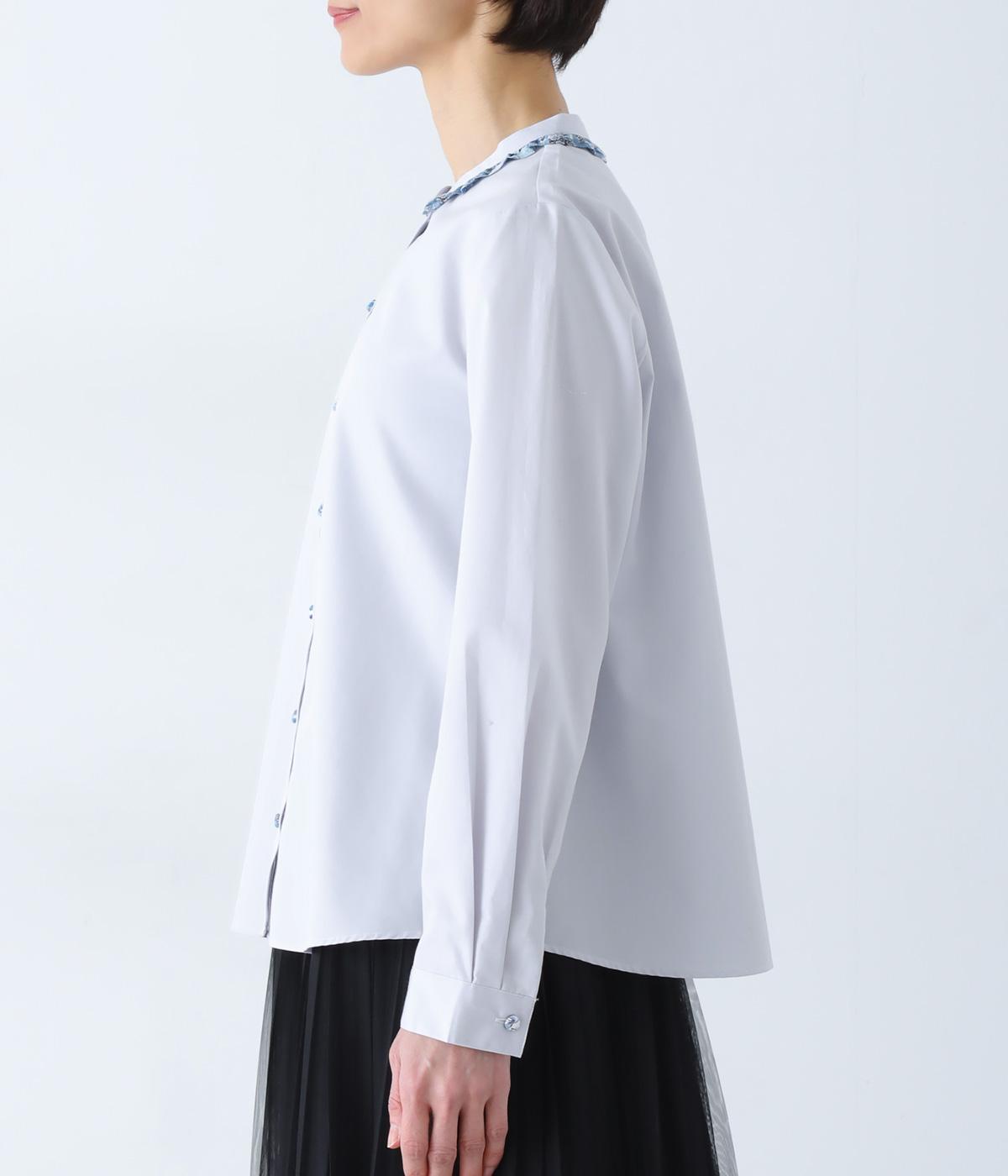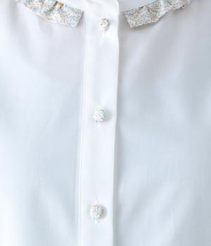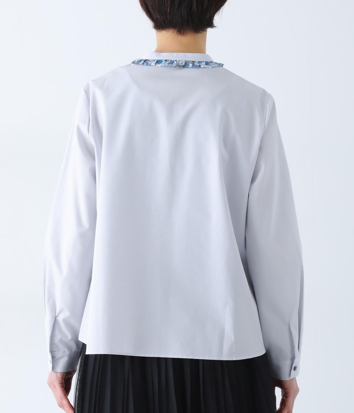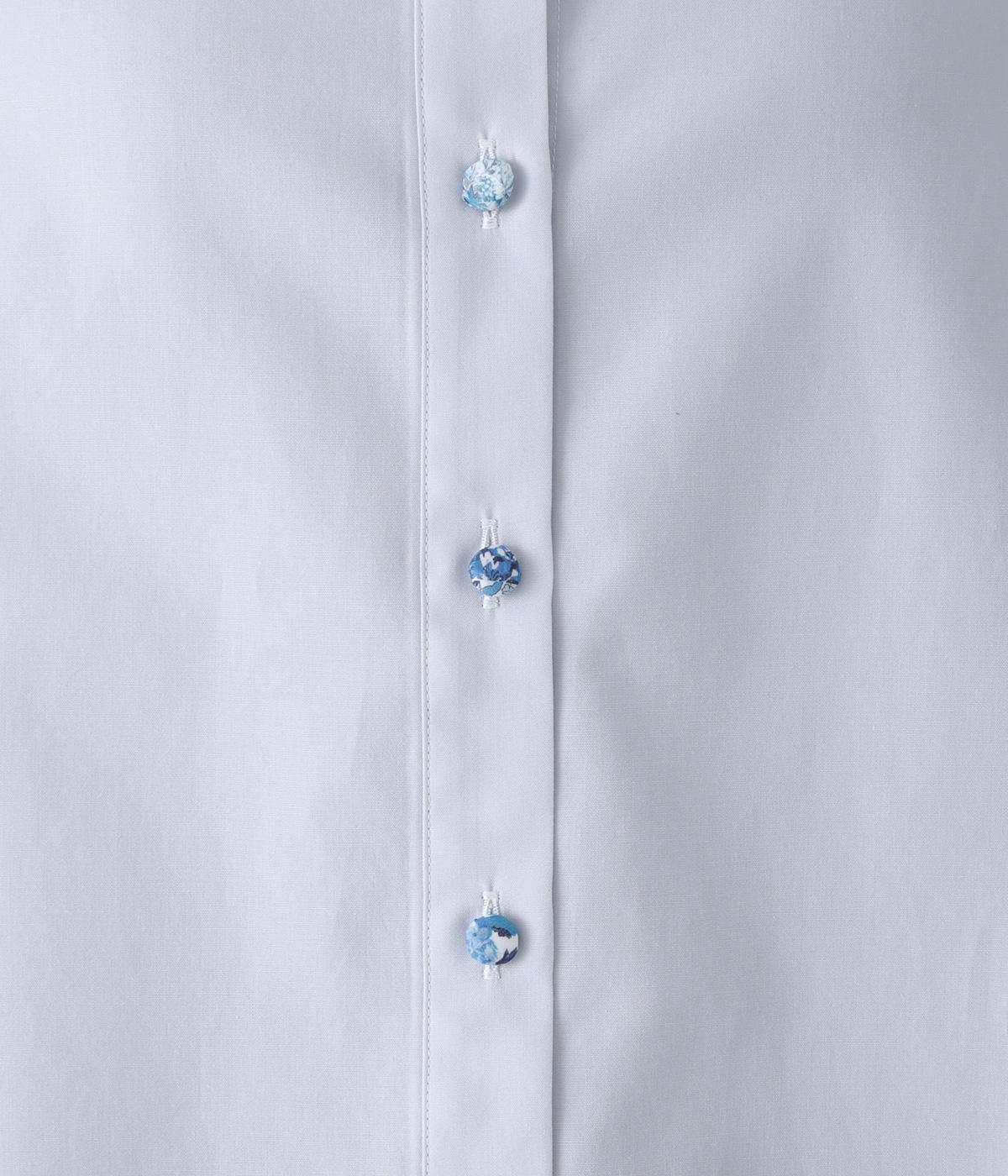 襟部分にあしらったLIBERTY生地のフリルがアクセントのバンドカラーシャツです。同じくLIBERTY柄のくるみボタンがころんとかわいらしさを添えています。シンプルながらさりげなく個性が光る一枚です。