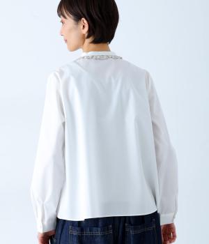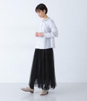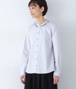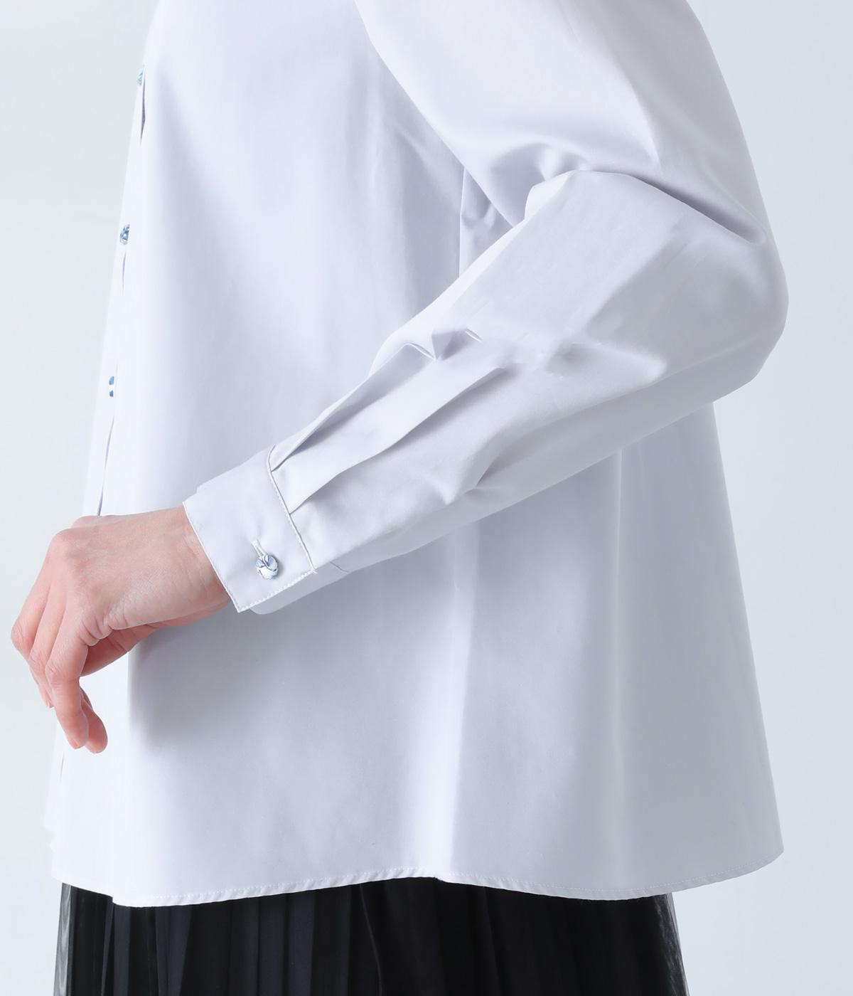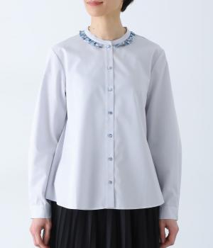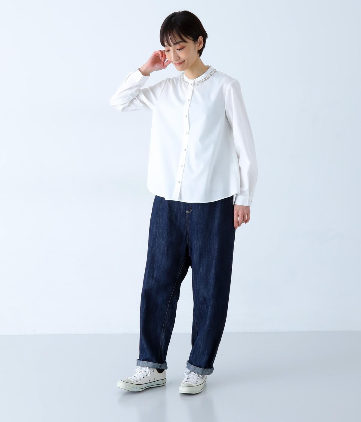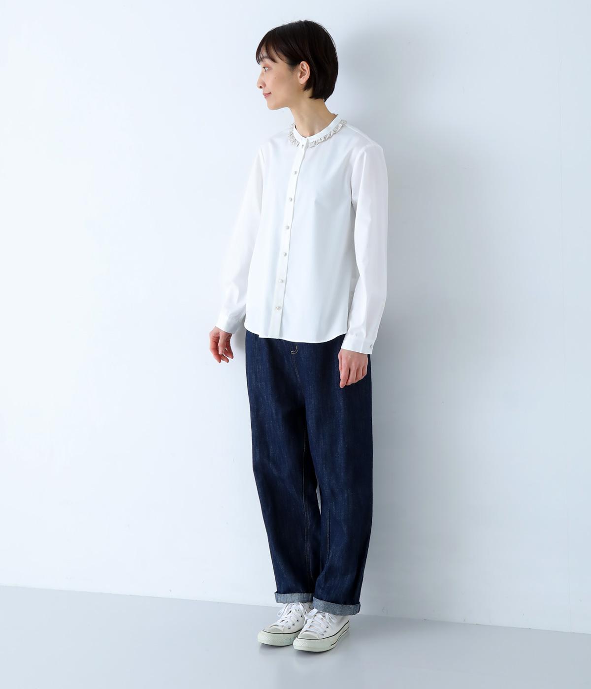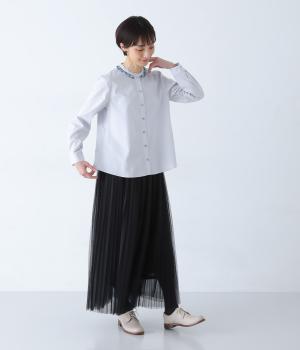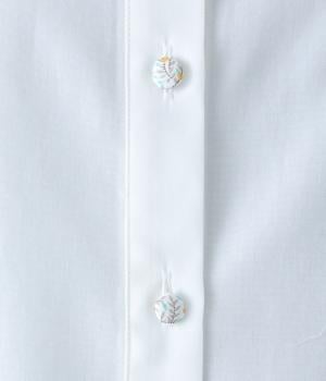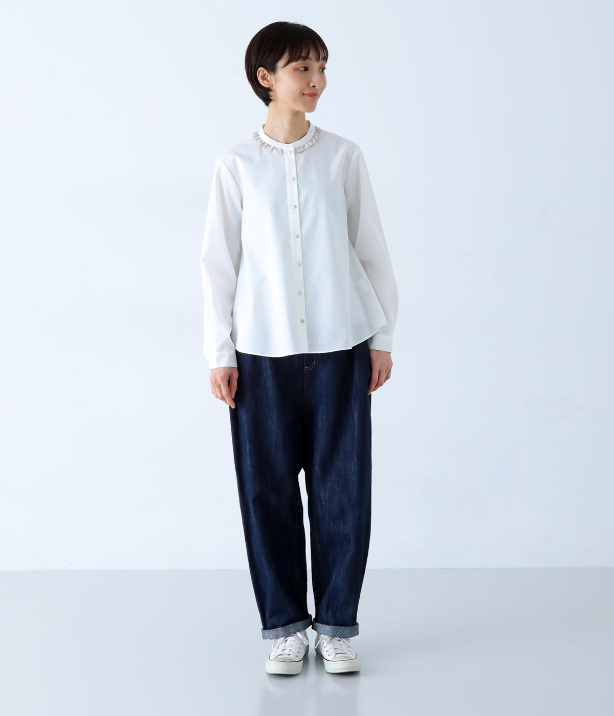 襟部分にあしらったLIBERTY生地のフリルがアクセントのバンドカラーシャツです。同じくLIBERTY柄のくるみボタンがころんとかわいらしさを添えています。シンプルながらさりげなく個性が光る一枚です。