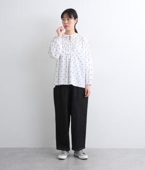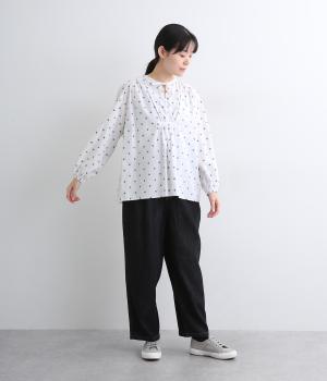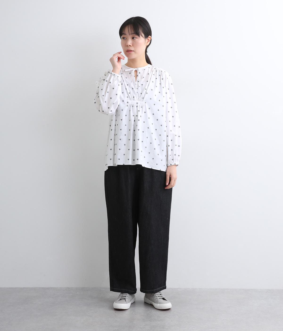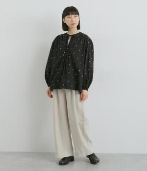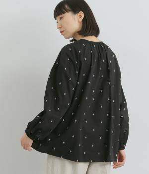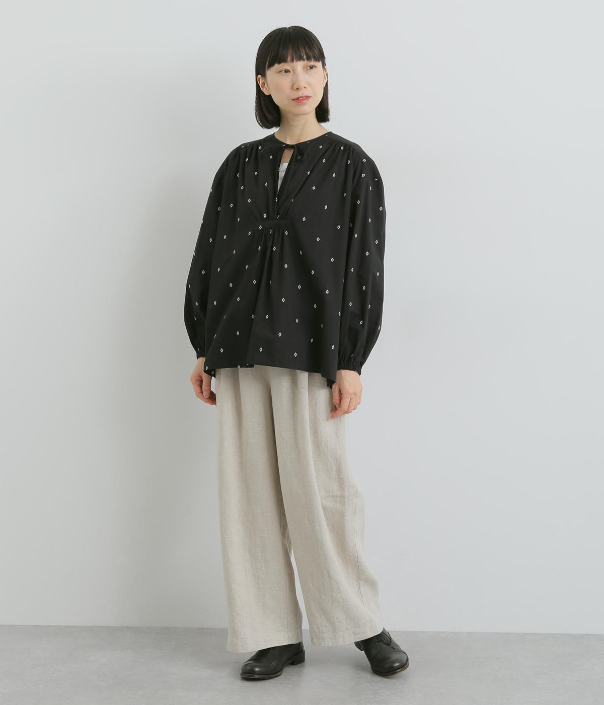 民族衣装からインスパイアされたカフタンブラウス。フロントのギャザーや襟ぐりのひもで表情豊かに仕上げました。袖口にはゴム入りで、袖まくりでニュアンスをつけることも可能。ふんわり広がるシルエットがかわいいです。