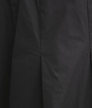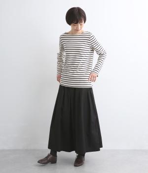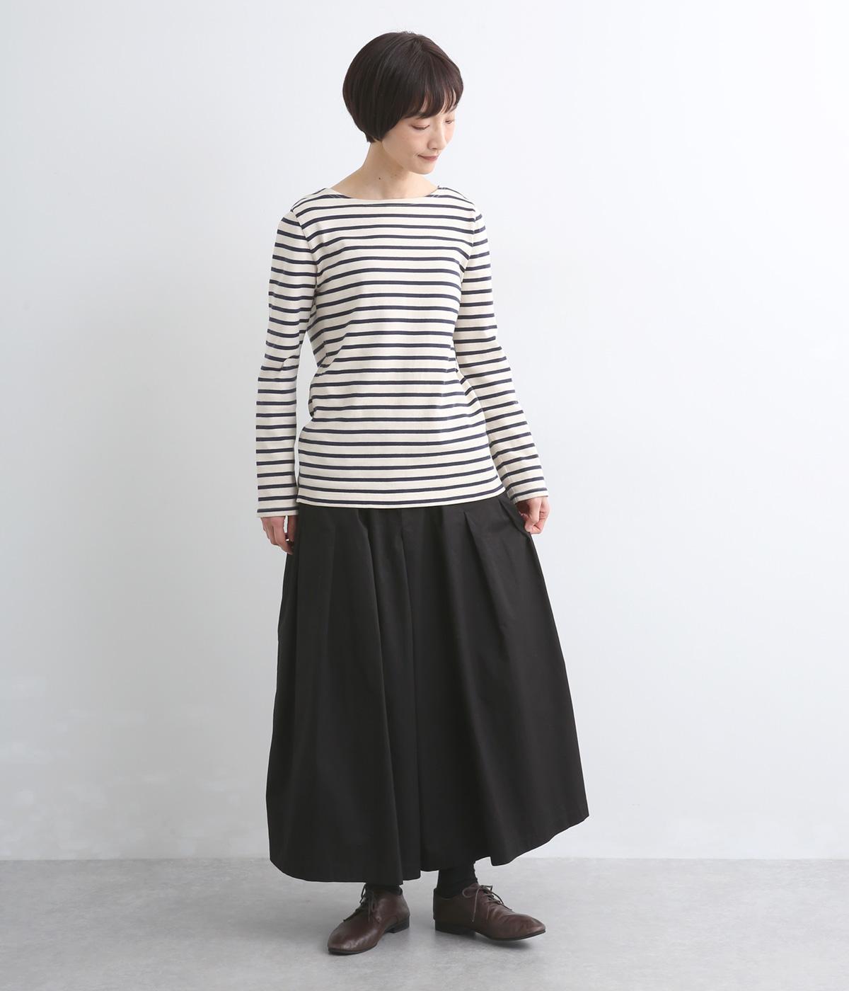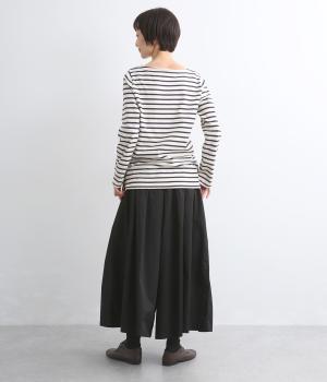 スカート見えするフレア感が特徴的なワイドパンツは、タックを入れて腰まわりはすっきりおさえています。生地感によって分量のわりに軽やかに穿け、足元がすっきり見える丈感もポイント。ウエストはフィット感のいい総ゴムに内紐を通しました。