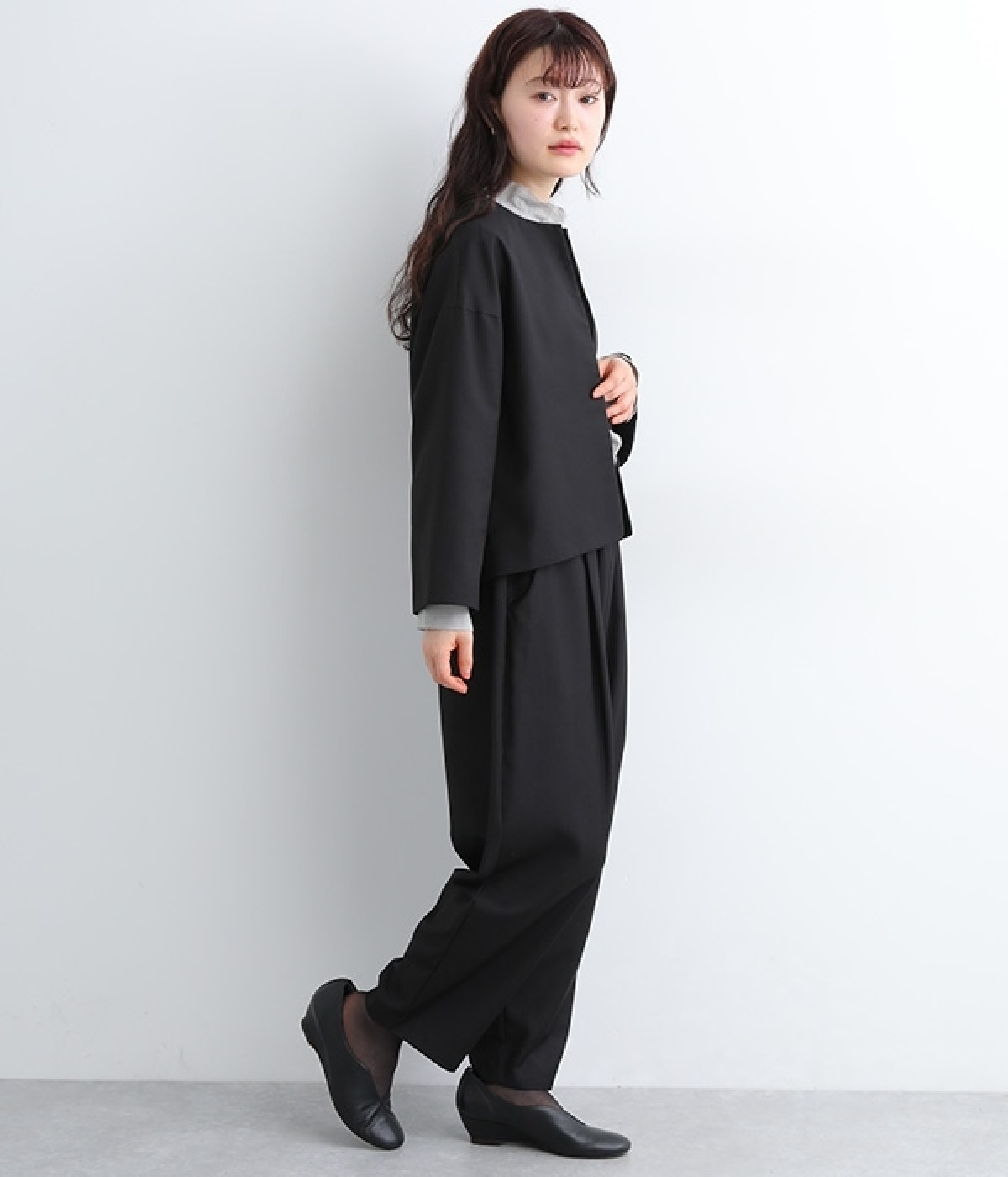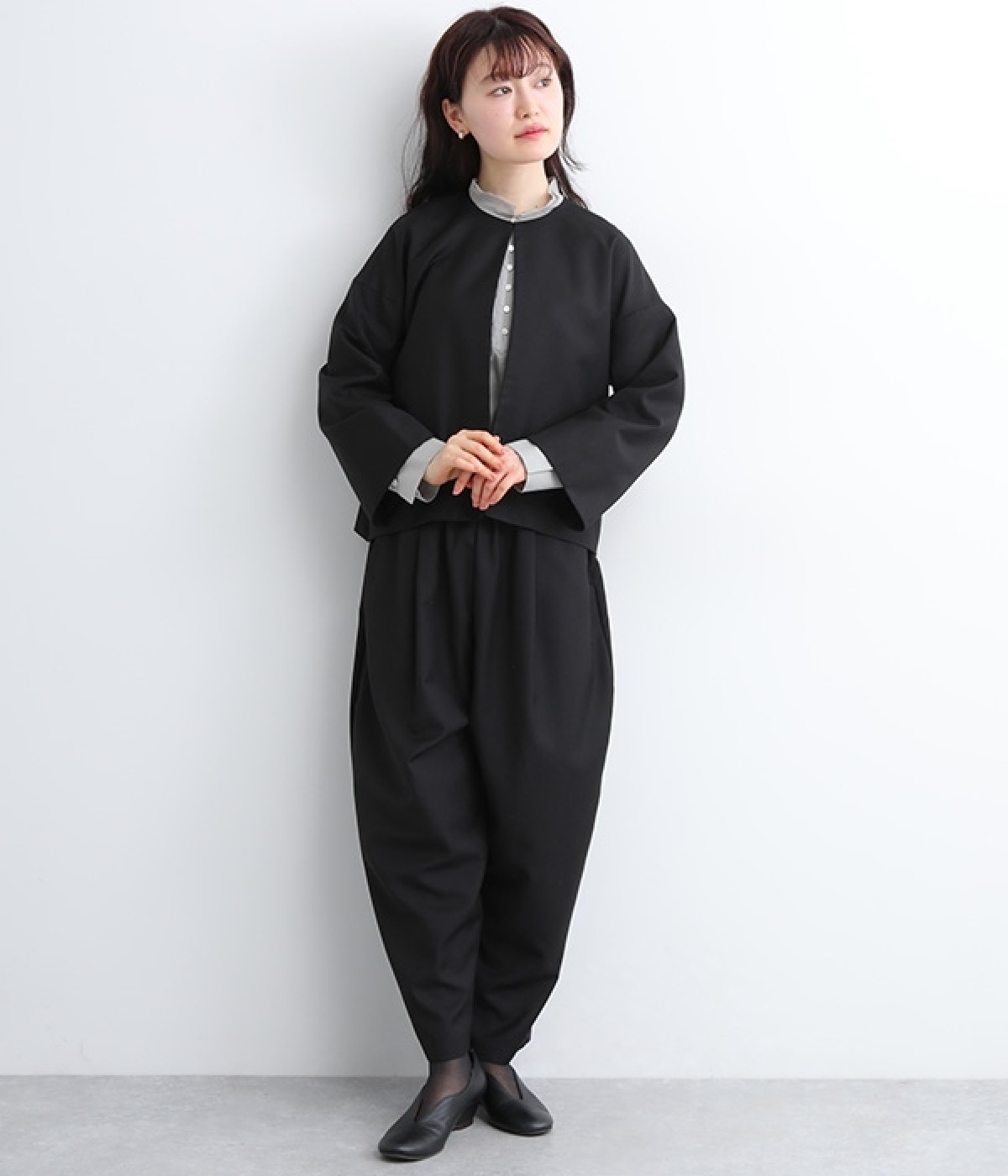 お呼ばれのときの装いにも着用できる、生地表面のつやめきと豊かなドレープが上品なジャケット。ポリエステル混でシワになりにくく、取り扱いのイージーさも愛用できるポイントです。カフス裏にはドット状のレースをあしらい、折り返すと手元に控えめな愛らしさも。フロントの開きはトップのホックひとつのみにとどめ、インナーがさりげなくのぞく抜けのあるデザインです。生地のすべりを促すなめらかな裏地が、脱ぎ着の際に役立ちます。