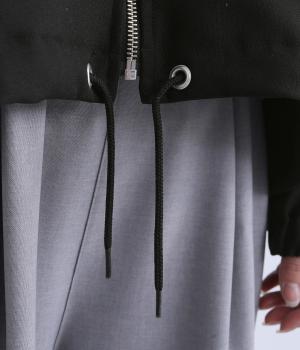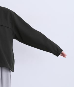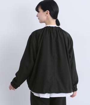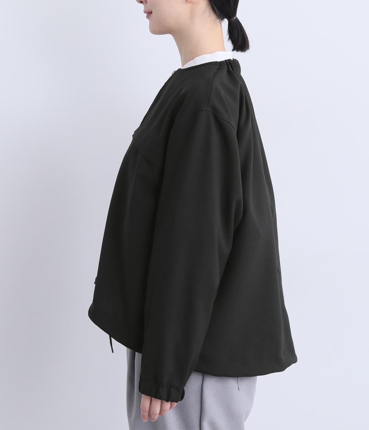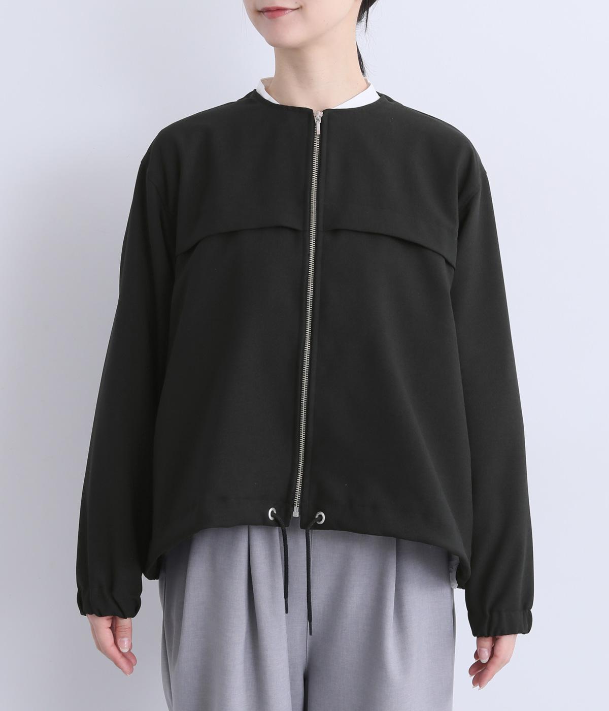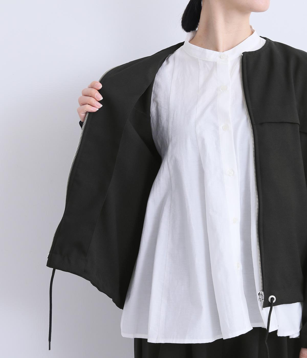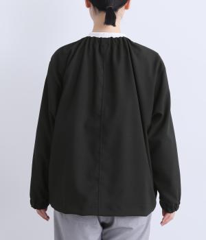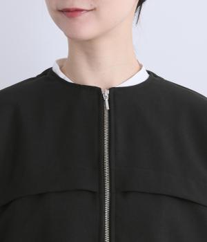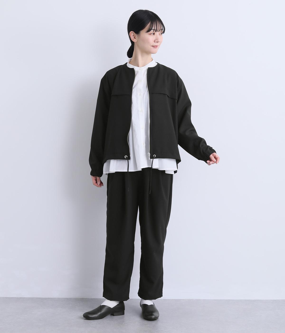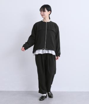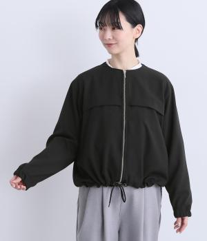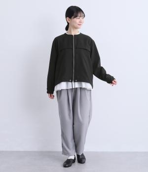 カジュアルにもきれいめにも着まわせるジップタイプのジャケットです。ノーカラーですっきり見せ、後ろ襟ぐりはゴムギャザーでニュアンスを。裾は紐できゅっとしぼったりアレンジも◎。袖口ゴムでたくし上げもイージーです。