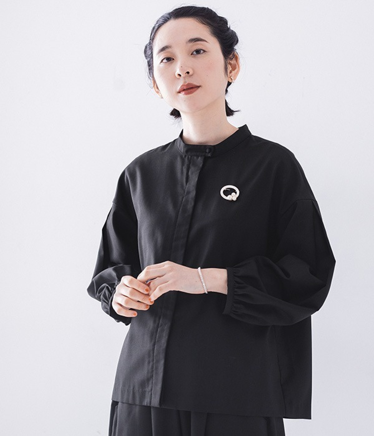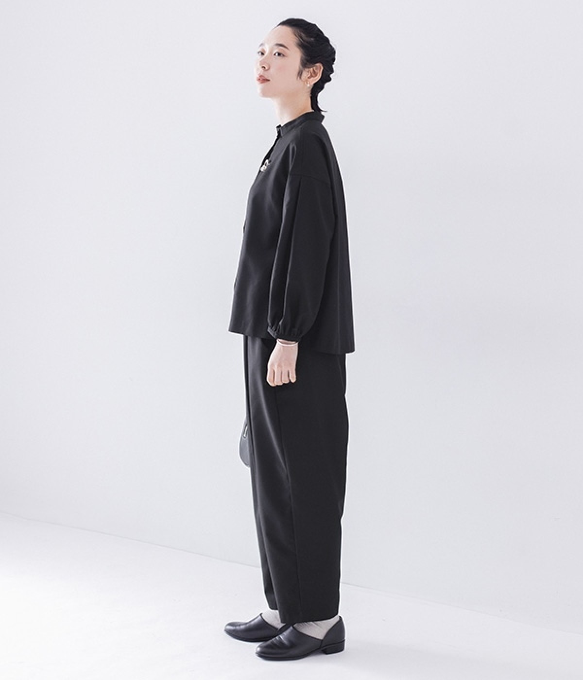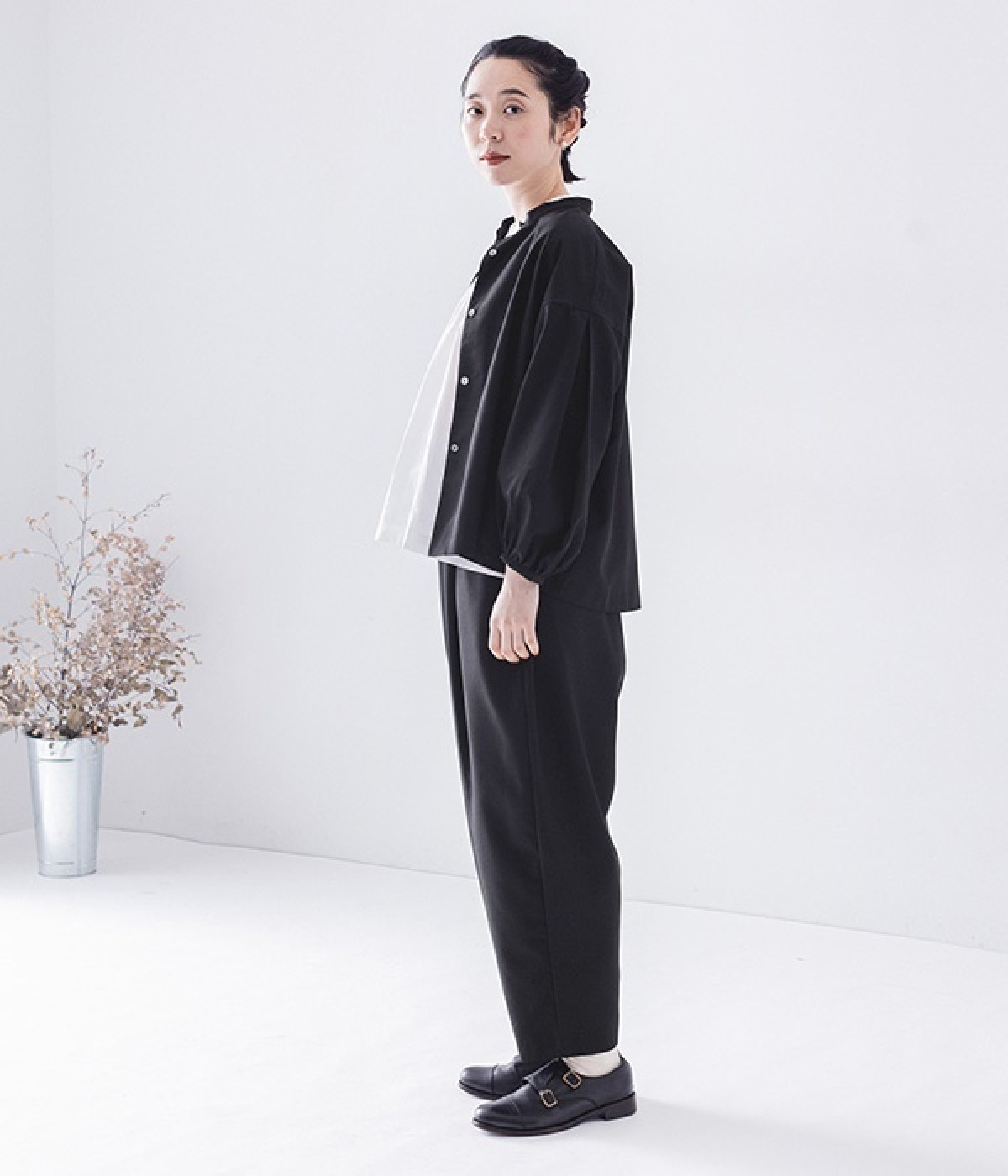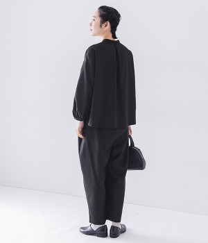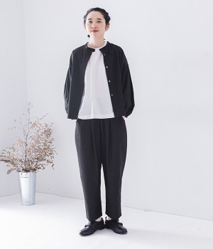 ボリュームスリーブのジャケットとパンツのセットアップ。ジャケットにしては軽めの素材なので、スタンドカラーブラウスのようにも着ていただけます。比翼あきできちんと見せつつ、ふんわりとした袖でかわいらしさも演出。後ろ身頃の大きくとられたタックでバックスタイルに見どころをつくりました。パンツはタックで腰まわりをゆったりとったリラクシングなはき心地。ストンときれいなシルエットは装いに気品をプラスしてくれます。