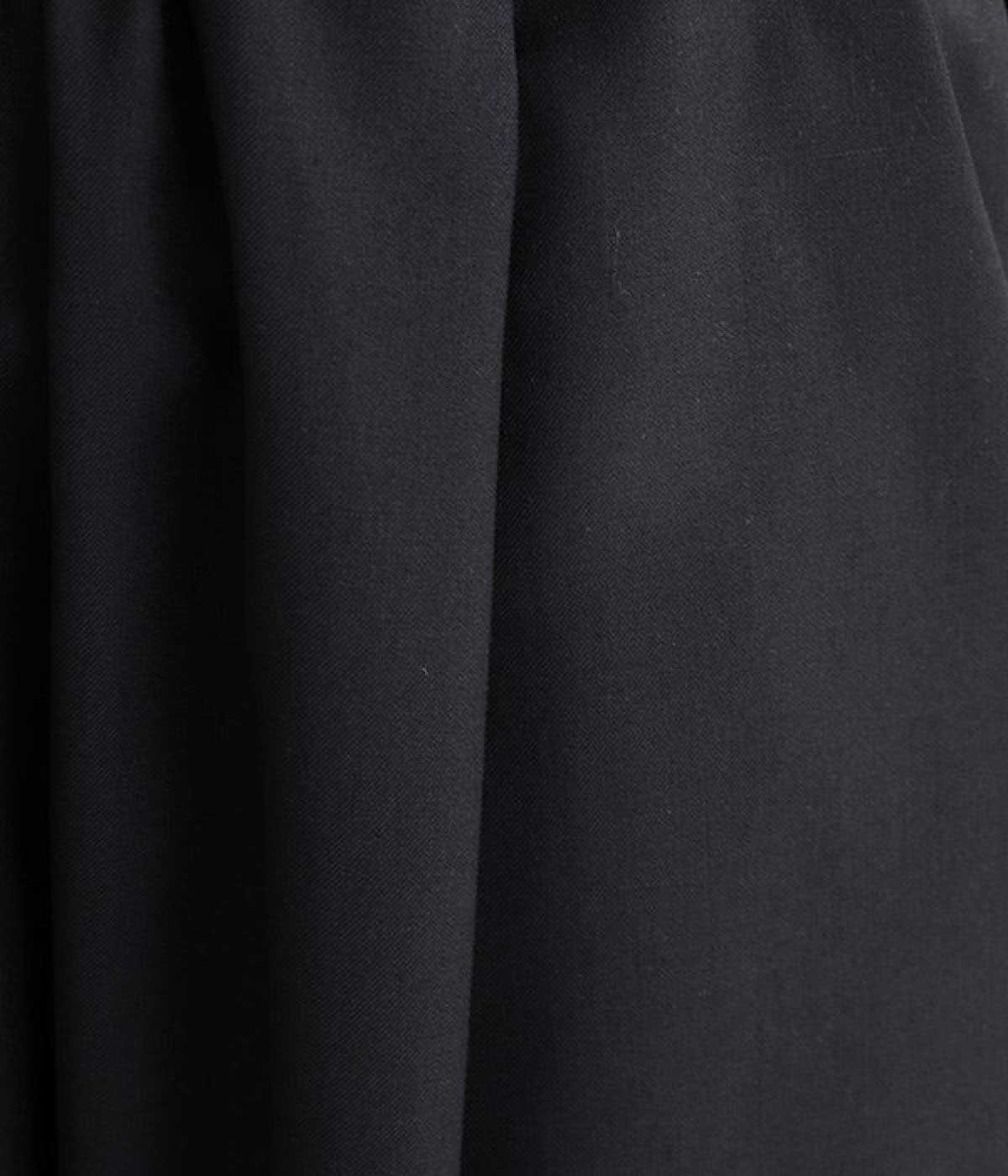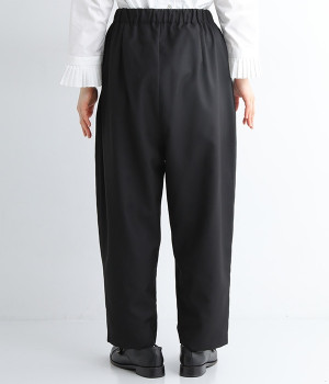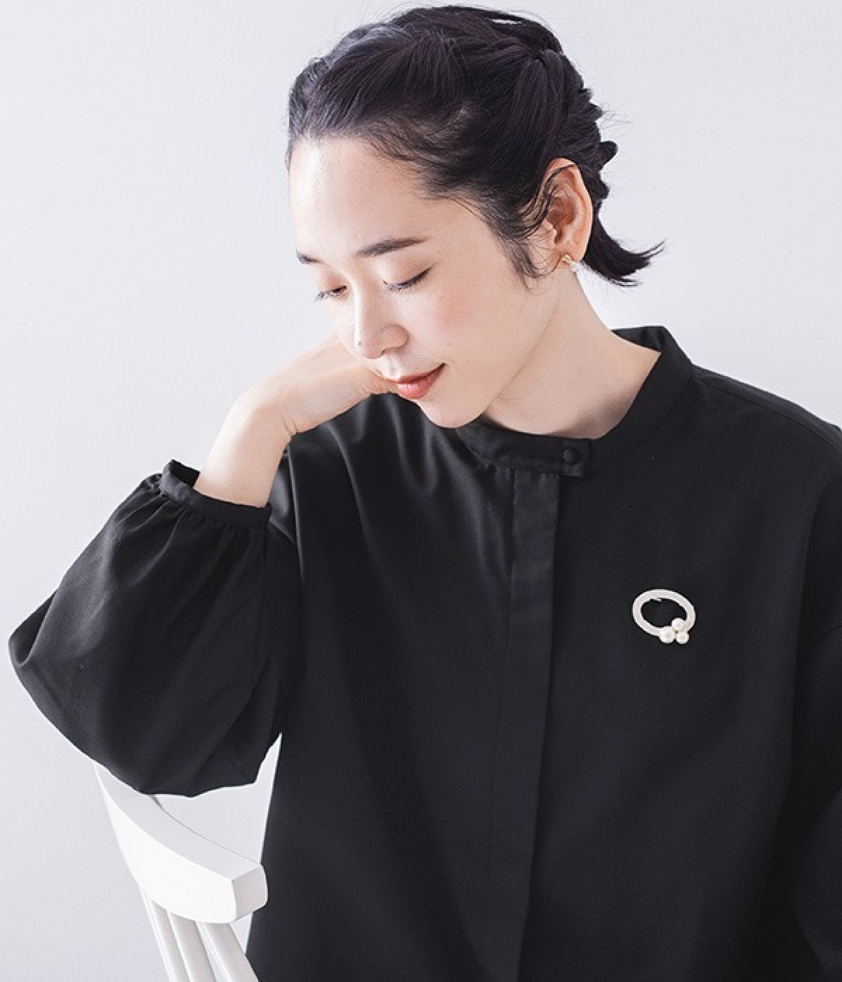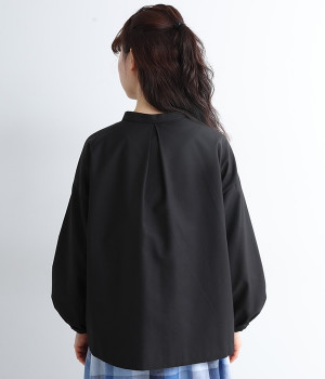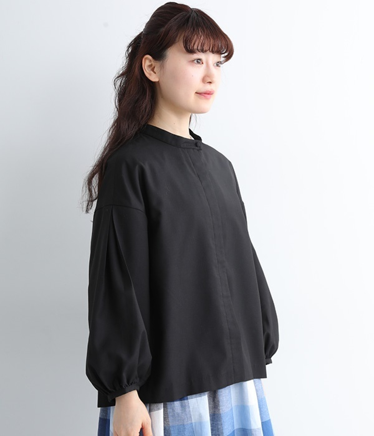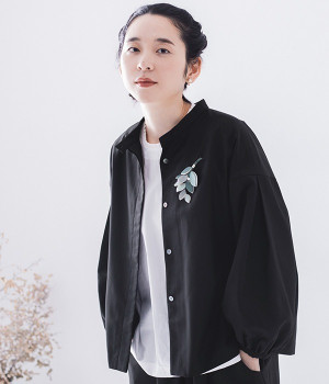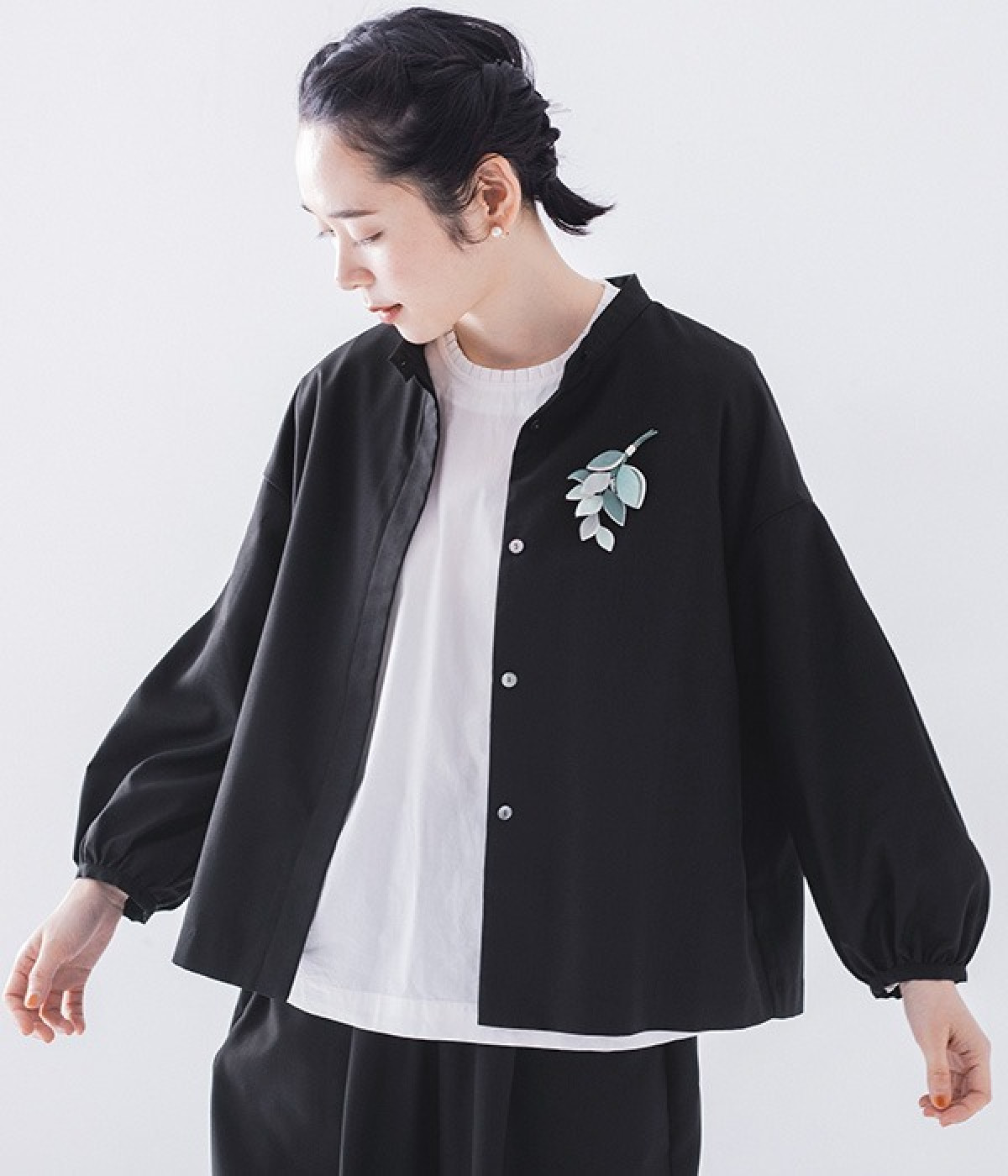 ボリュームスリーブのジャケットとパンツのセットアップ。ジャケットにしては軽めの素材なので、スタンドカラーブラウスのようにも着ていただけます。比翼あきできちんと見せつつ、ふんわりとした袖でかわいらしさも演出。後ろ身頃の大きくとられたタックでバックスタイルに見どころをつくりました。パンツはタックで腰まわりをゆったりとったリラクシングなはき心地。ストンときれいなシルエットは装いに気品をプラスしてくれます。