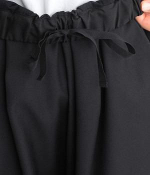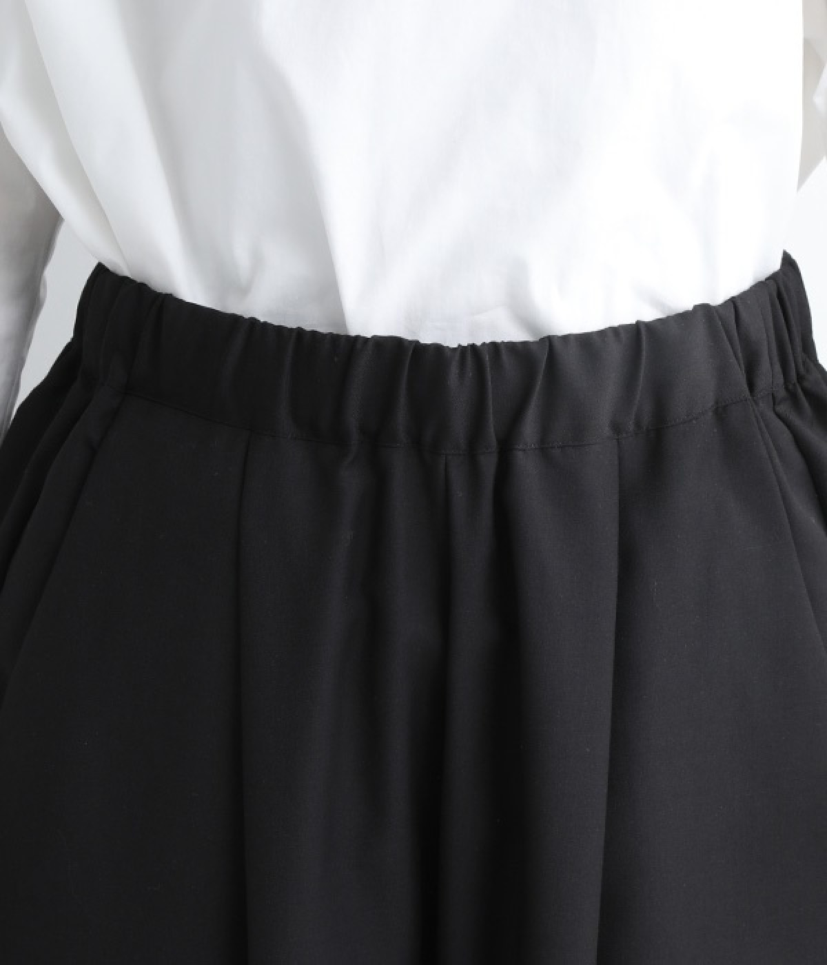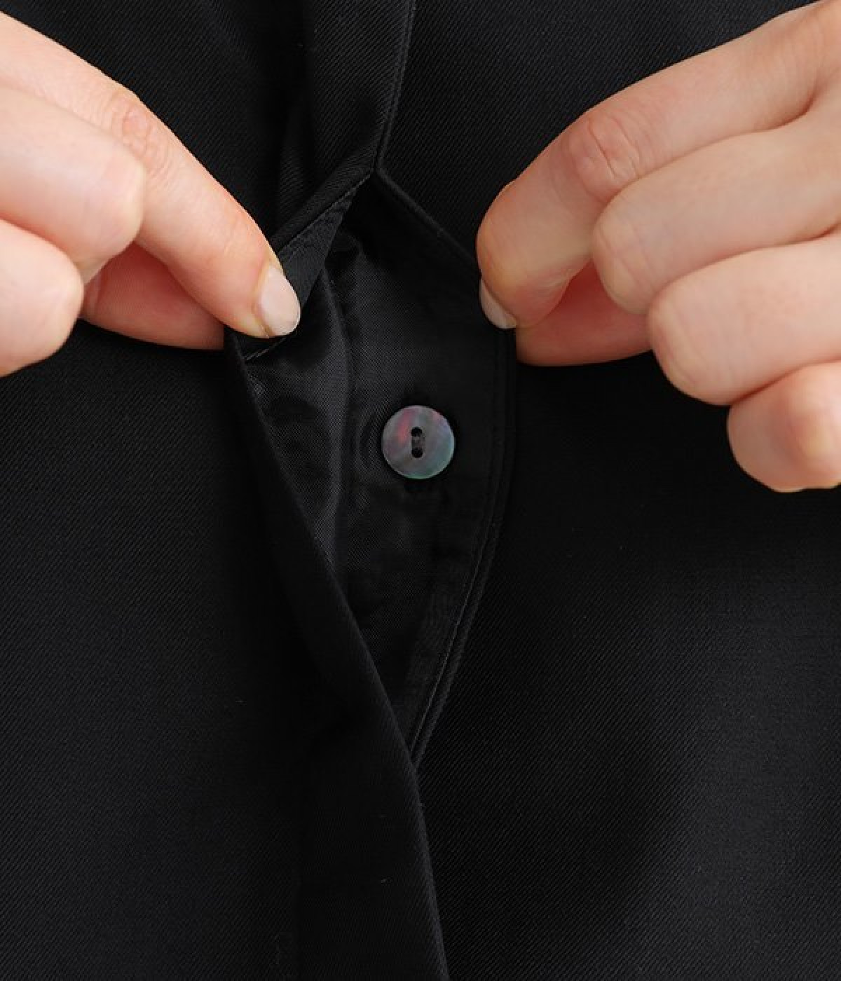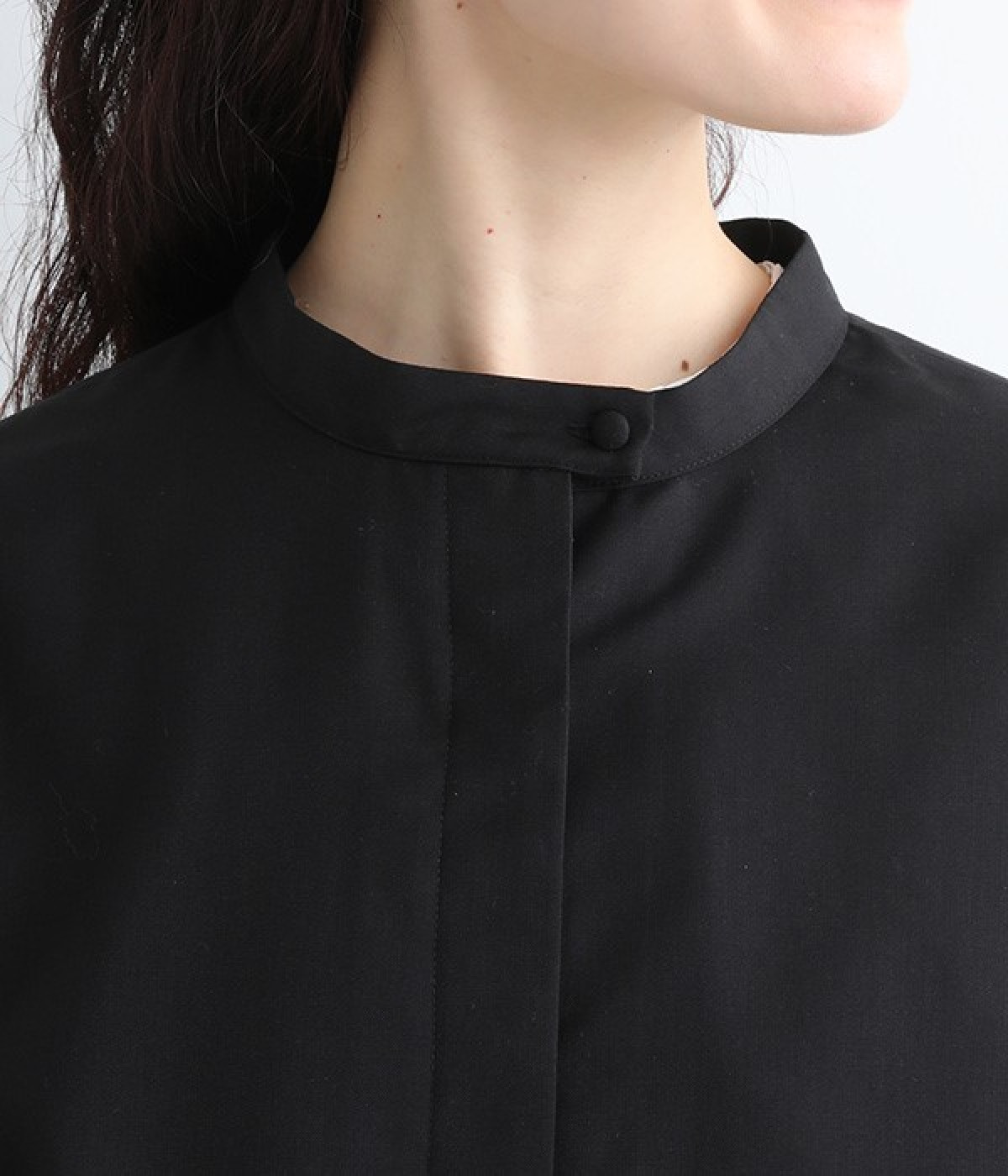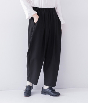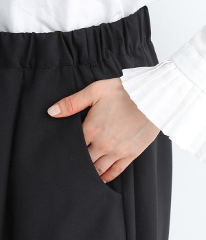 ボリュームスリーブのジャケットとパンツのセットアップ。ジャケットにしては軽めの素材なので、スタンドカラーブラウスのようにも着ていただけます。比翼あきできちんと見せつつ、ふんわりとした袖でかわいらしさも演出。後ろ身頃の大きくとられたタックでバックスタイルに見どころをつくりました。パンツはタックで腰まわりをゆったりとったリラクシングなはき心地。ストンときれいなシルエットは装いに気品をプラスしてくれます。