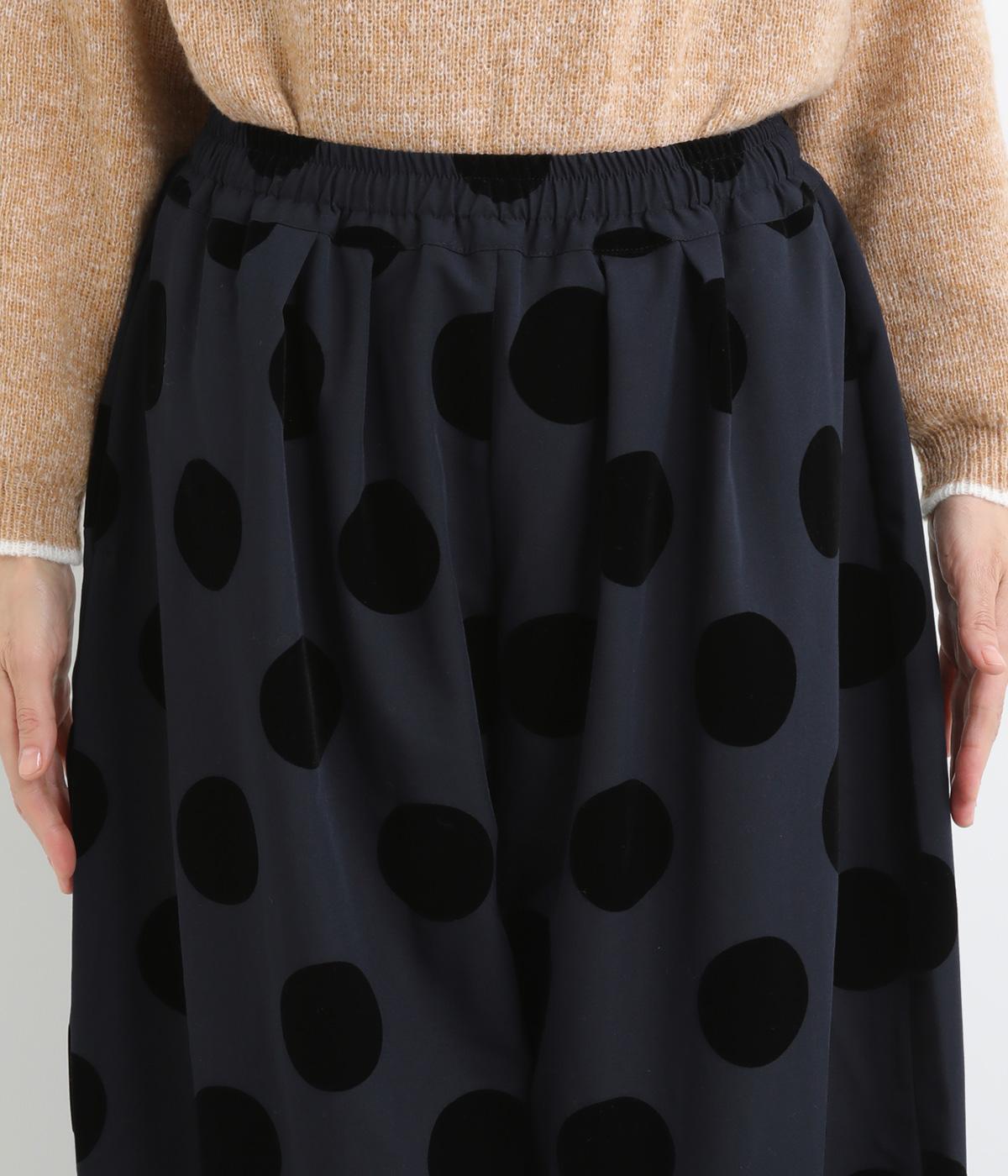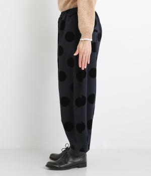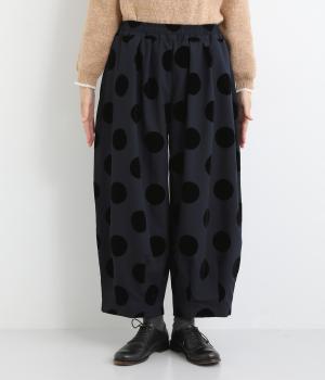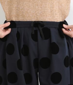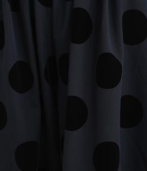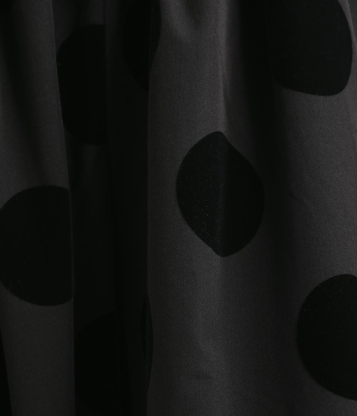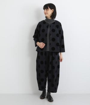 あたたかみと立体感、華やかさを印象づけてくれるドットのフロッキープリント生地を使用。レーヨン混で品よく仕上げ、ポリエステルをベースにしているので重厚感のある見た目ながらも軽やかです。