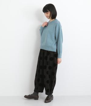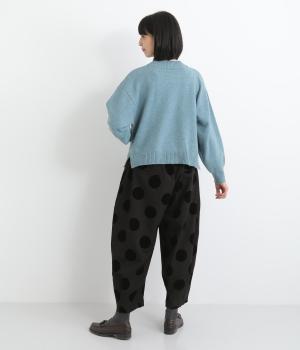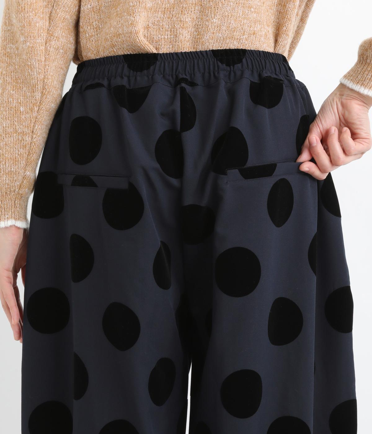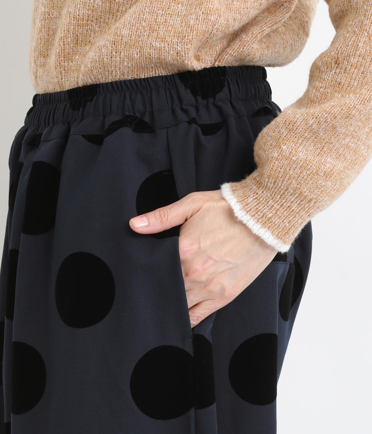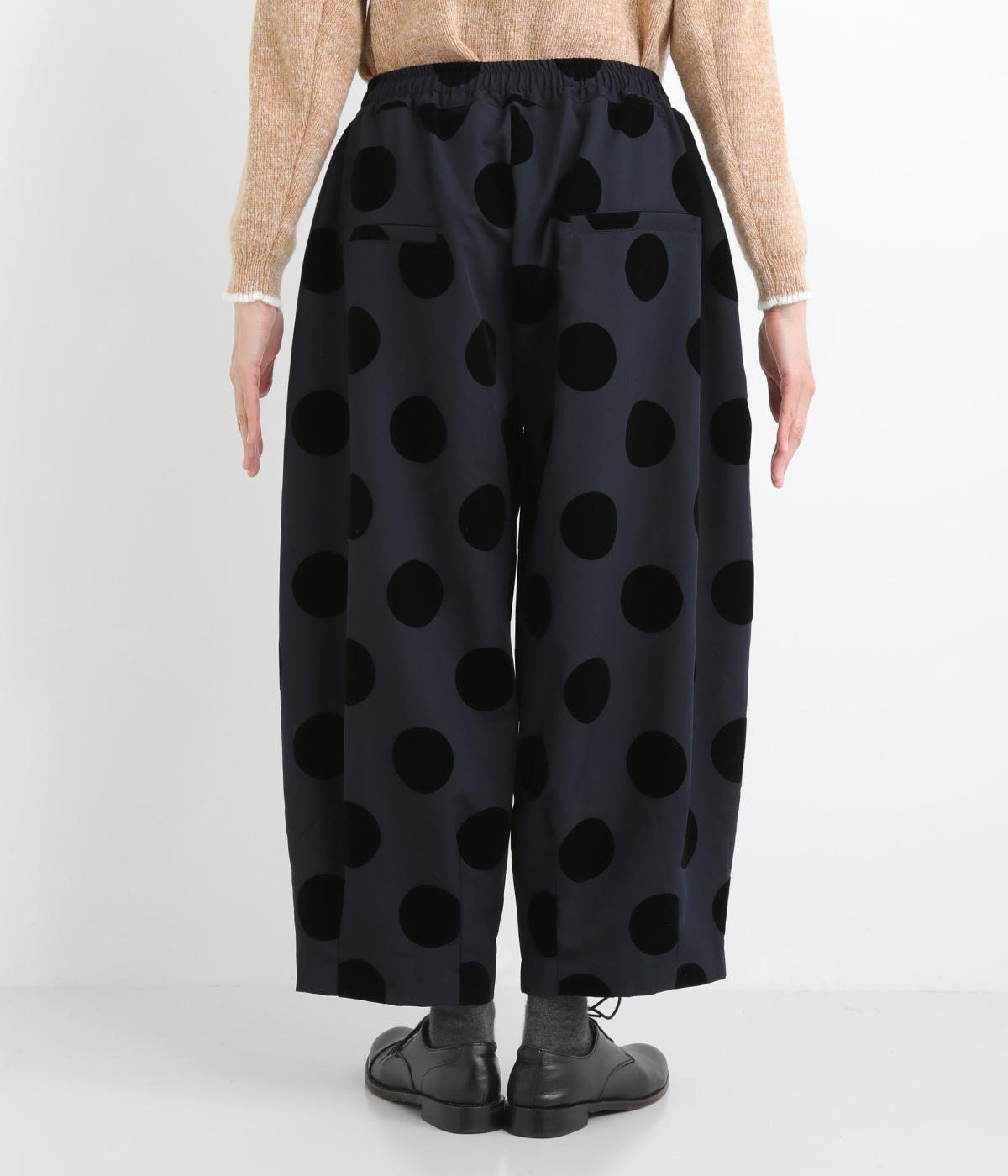 あたたかみと立体感、華やかさを印象づけてくれるドットのフロッキープリント生地を使用。レーヨン混で品よく仕上げ、ポリエステルをベースにしているので重厚感のある見た目ながらも軽やかです。