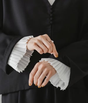 ネックラインとカフスを飾るプリーツが品よくクラシカル