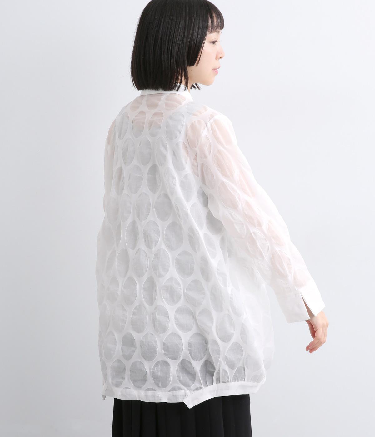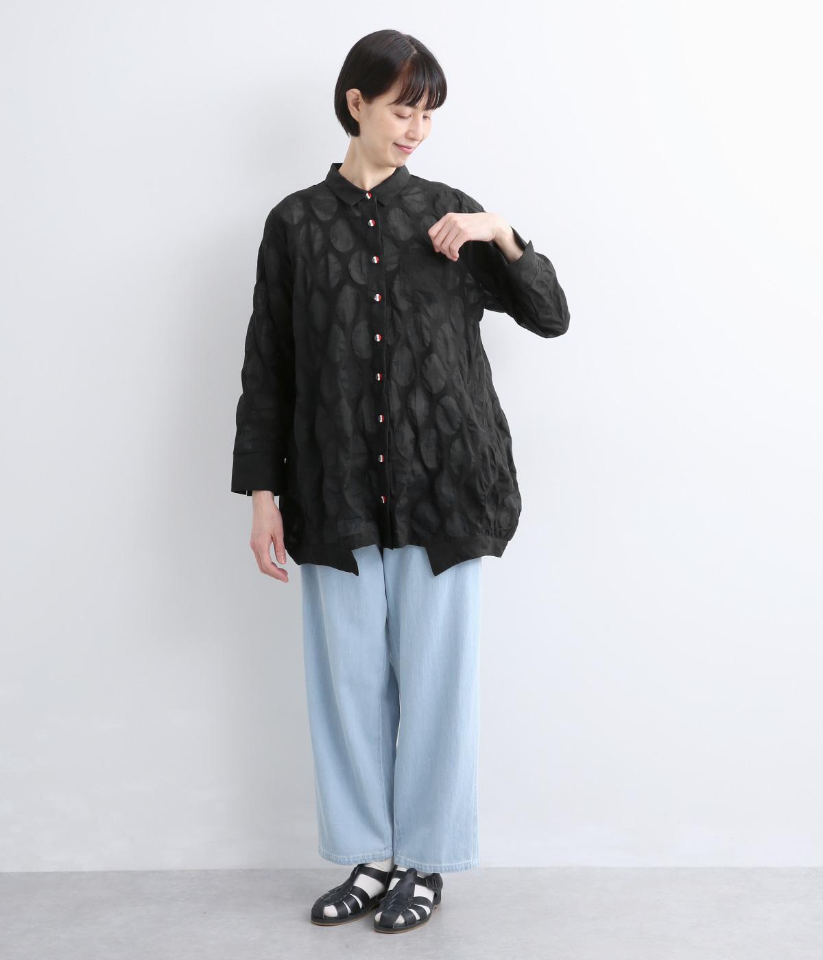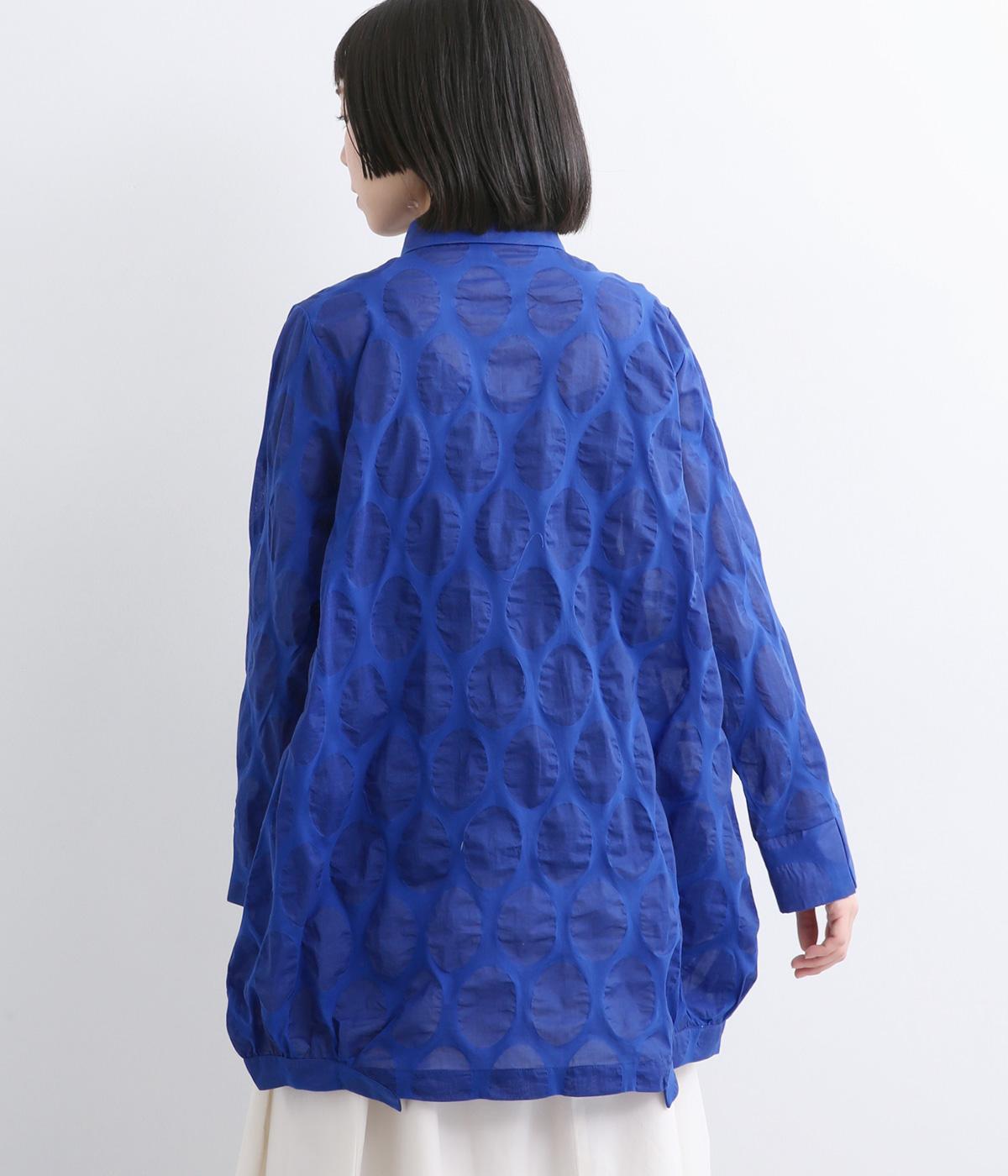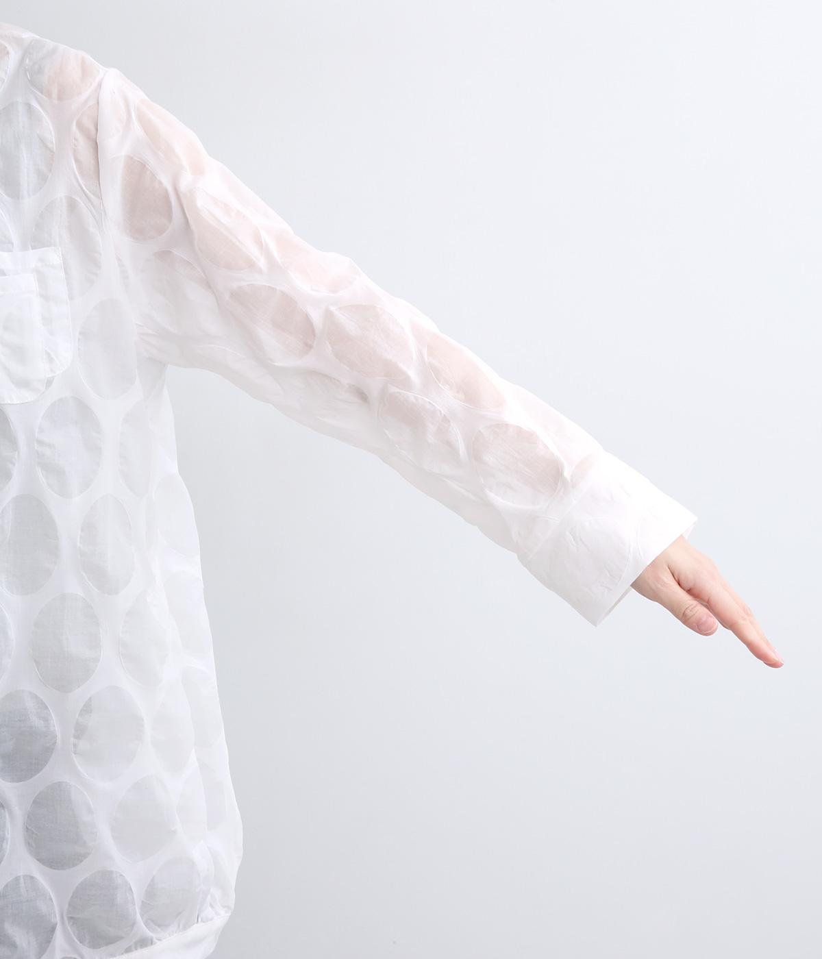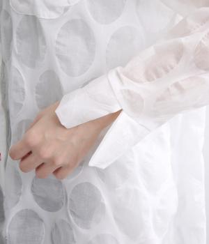 コットン生地に透け感のあるドットをあしらい、軽やかで清涼感のある風合いに仕上げています。肌ざわりがよく、快適に着られる素材感です。