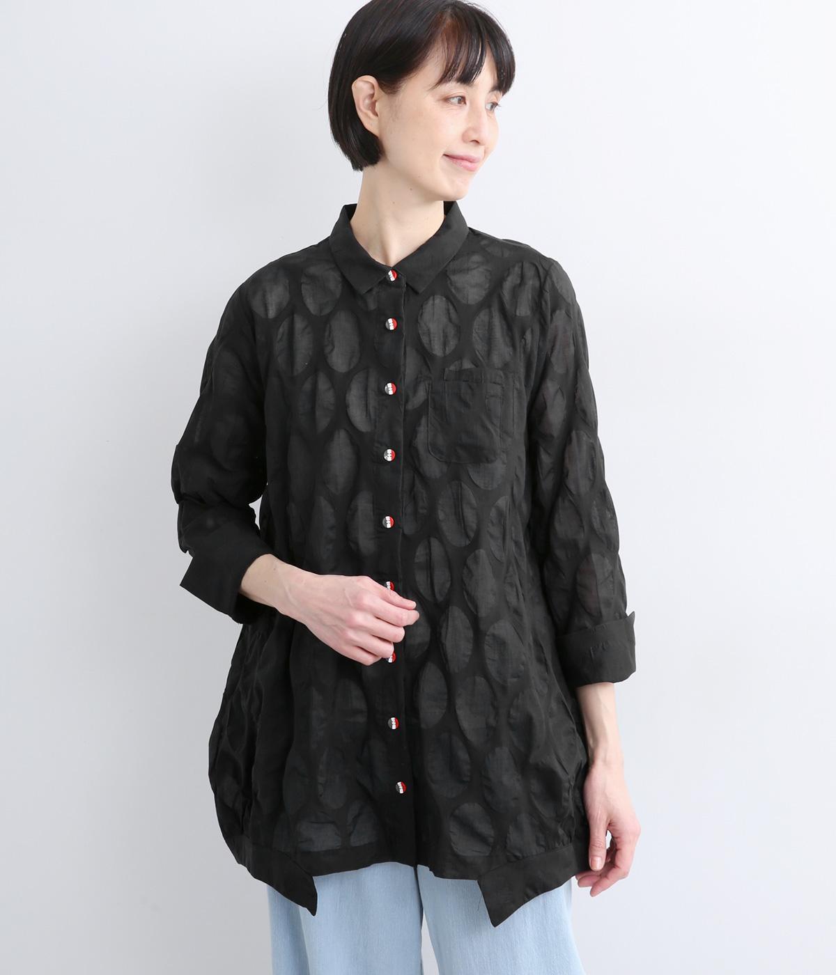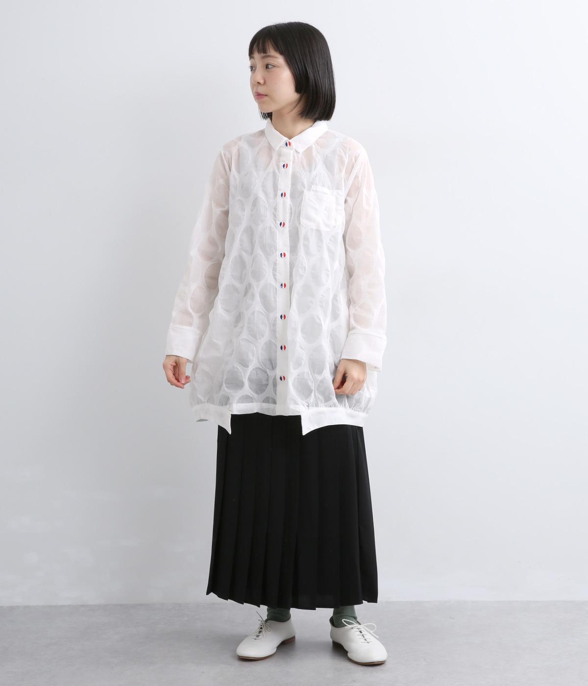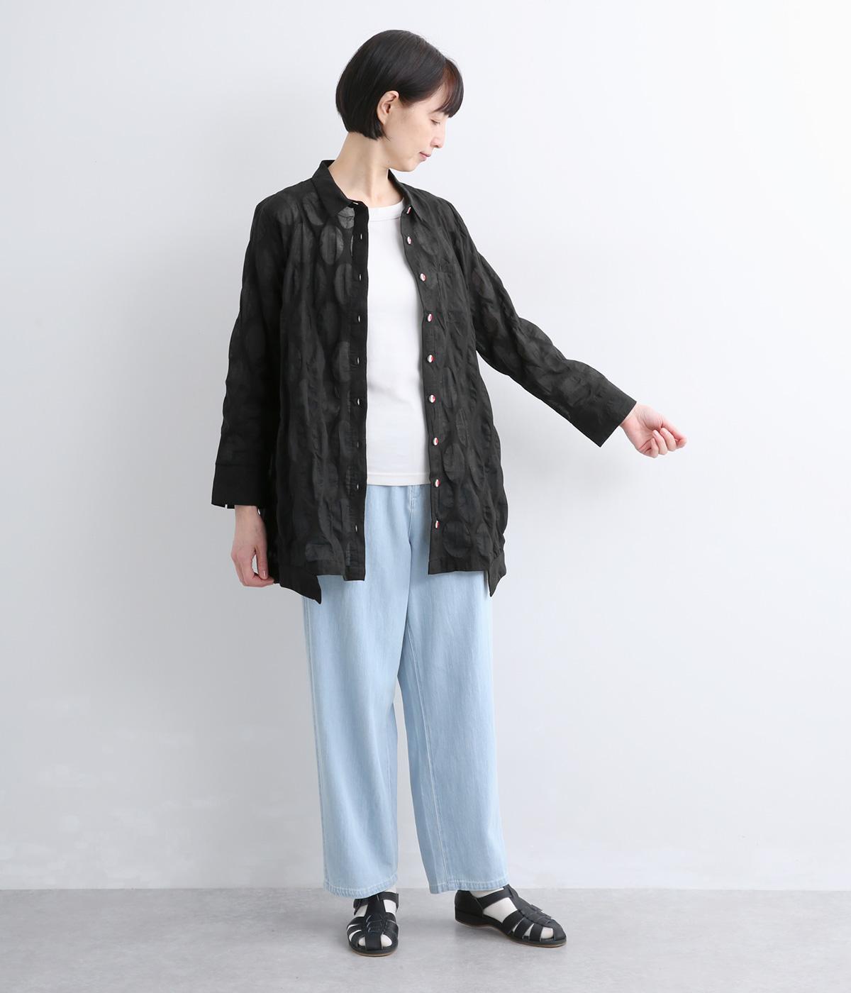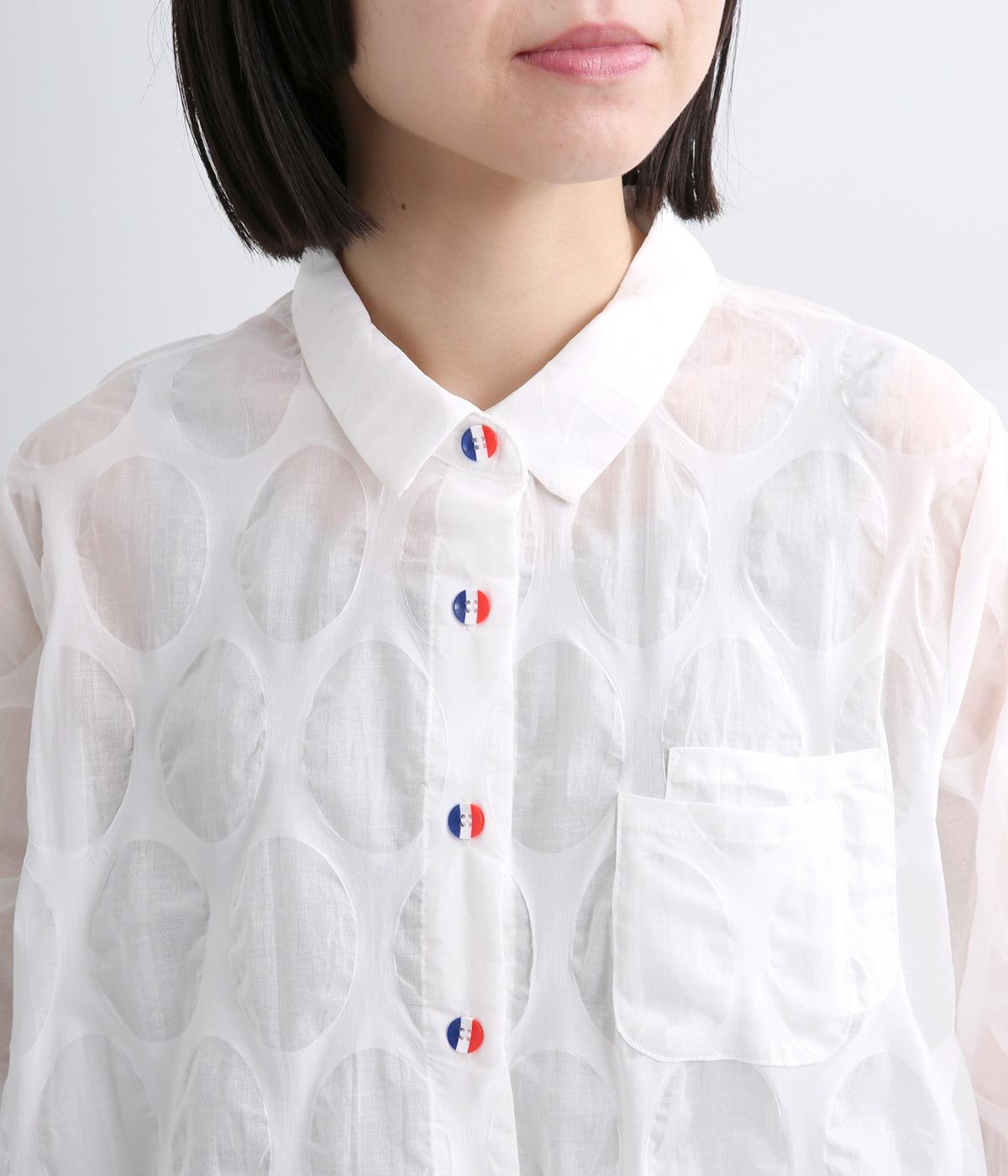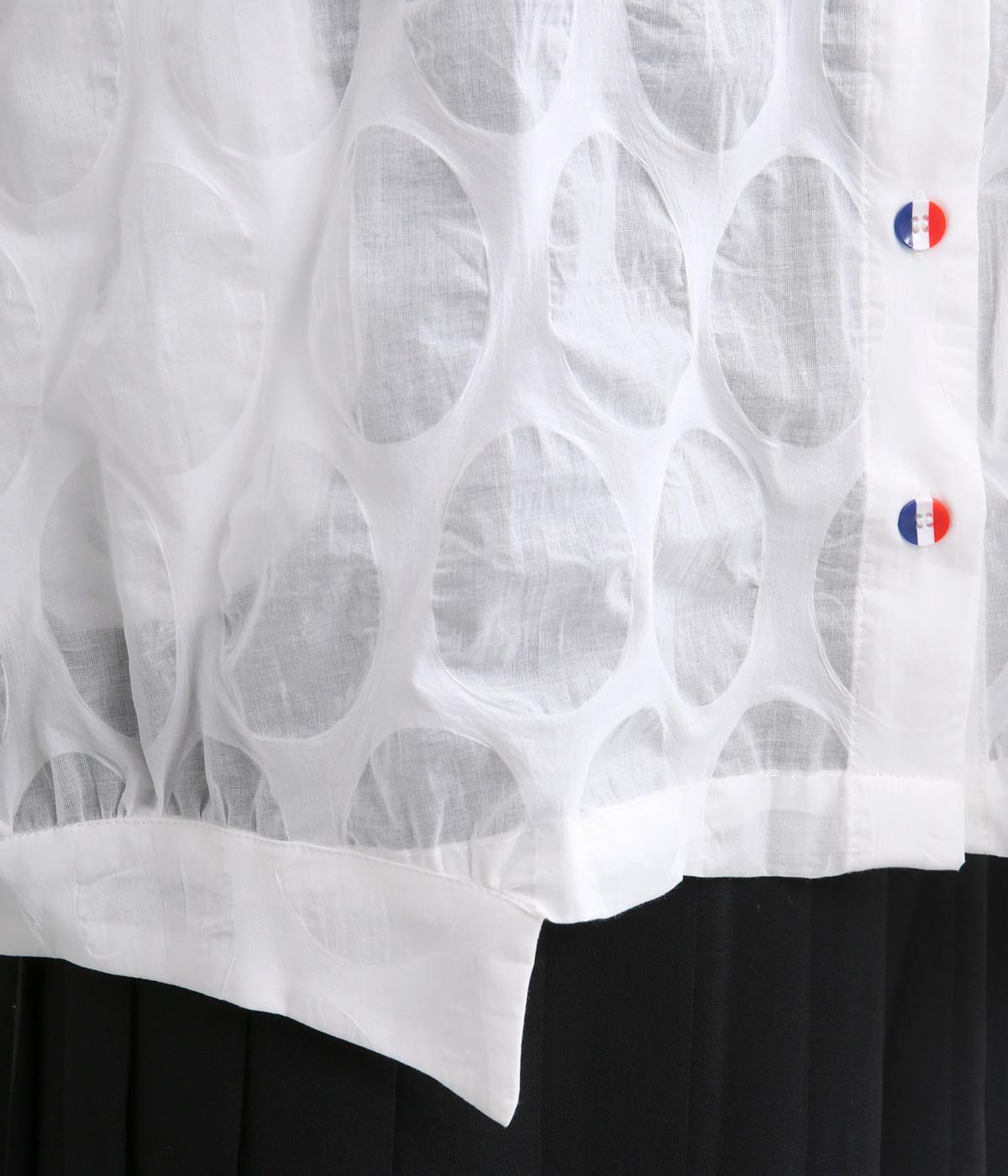 コットン生地に透け感のあるドットをあしらい、軽やかで清涼感のある風合いに仕上げています。肌ざわりがよく、快適に着られる素材感です。