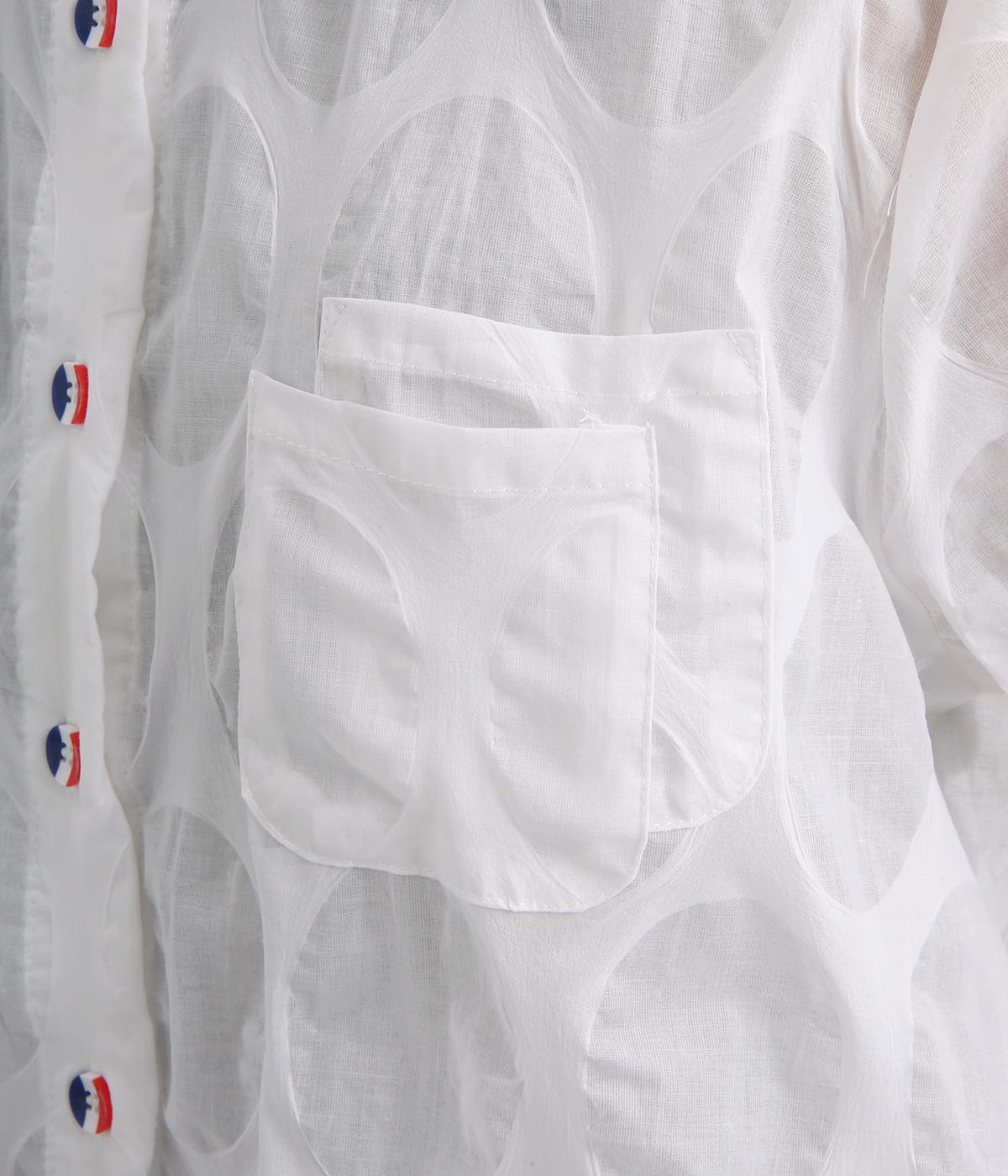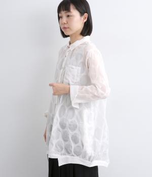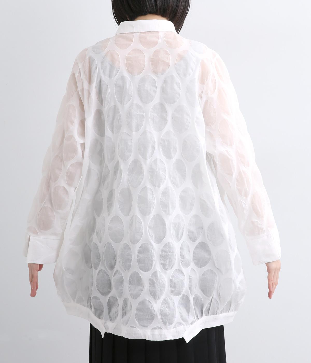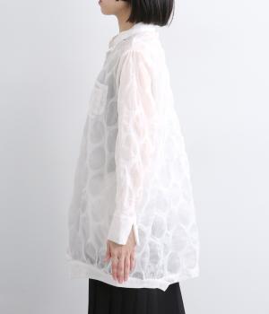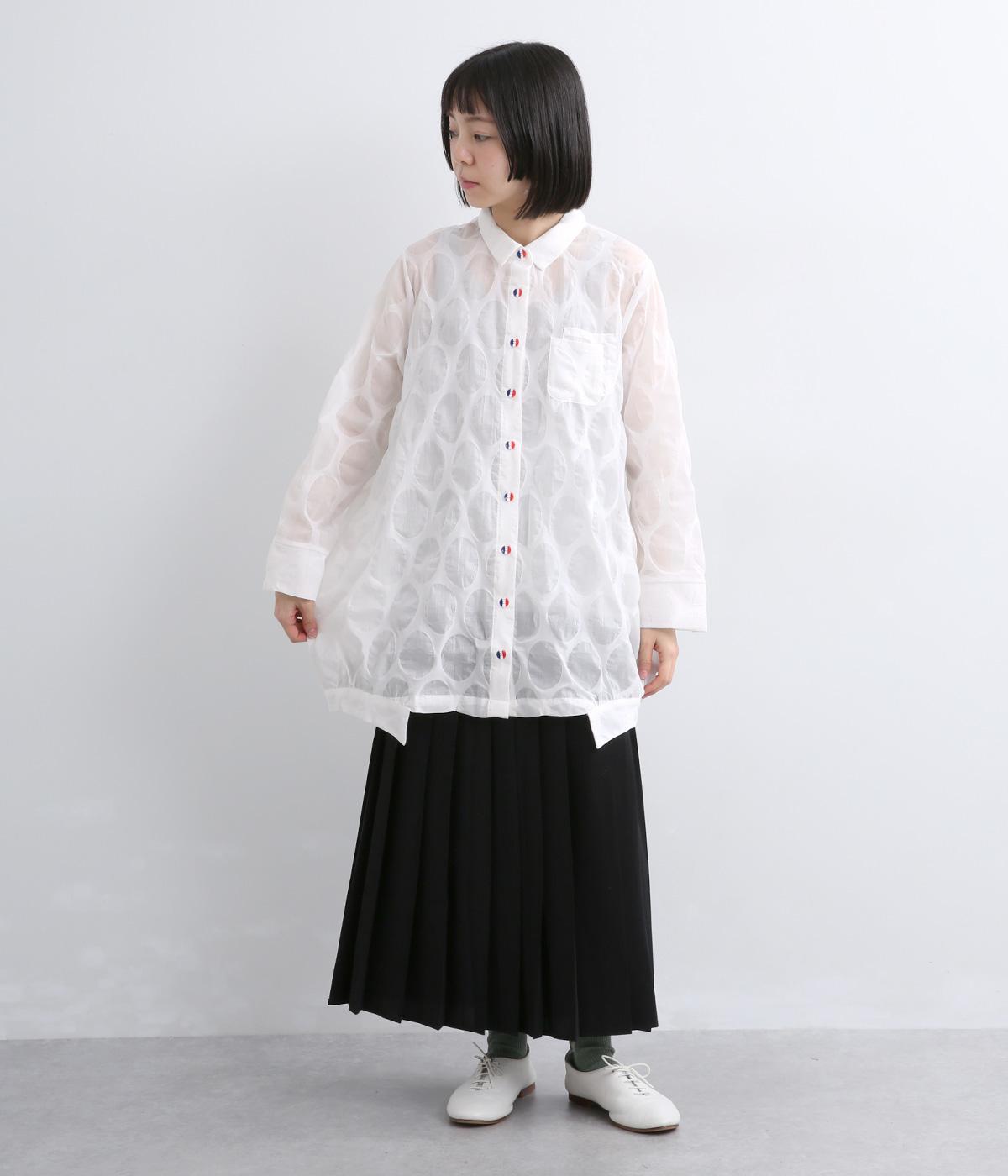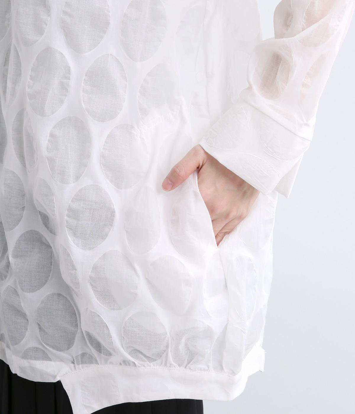 コットン生地に透け感のあるドットをあしらい、軽やかで清涼感のある風合いに仕上げています。肌ざわりがよく、快適に着られる素材感です。