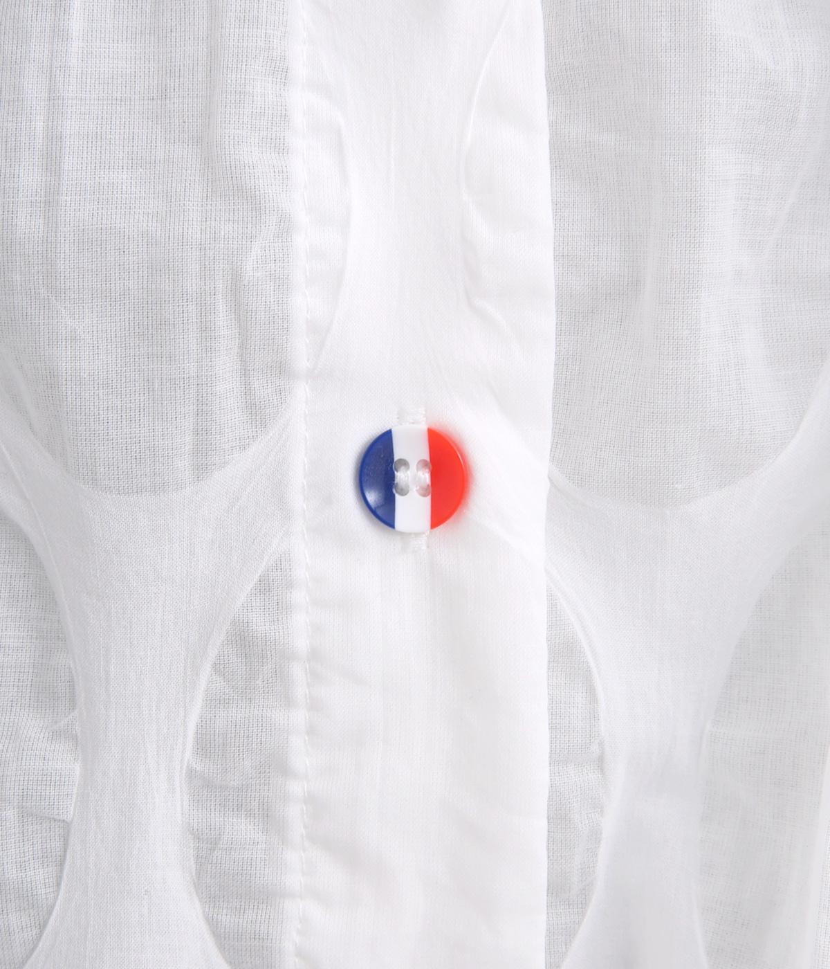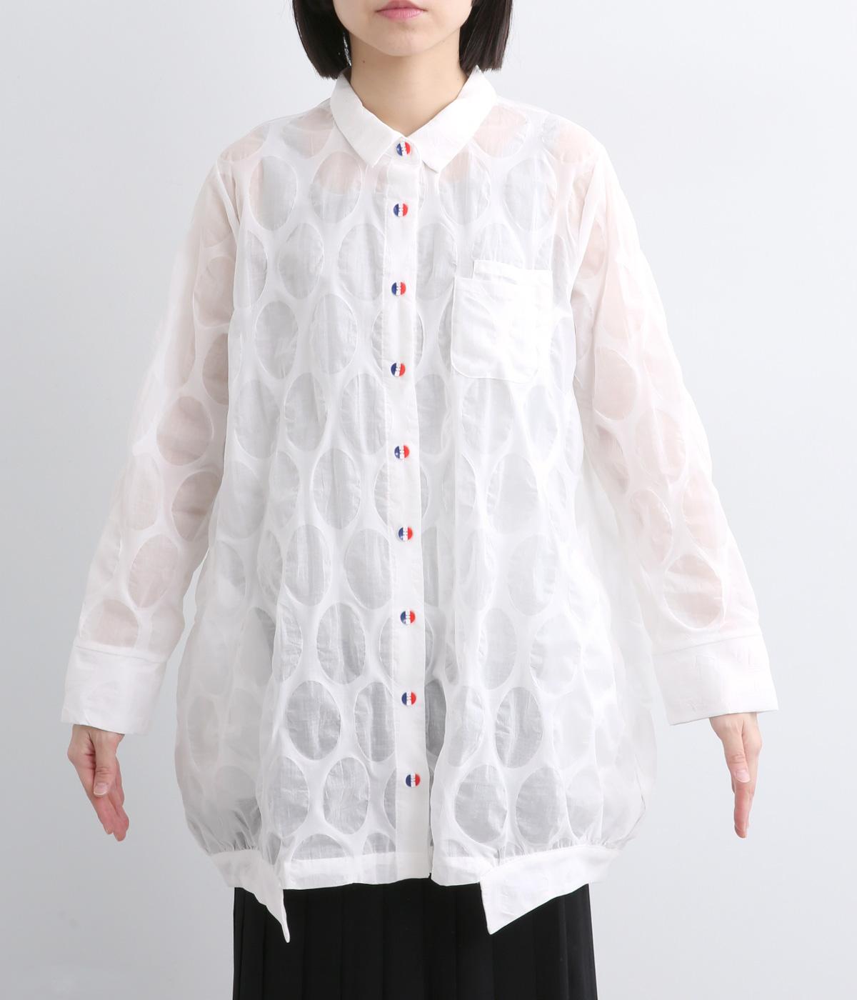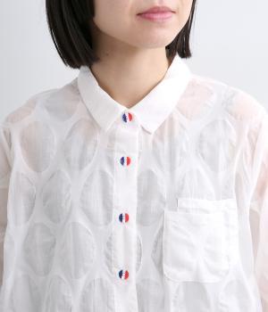 裾に変化をつけたコクーンシルエットのシャツブラウスです。トリコロールカラーのボタンがフレンチシックなアクセントを添えています。デザイン性がありながらも、チュニック風や羽織りにも着まわせる一枚です。