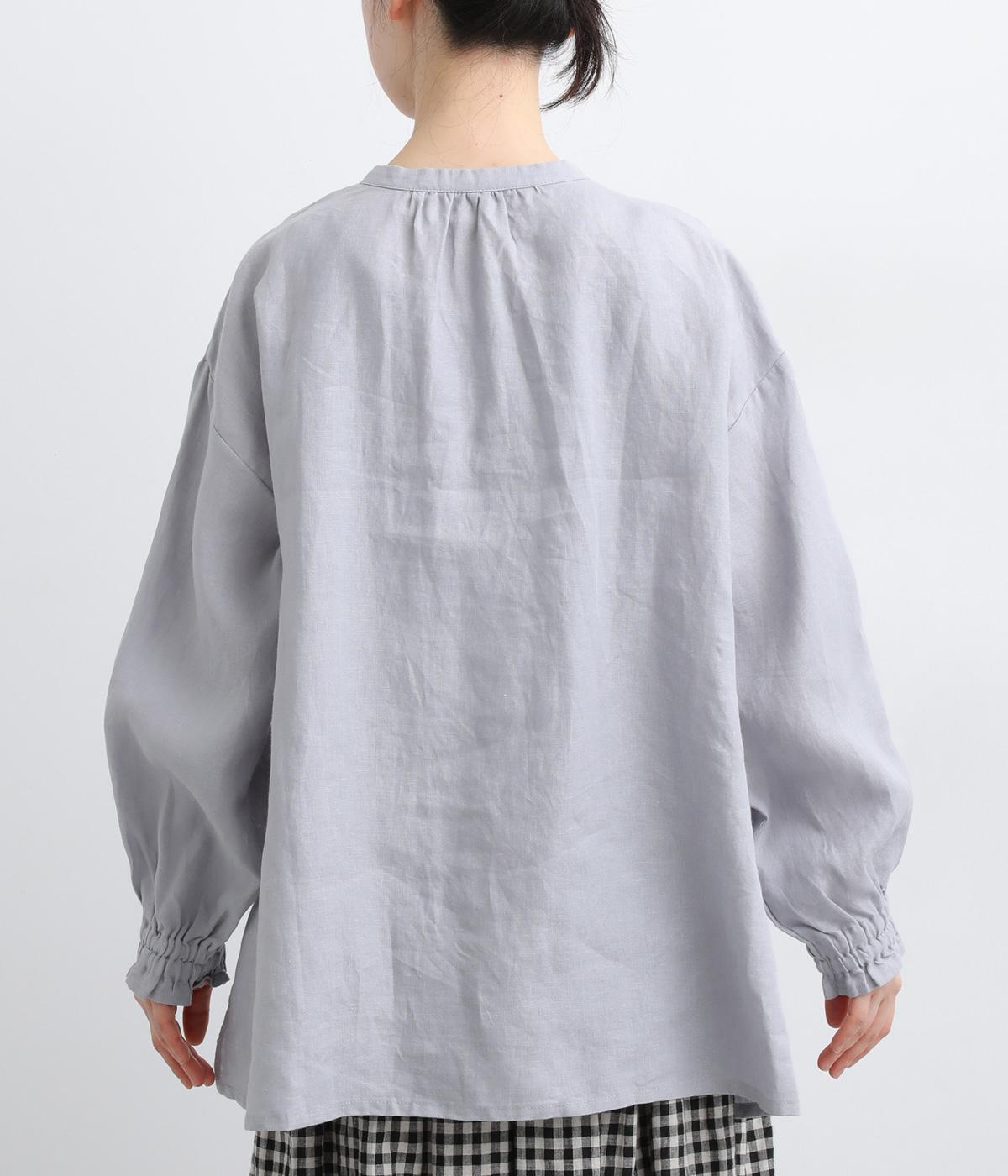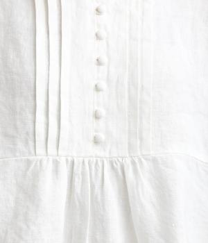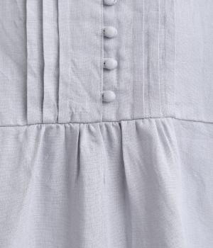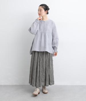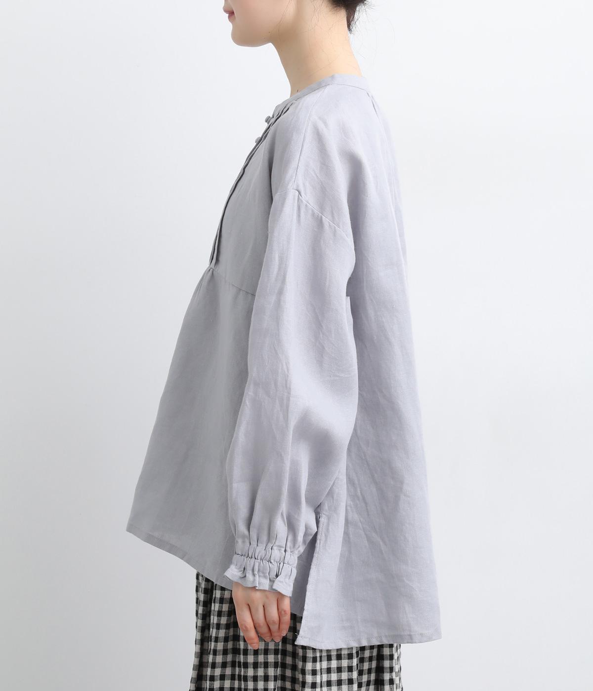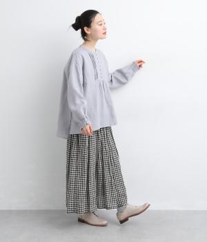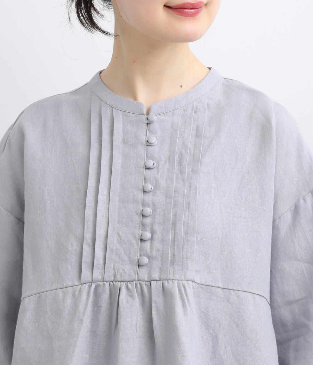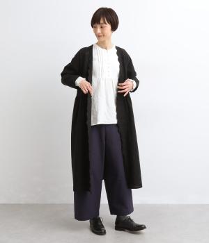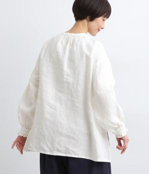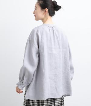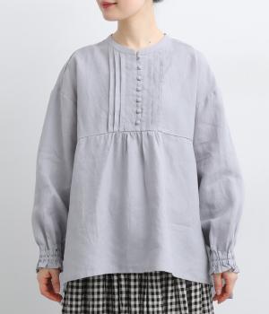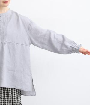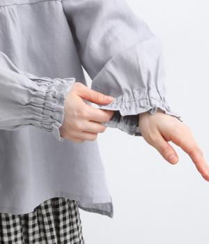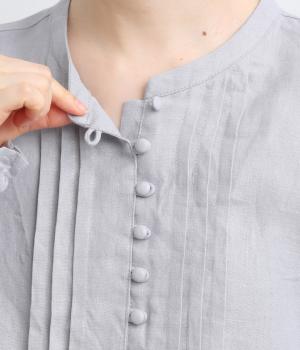 ゆったりとしたフレアシルエットに胸元のピンタックとくるみボタンが上品な印象を与える一枚。ふっくらした袖はゴムギャザー仕様で、たくし上げればさらにボリュームアップ。サイドスリット入りで裾も軽やかに揺れます。
