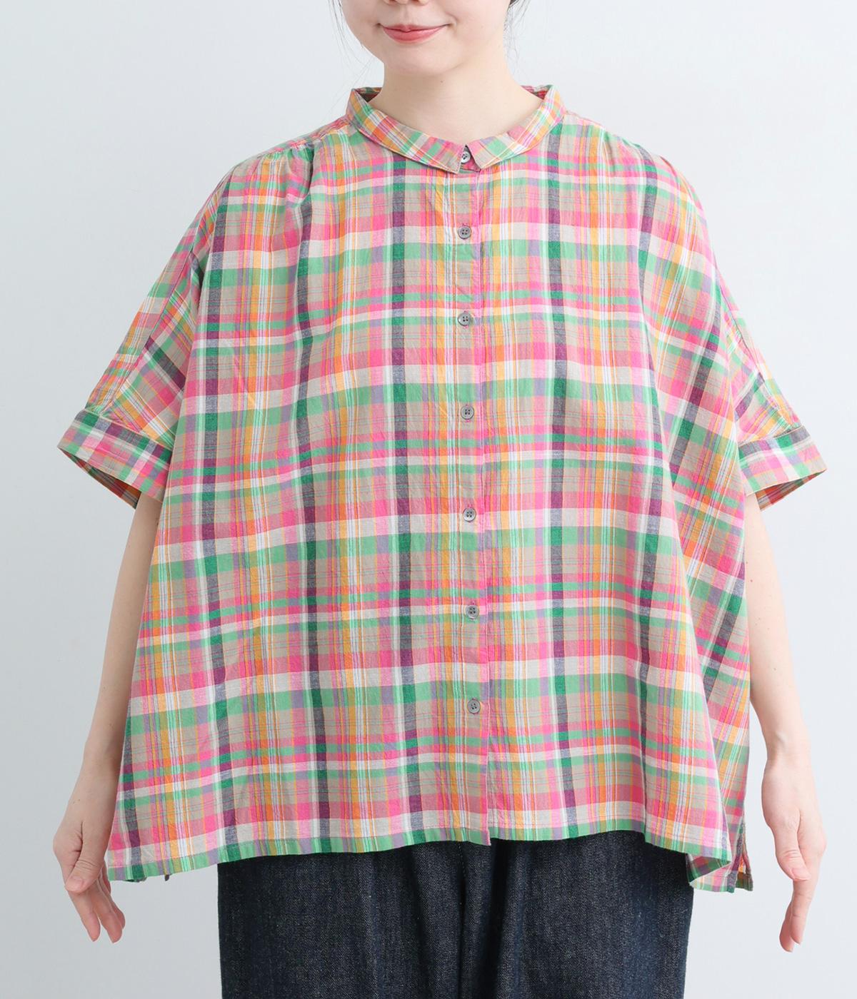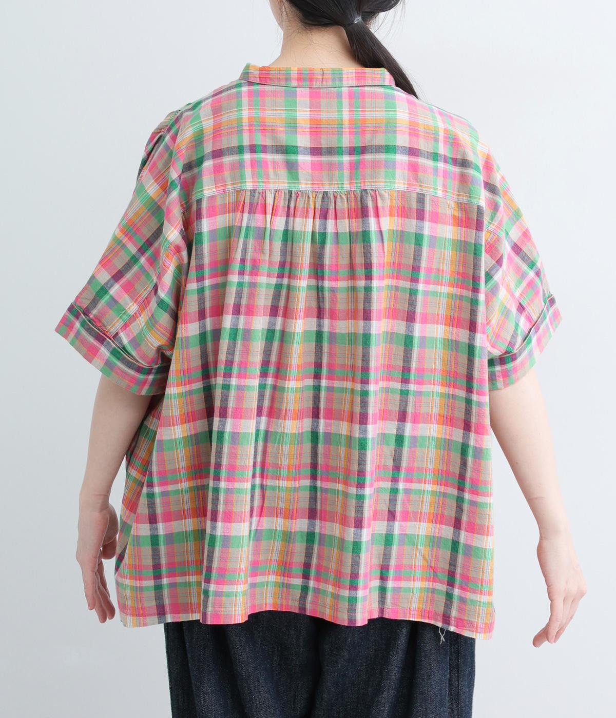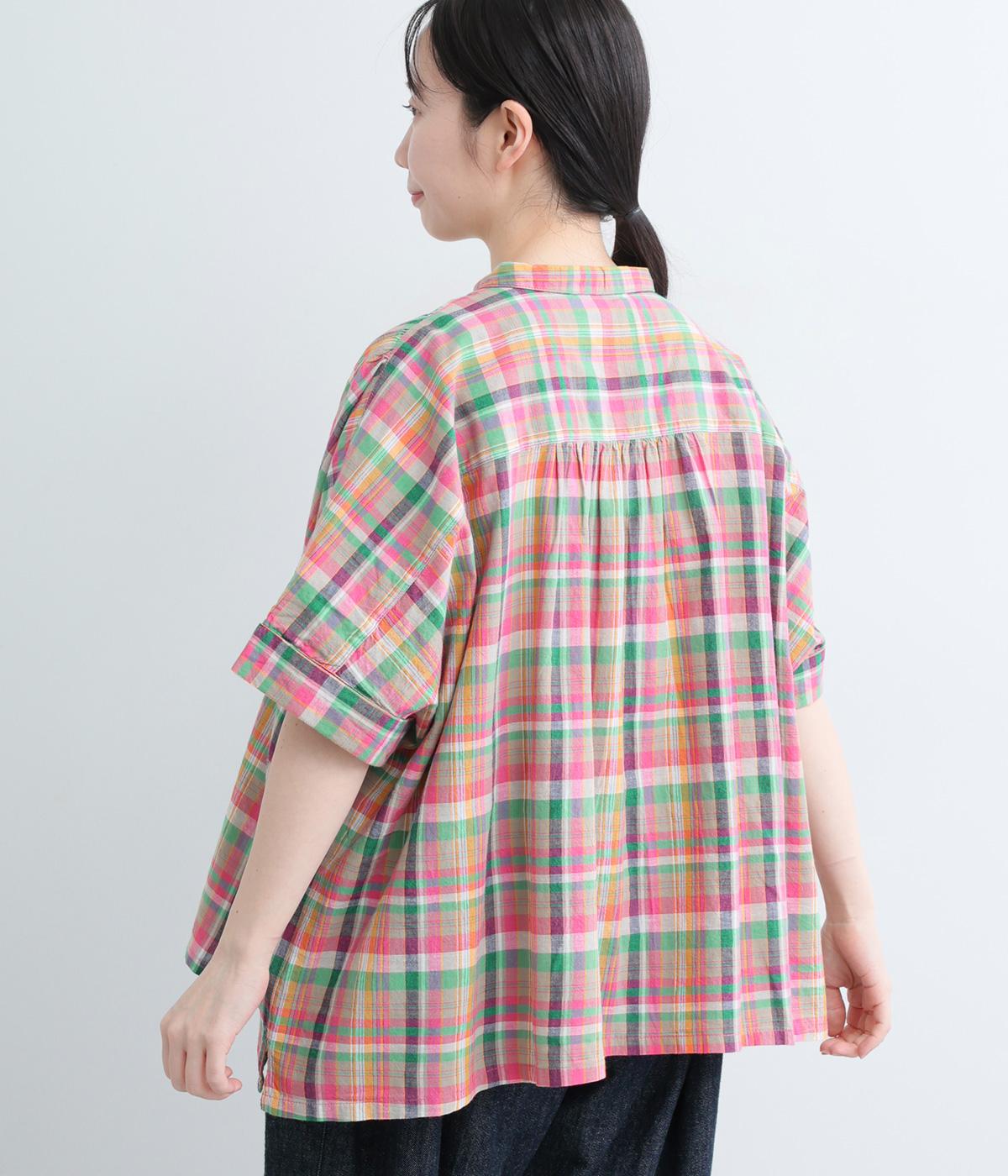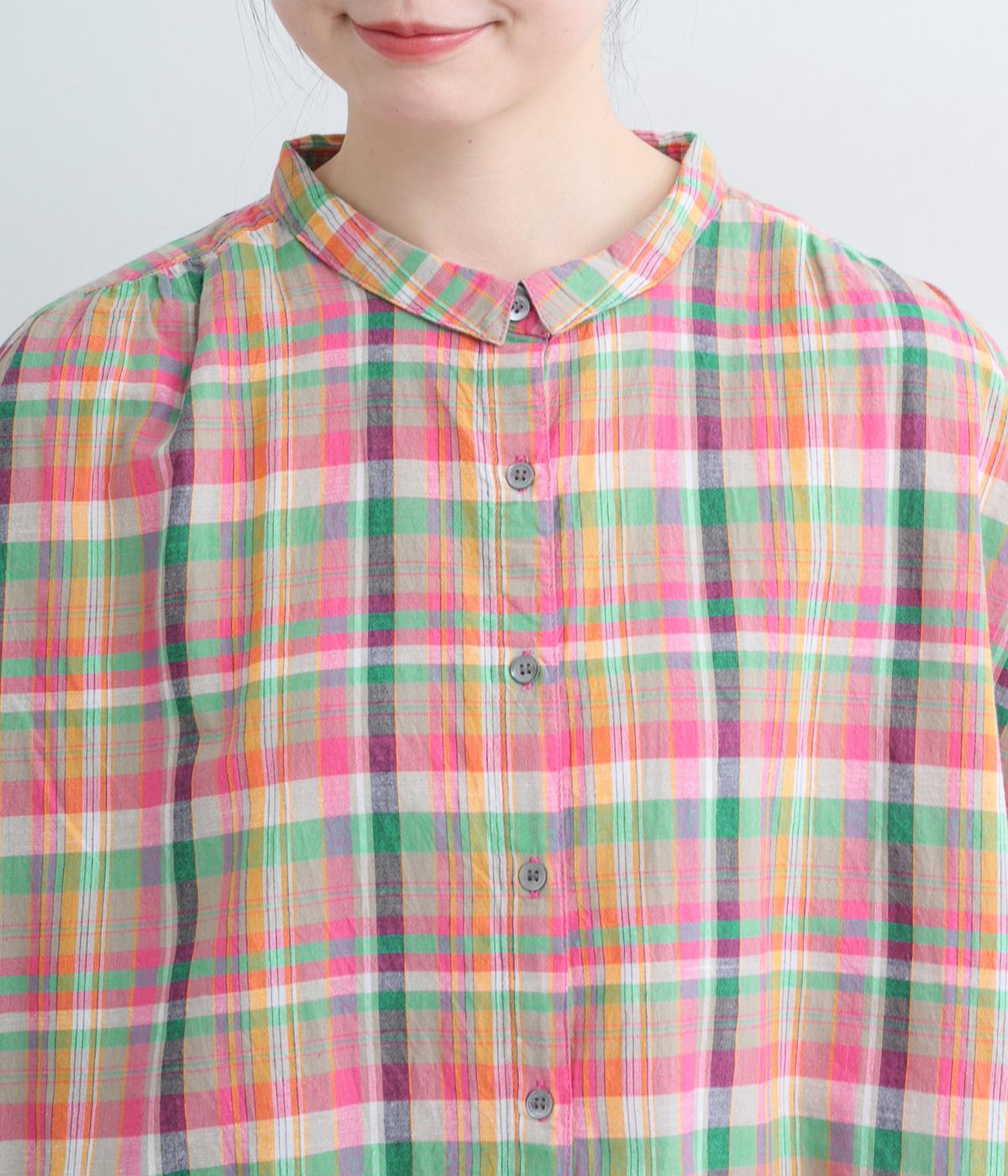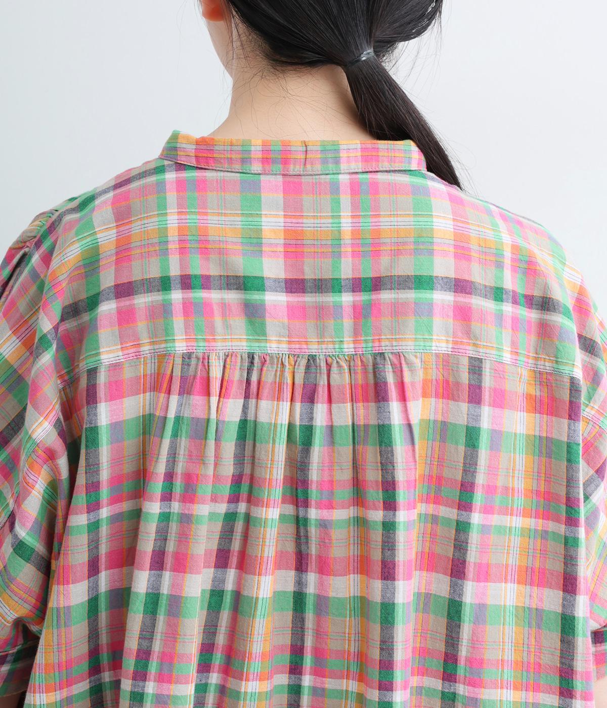 彩り豊かなマドラスチェックが目を引くワイドシャツ。ゆったりとした身幅が風をはらみ、肩や背中に寄せたギャザーが装いに華やかさを添えます。控えめなちび襟が、大人の可愛らしさを引き立てる一枚です。