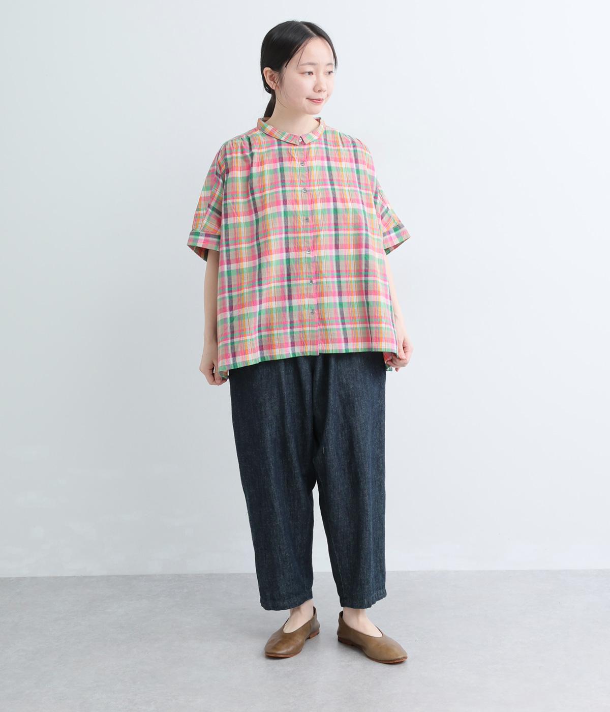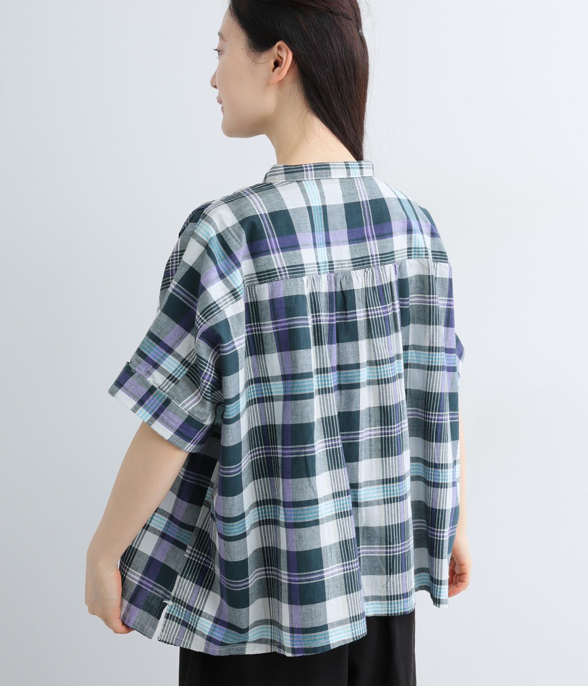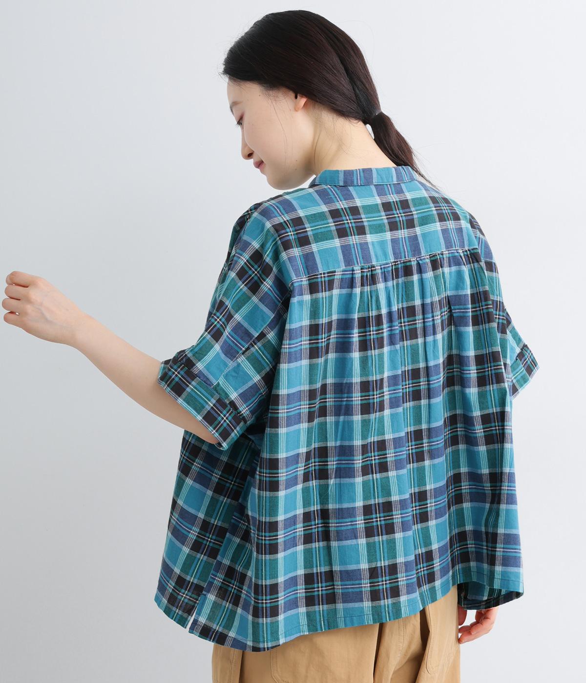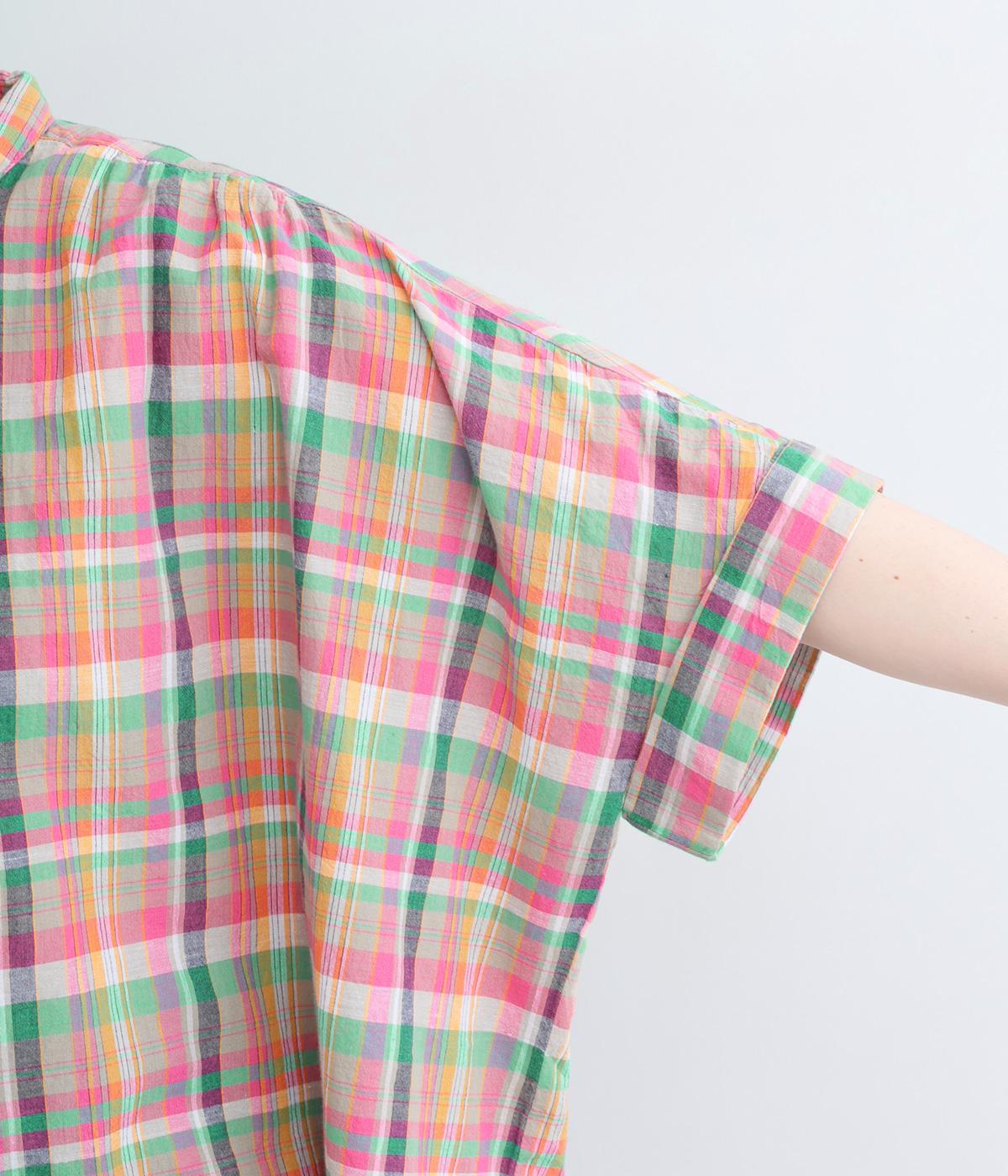 彩り豊かなマドラスチェックが目を引くワイドシャツ。ゆったりとした身幅が風をはらみ、肩や背中に寄せたギャザーが装いに華やかさを添えます。控えめなちび襟が、大人の可愛らしさを引き立てる一枚です。
