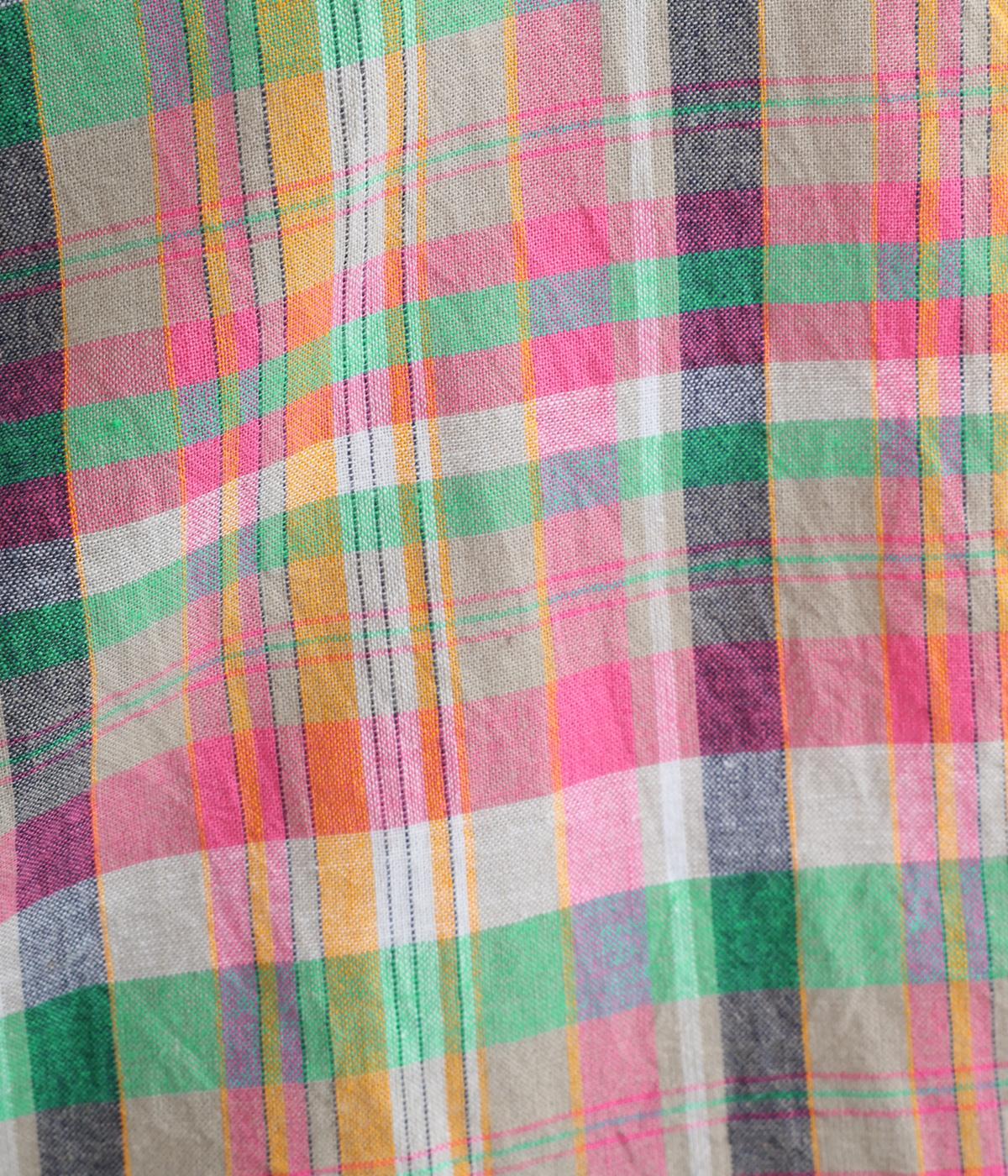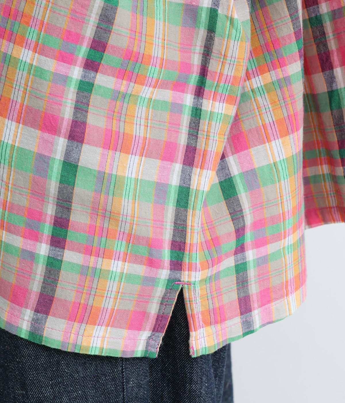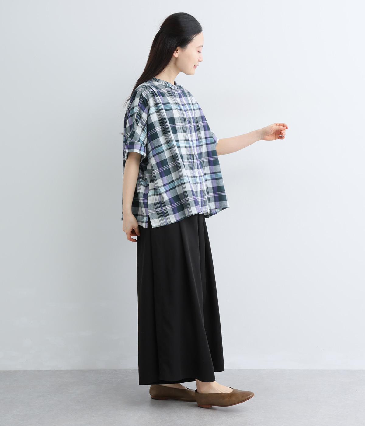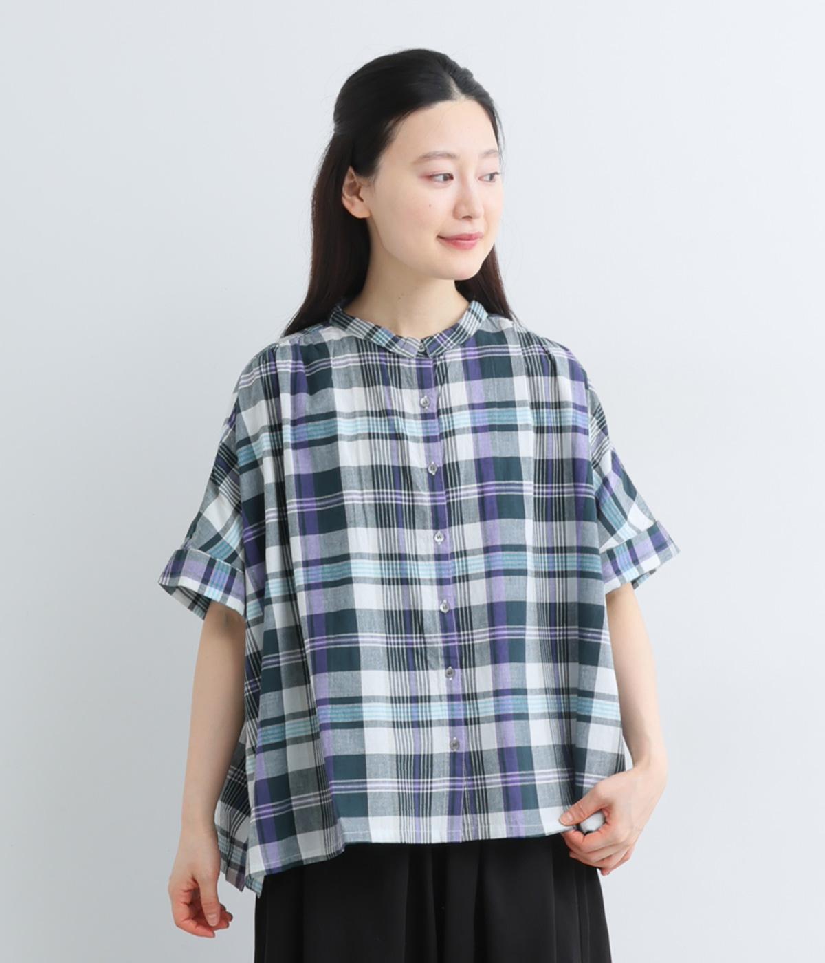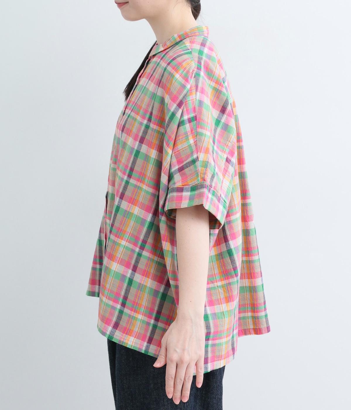 彩り豊かなマドラスチェックが目を引くワイドシャツ。ゆったりとした身幅が風をはらみ、肩や背中に寄せたギャザーが装いに華やかさを添えます。控えめなちび襟が、大人の可愛らしさを引き立てる一枚です。