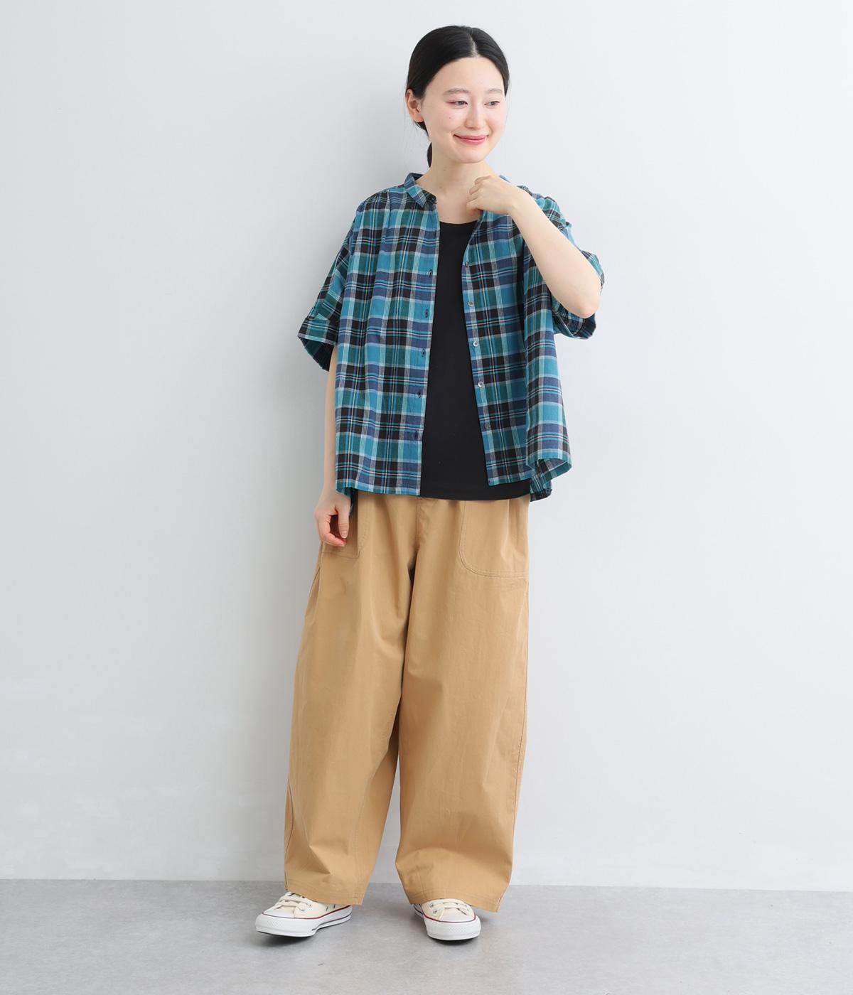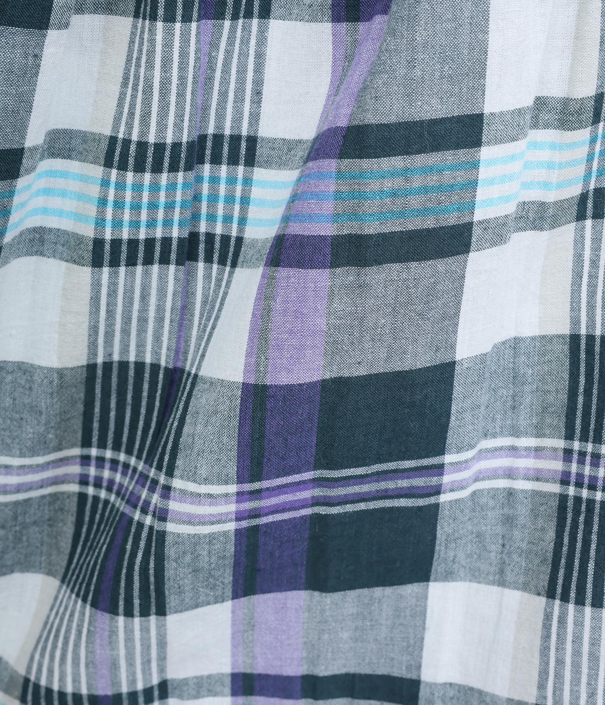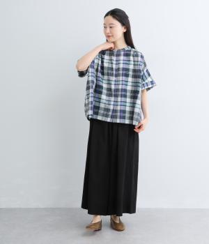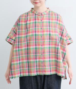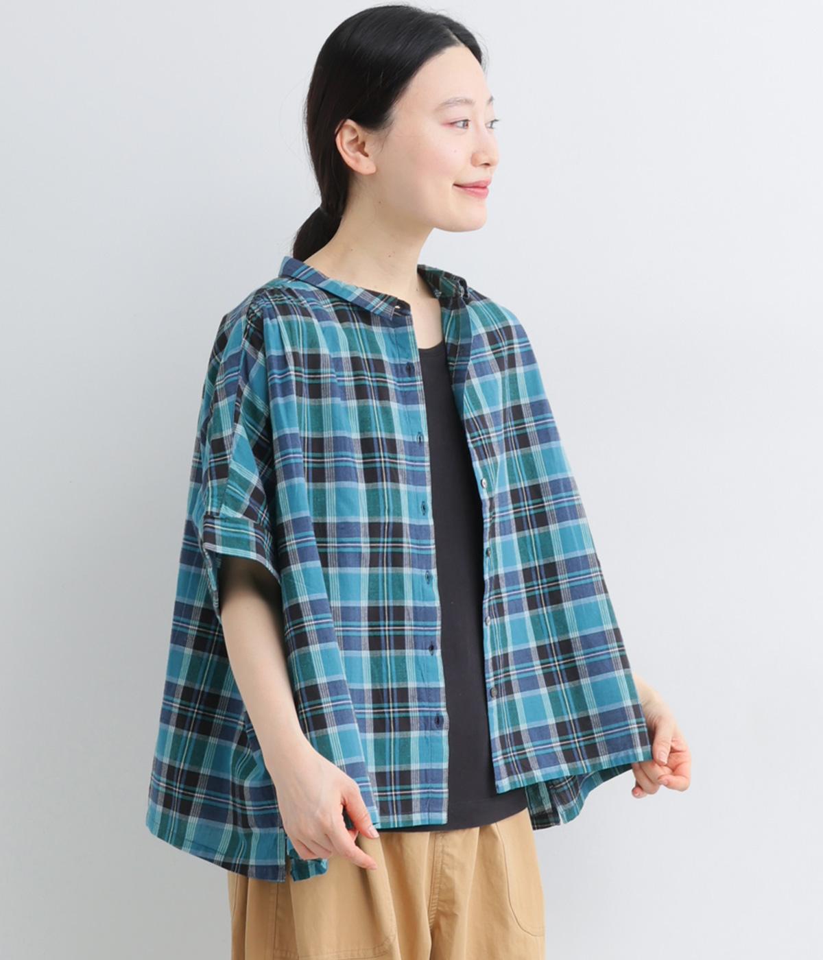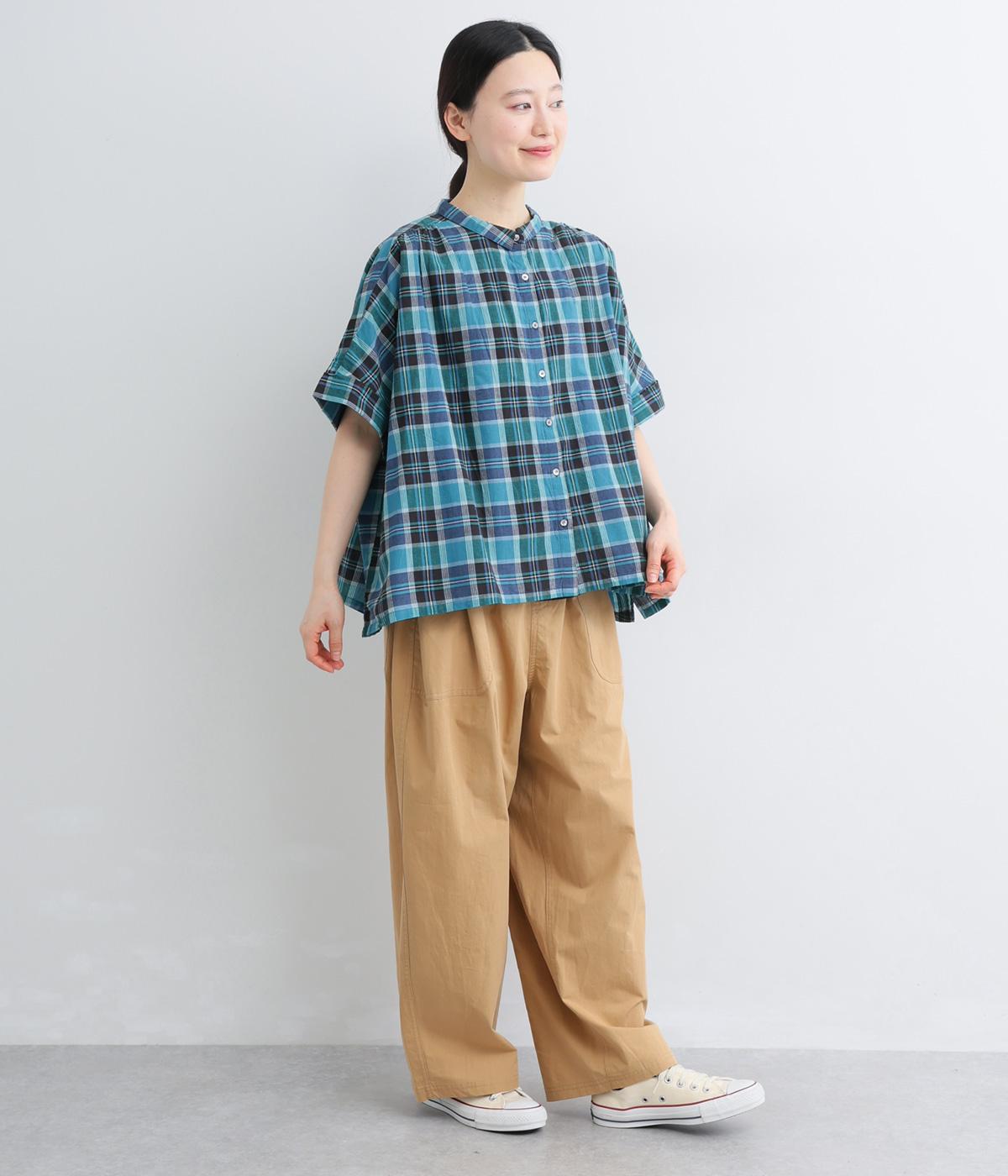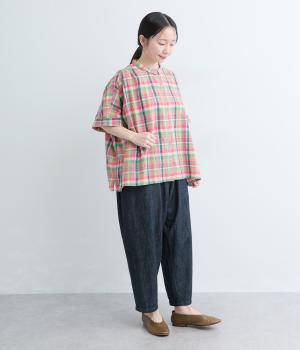 彩り豊かなマドラスチェックが目を引くワイドシャツ。ゆったりとした身幅が風をはらみ、肩や背中に寄せたギャザーが装いに華やかさを添えます。控えめなちび襟が、大人の可愛らしさを引き立てる一枚です。