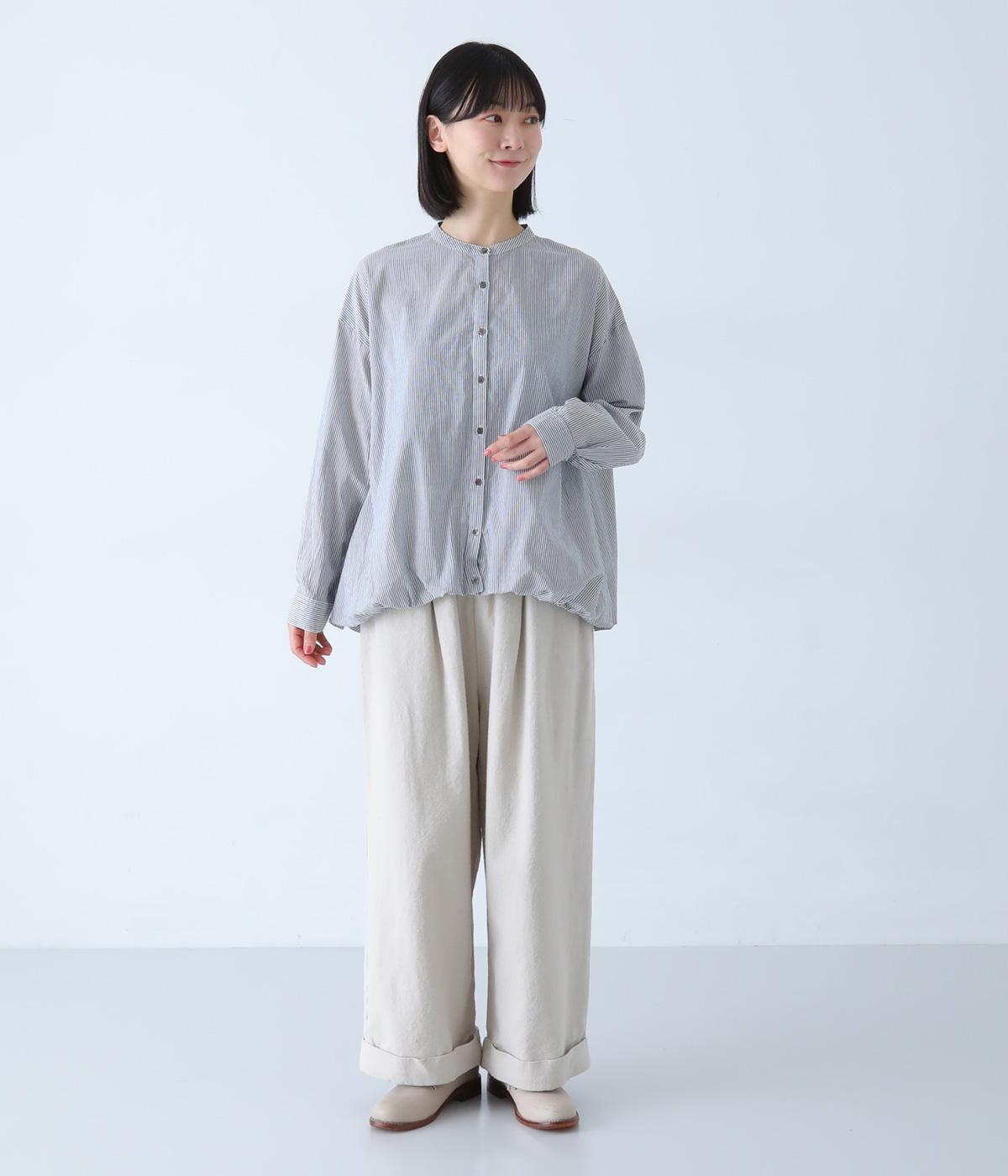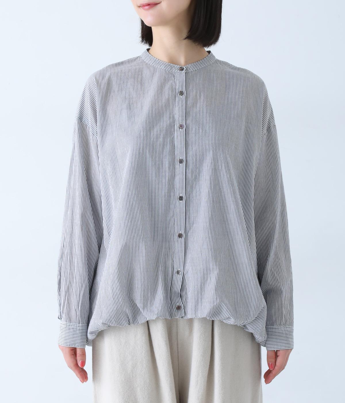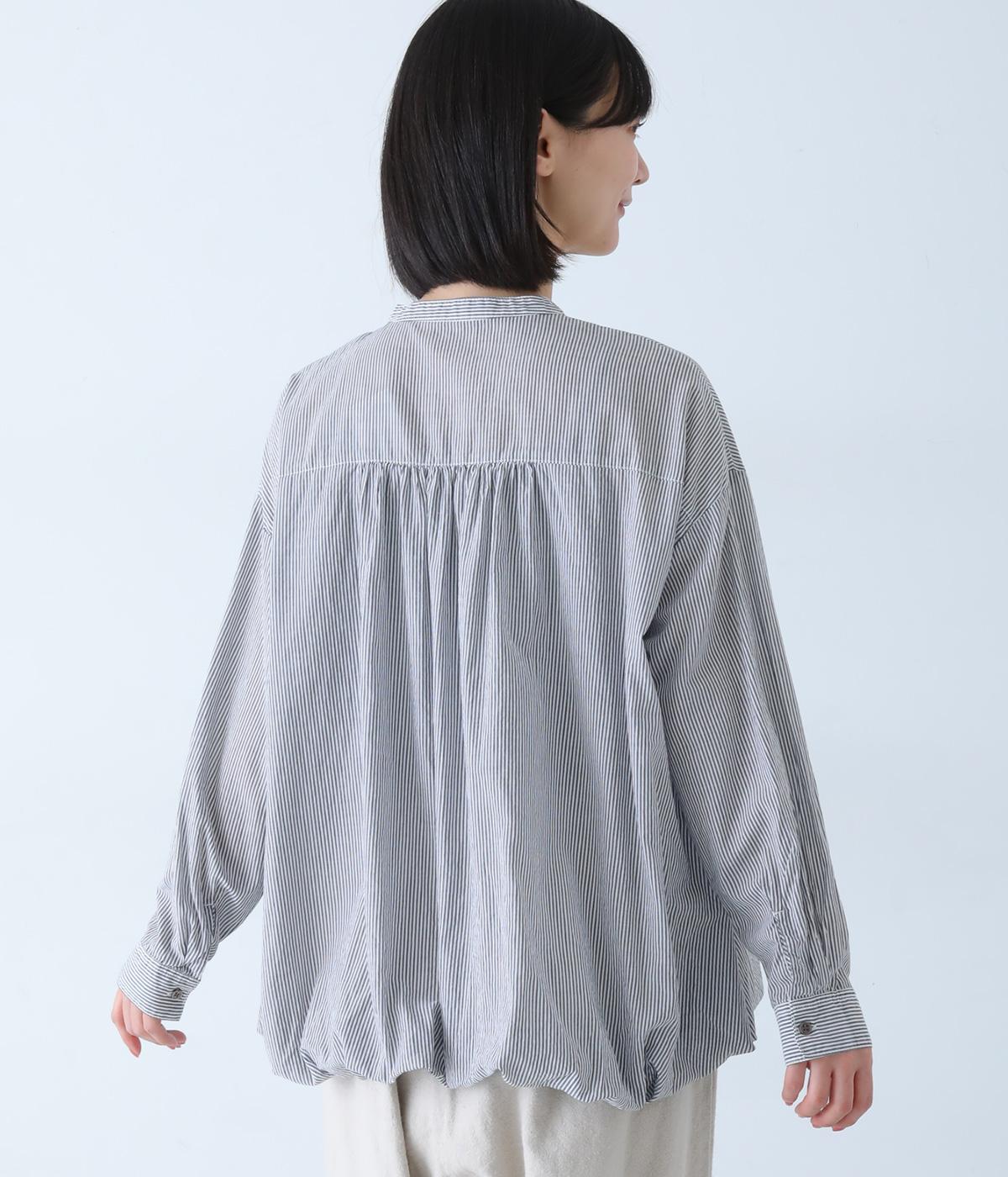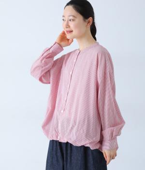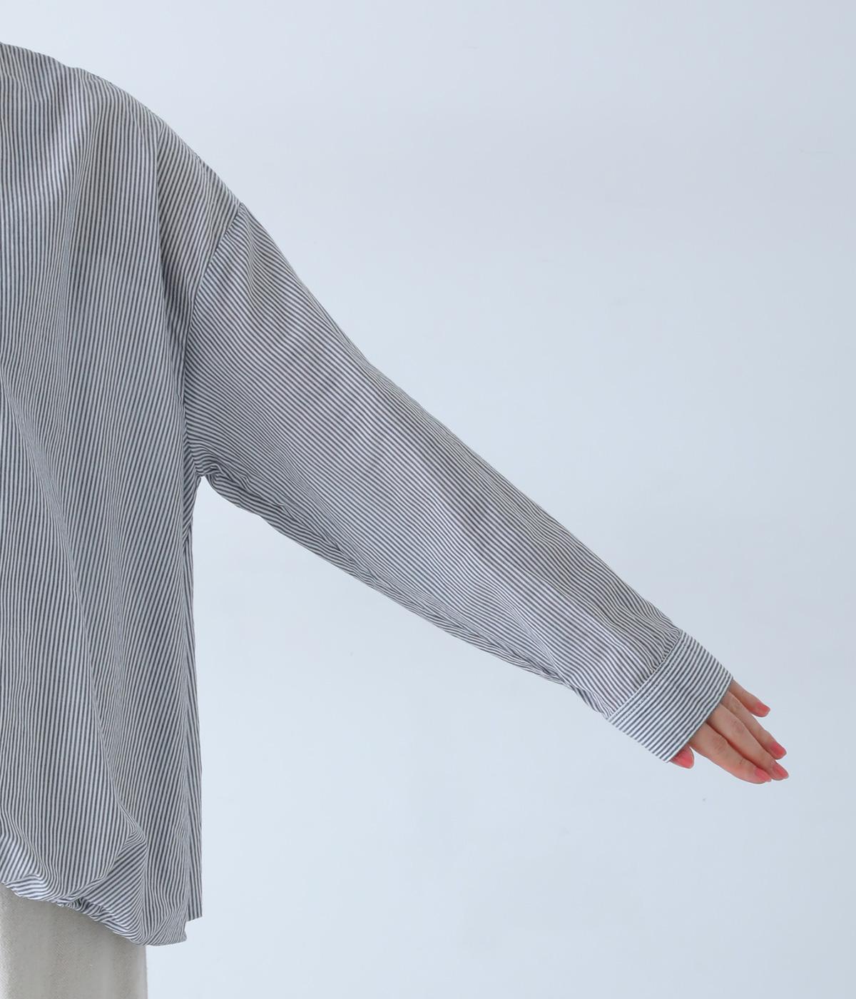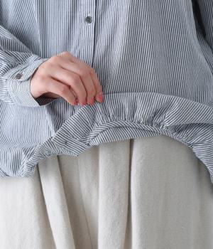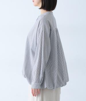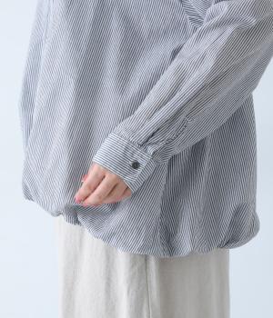 明るめのカラーで清涼感あふれる細ストライプのブラウスです。裾を内側に折り込み、丸みのあるバルーンシルエットに仕上げました。袖をまくってみたり、前を開けて羽織りとして着用したりと、様々なアレンジが楽しめます。