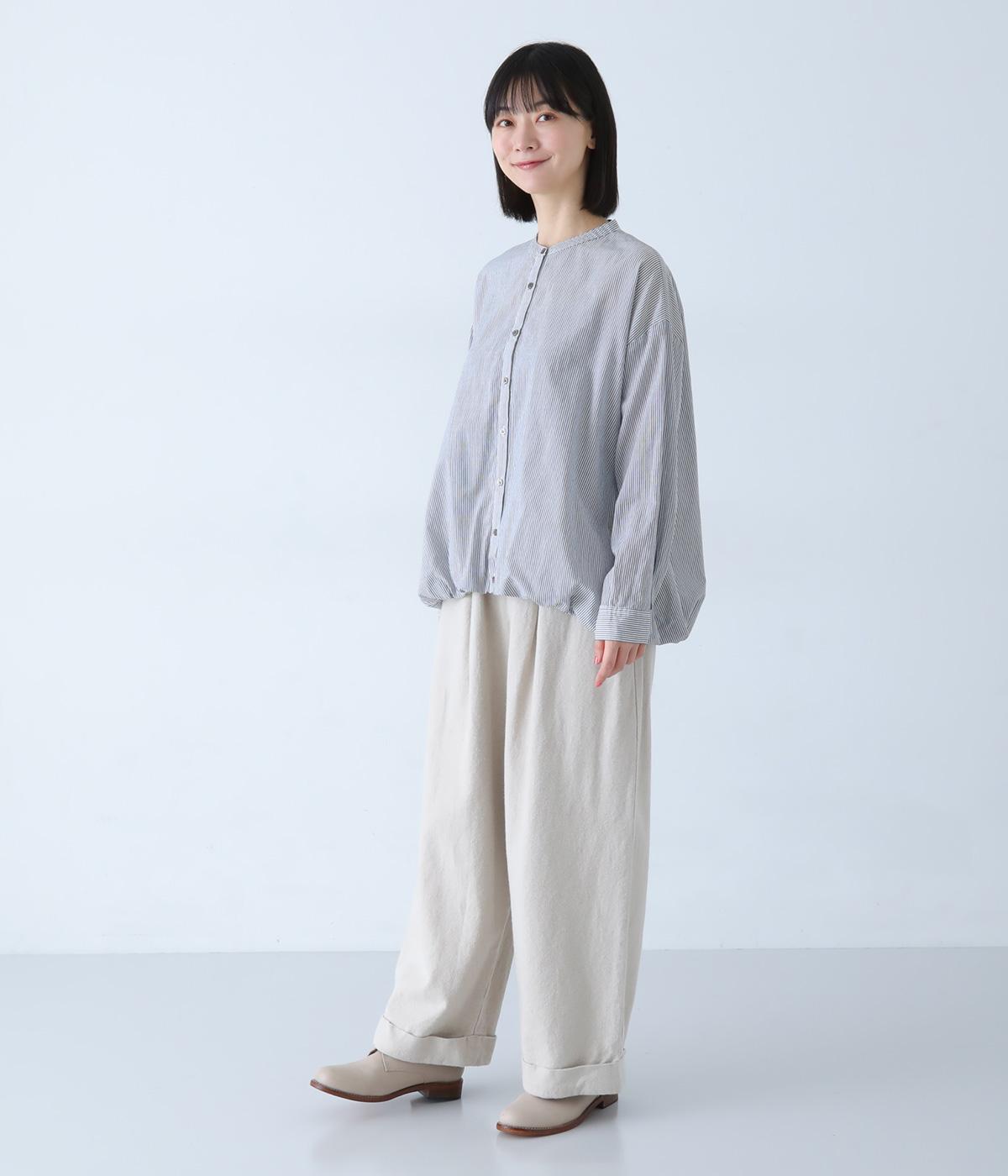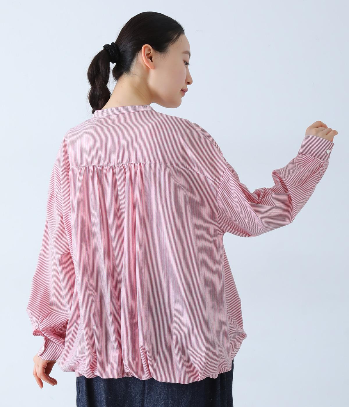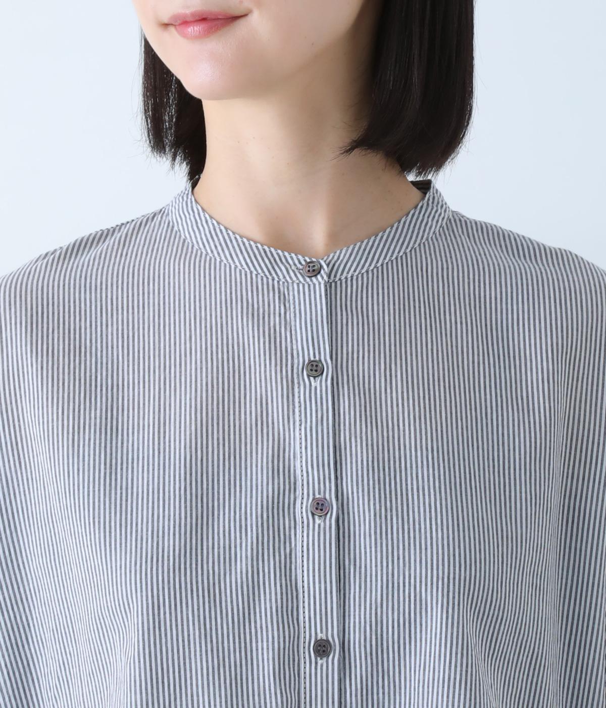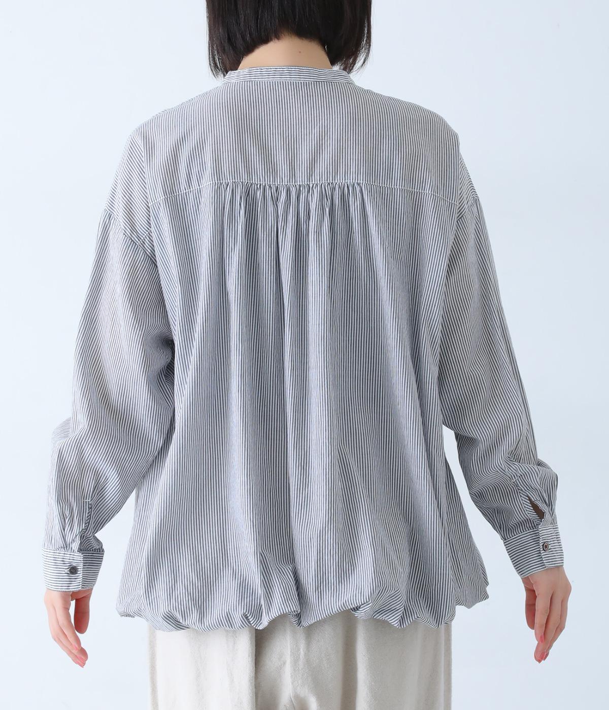 明るめのカラーで清涼感あふれる細ストライプのブラウスです。裾を内側に折り込み、丸みのあるバルーンシルエットに仕上げました。袖をまくってみたり、前を開けて羽織りとして着用したりと、様々なアレンジが楽しめます。