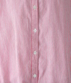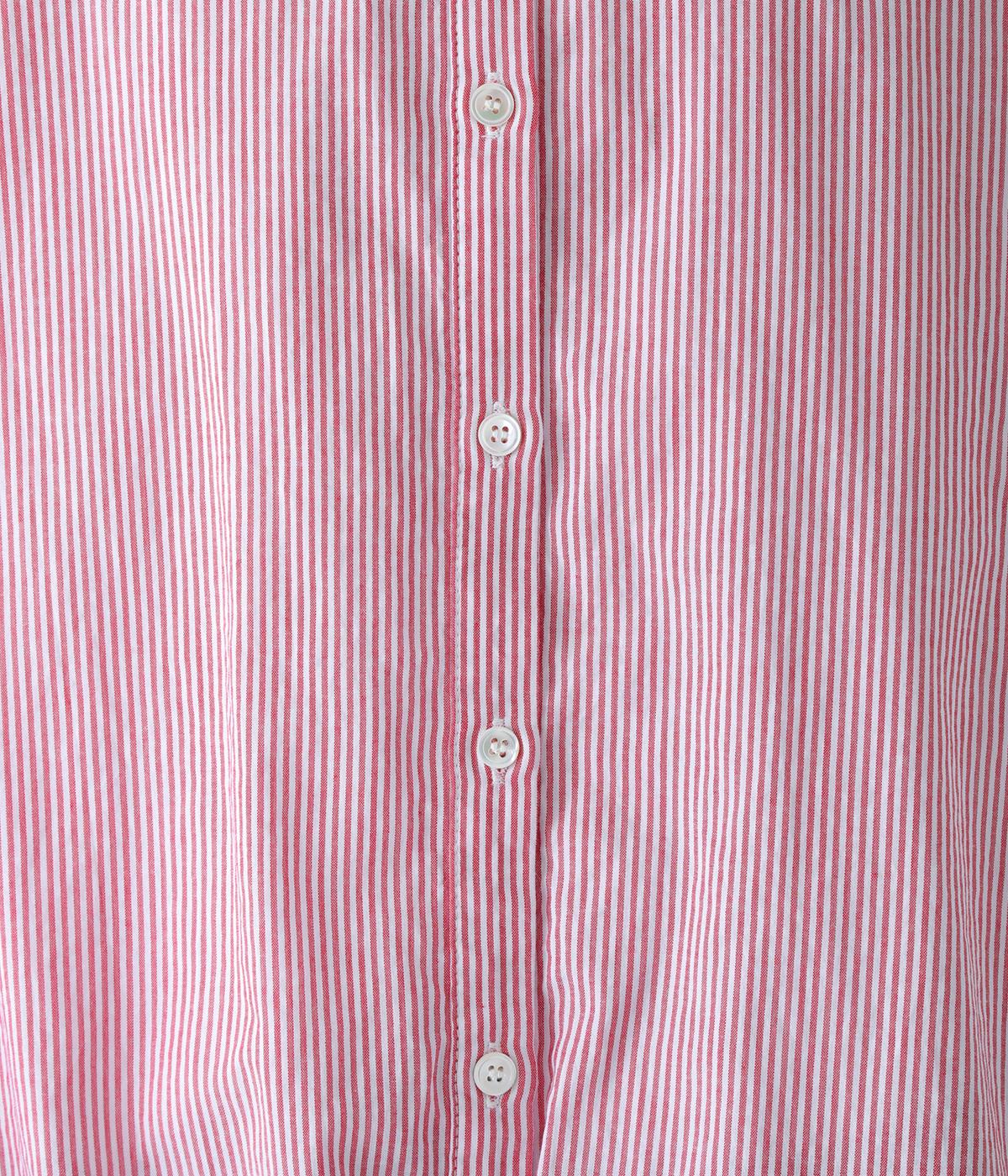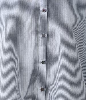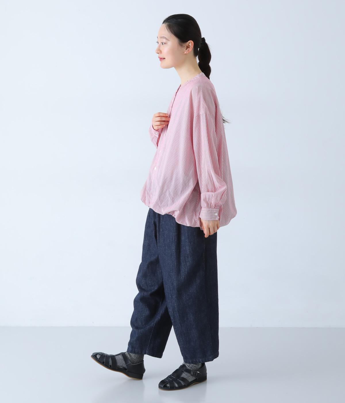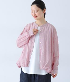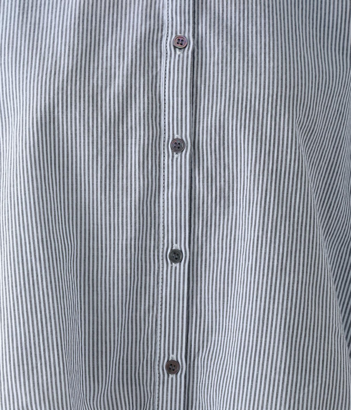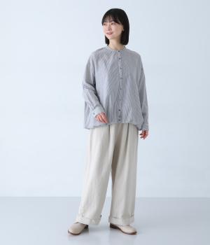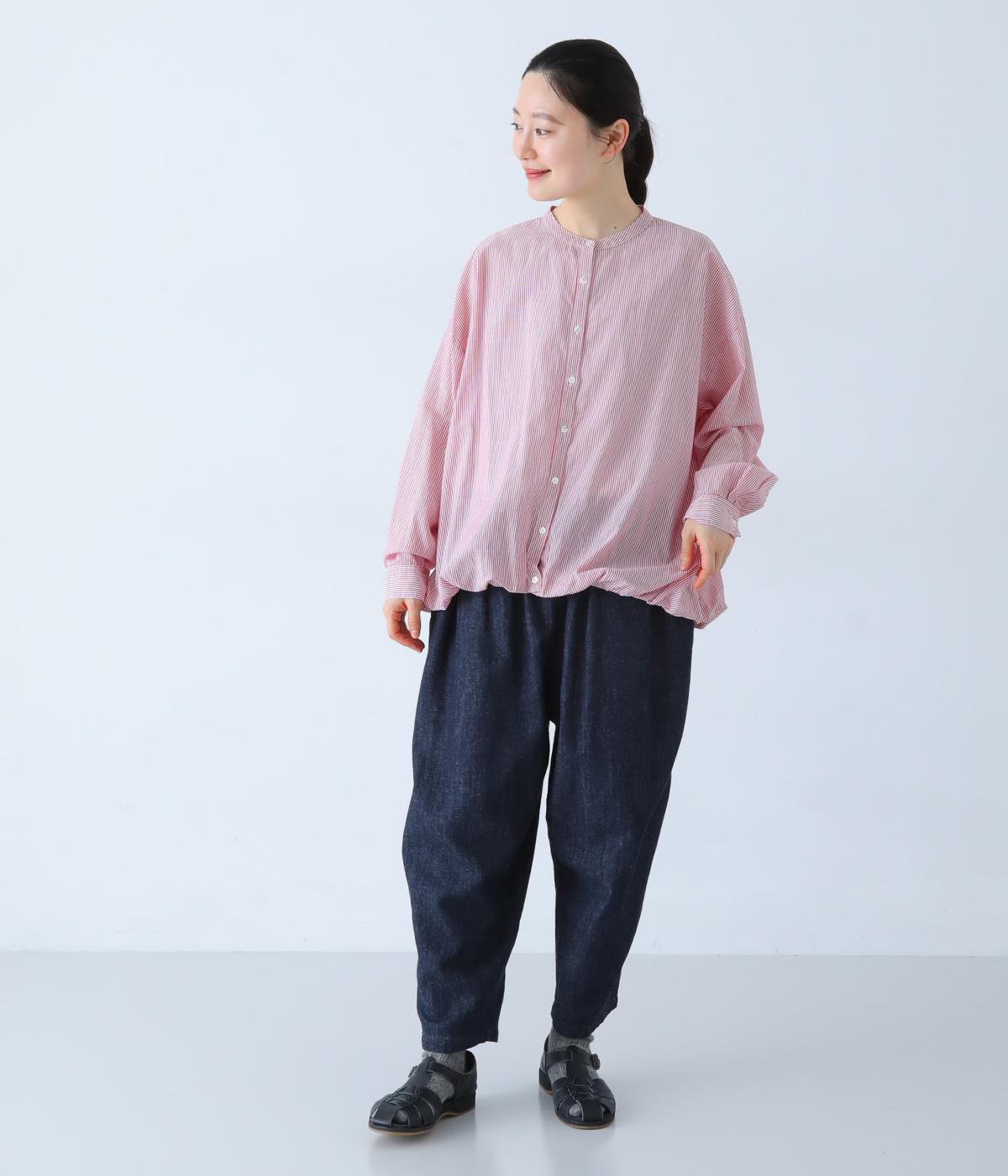 明るめのカラーで清涼感あふれる細ストライプのブラウスです。裾を内側に折り込み、丸みのあるバルーンシルエットに仕上げました。袖をまくってみたり、前を開けて羽織りとして着用したりと、様々なアレンジが楽しめます。