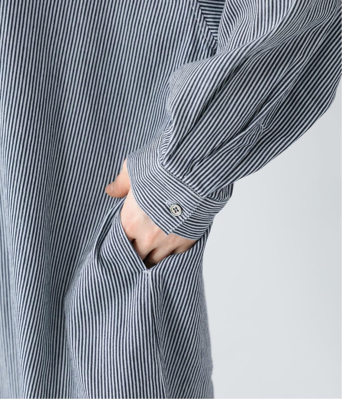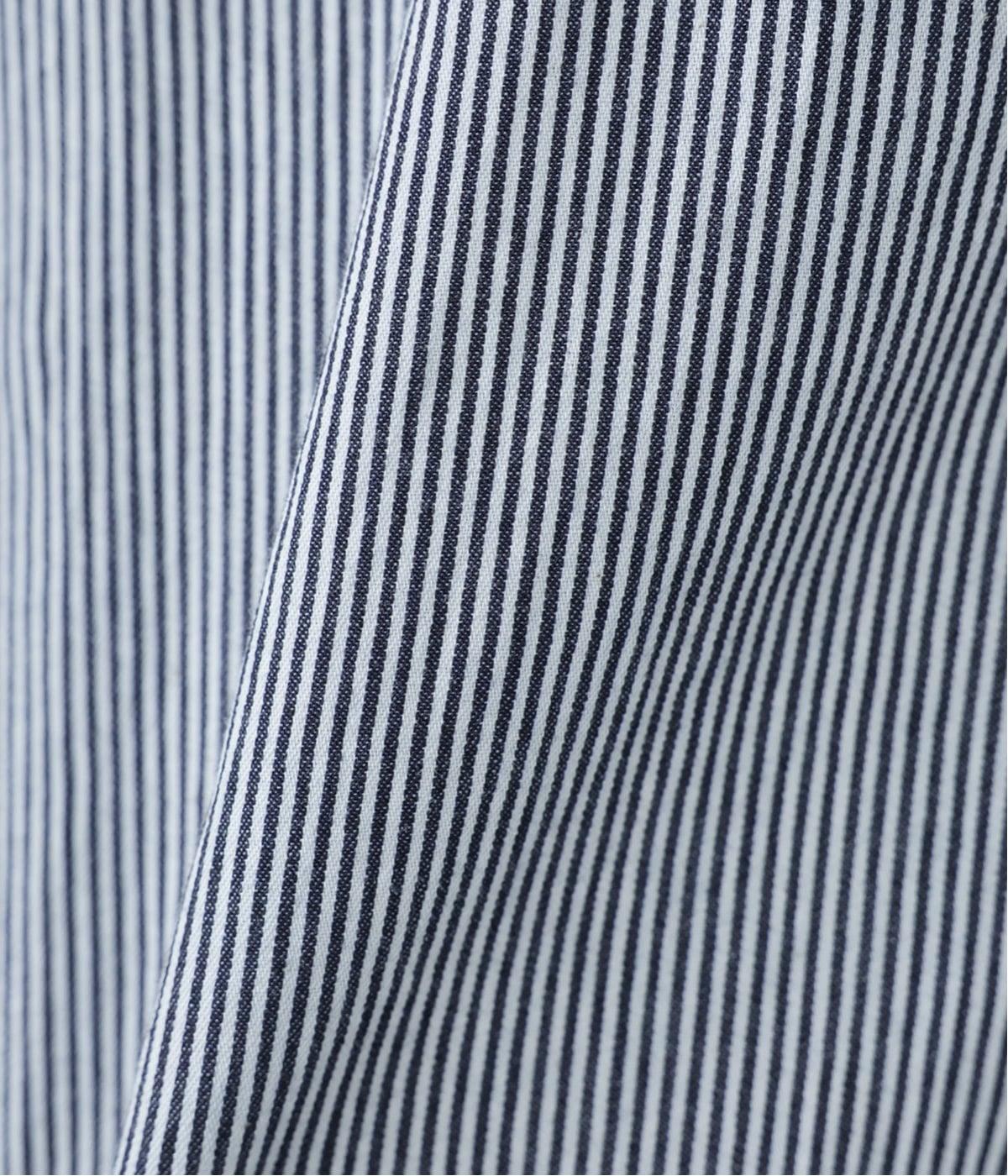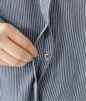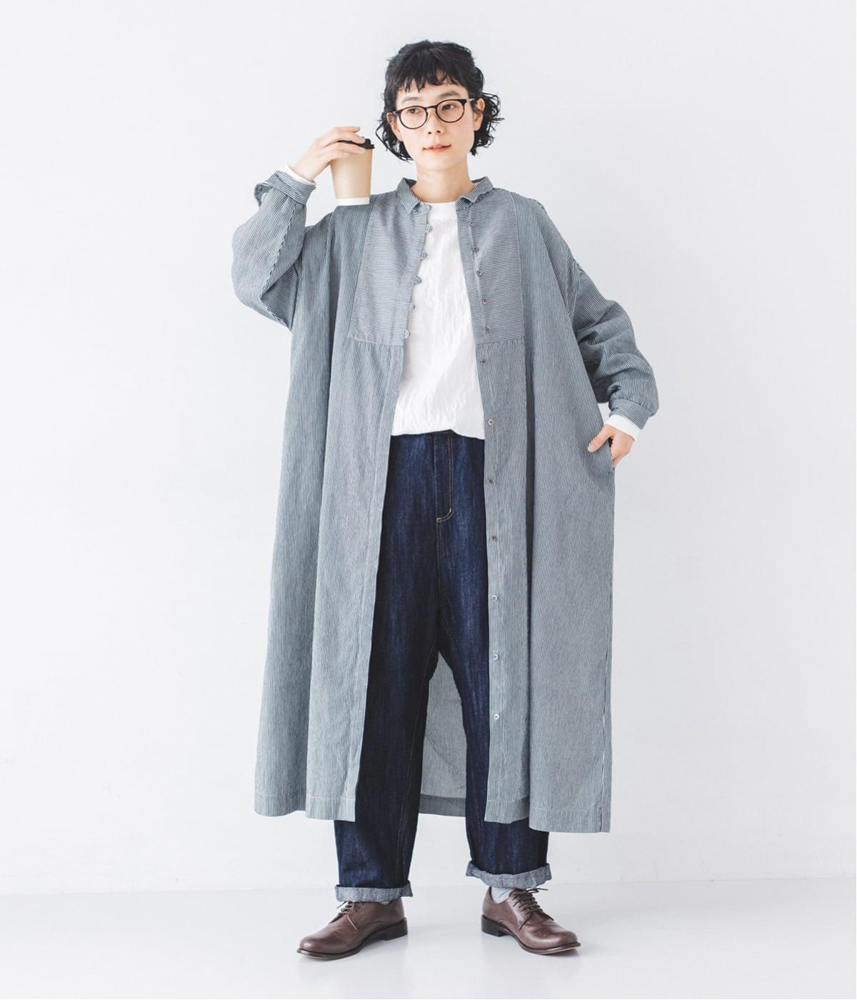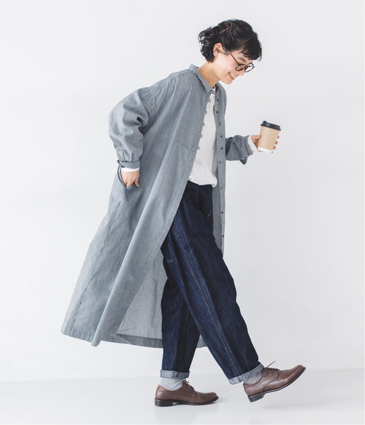 ヒッコリーとは、紺地に白のストライプ柄が入ったデニム生地のこと。今回はコットン100%のライトオンスデニムを使用しています。見た目に反してごわつきが少なく軽やかで、快適な着心地の一枚です。