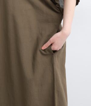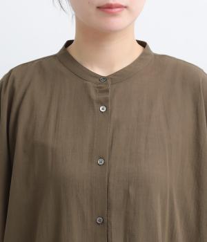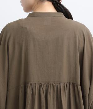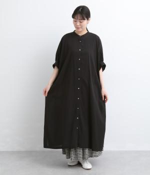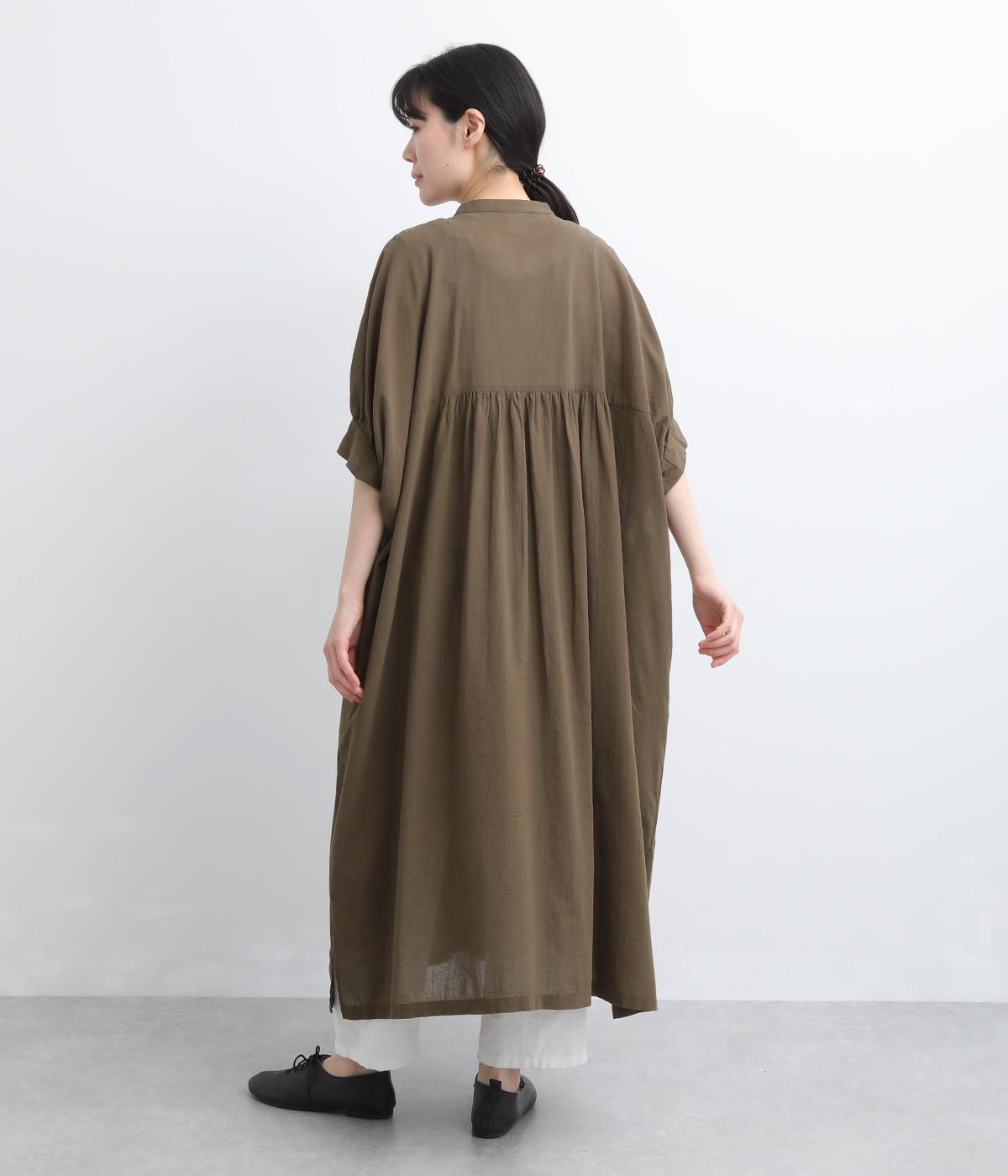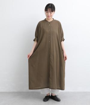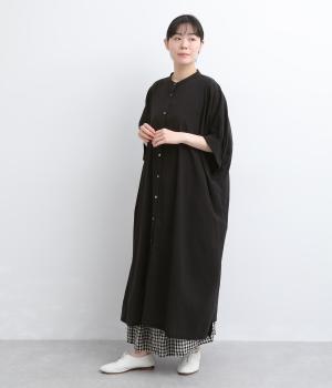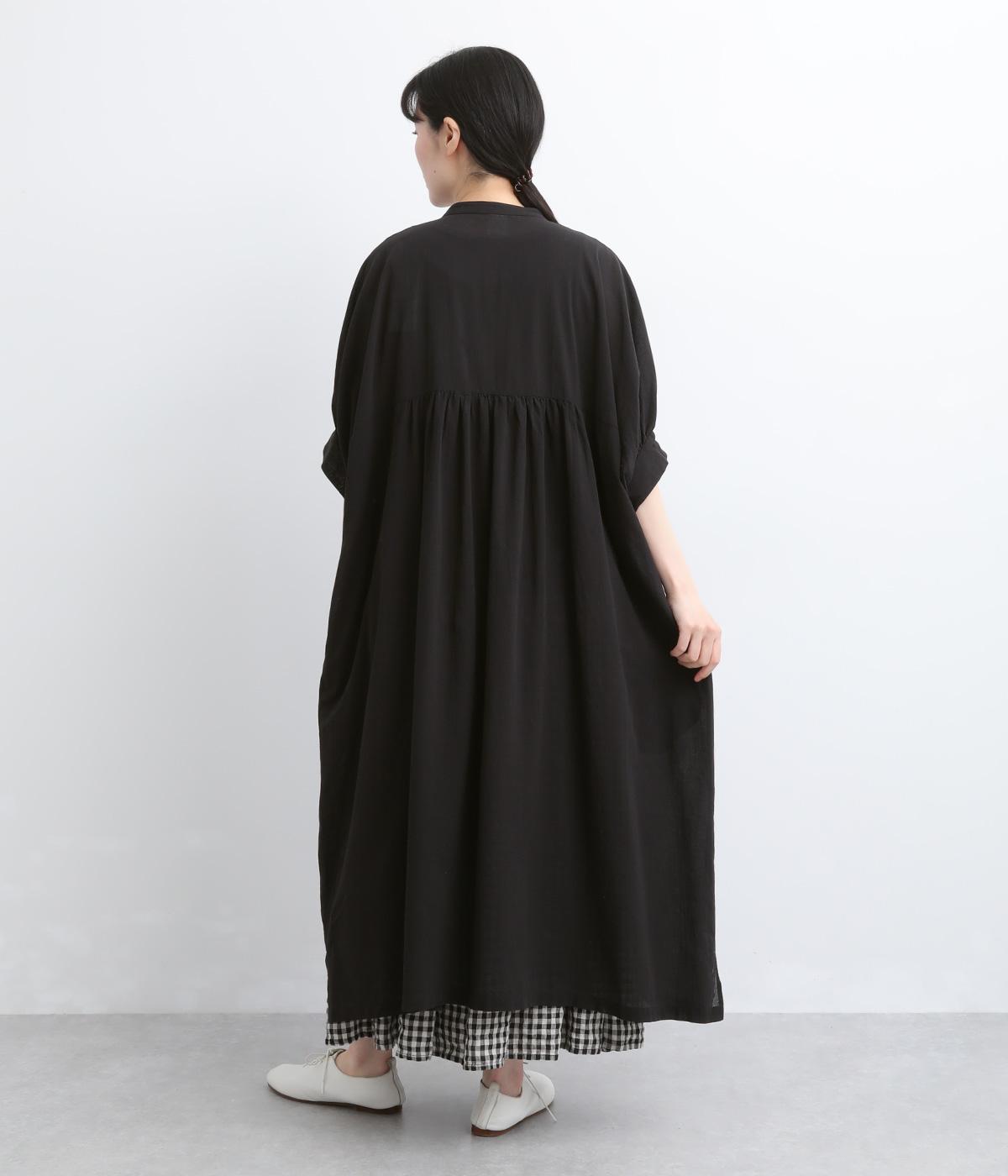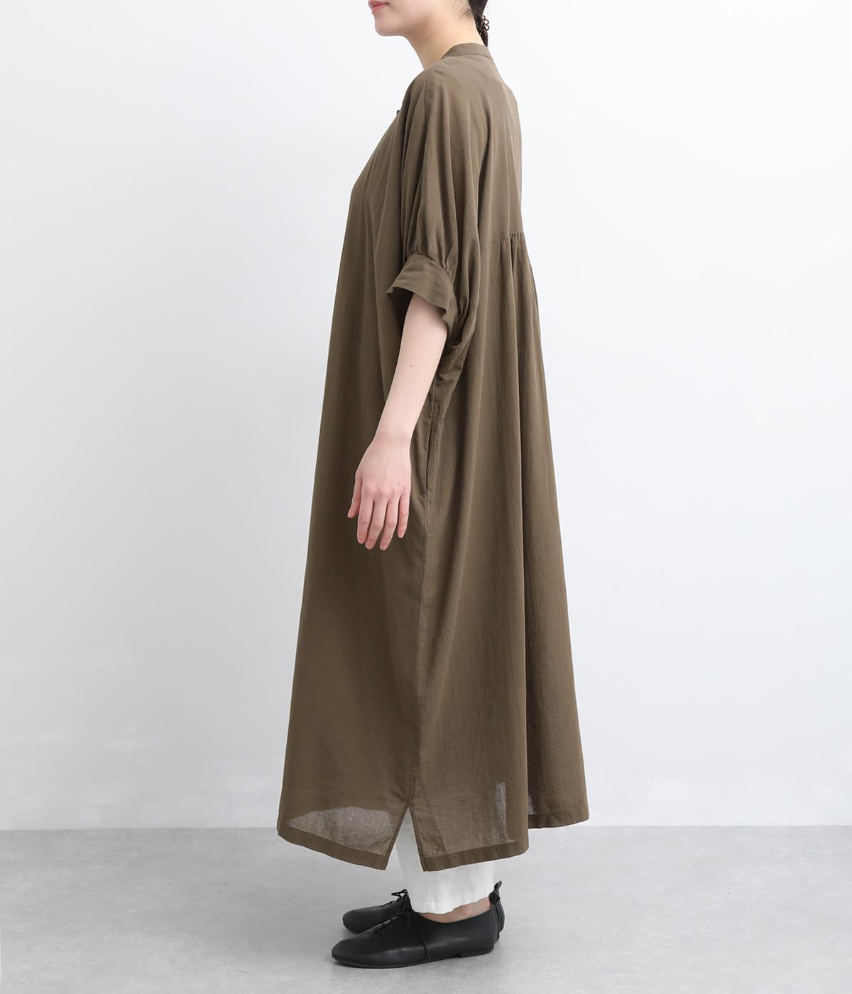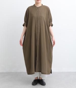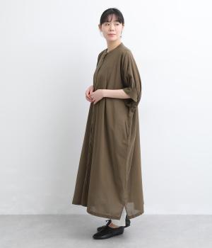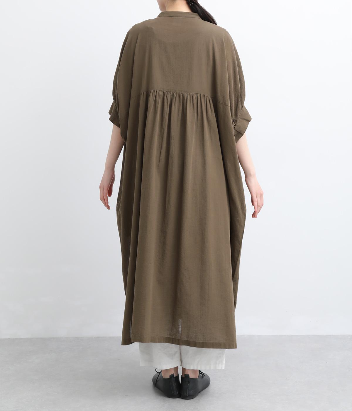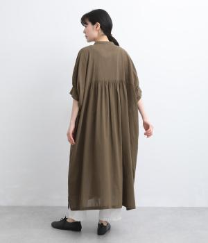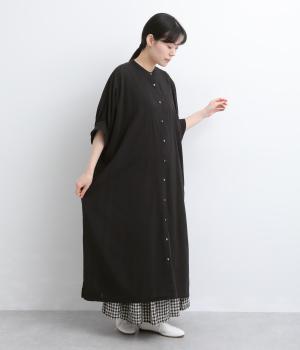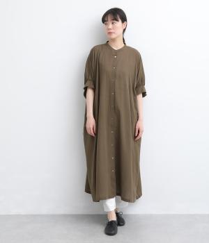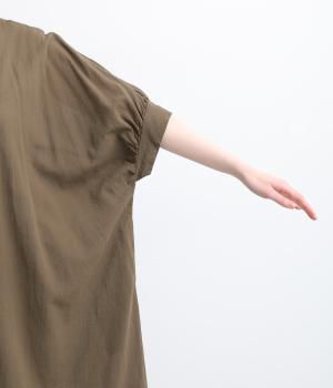 ゆったりとしたドルマンスリーブが印象的なワンピースです。肩のラインをなだらかに見せつつ、自然な落ち感ですっきりとしたシルエットに仕上げました。たっぷりとした身幅ながら広がりすぎず、落ちついた佇まいに。前をあけて、ロングガウンのように羽織る着こなしもおすすめです。
