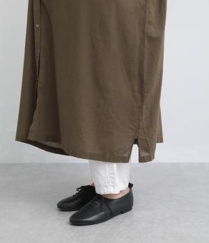 さらりとした軽い肌ざわりのシングルガーゼ素材を使用。シャリ感のあるドライなタッチではりつきにくく、汗ばむ季節も快適です。シアー感のある軽やかな風合いと、シワの表情が奥行きを添え、ナチュラルな雰囲気をたのしめます。