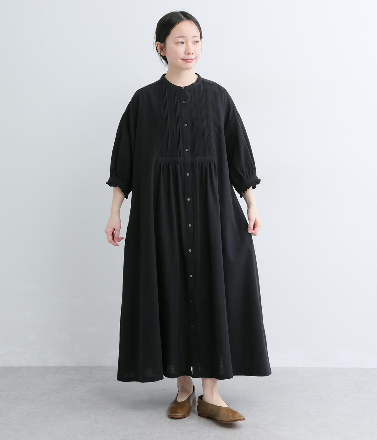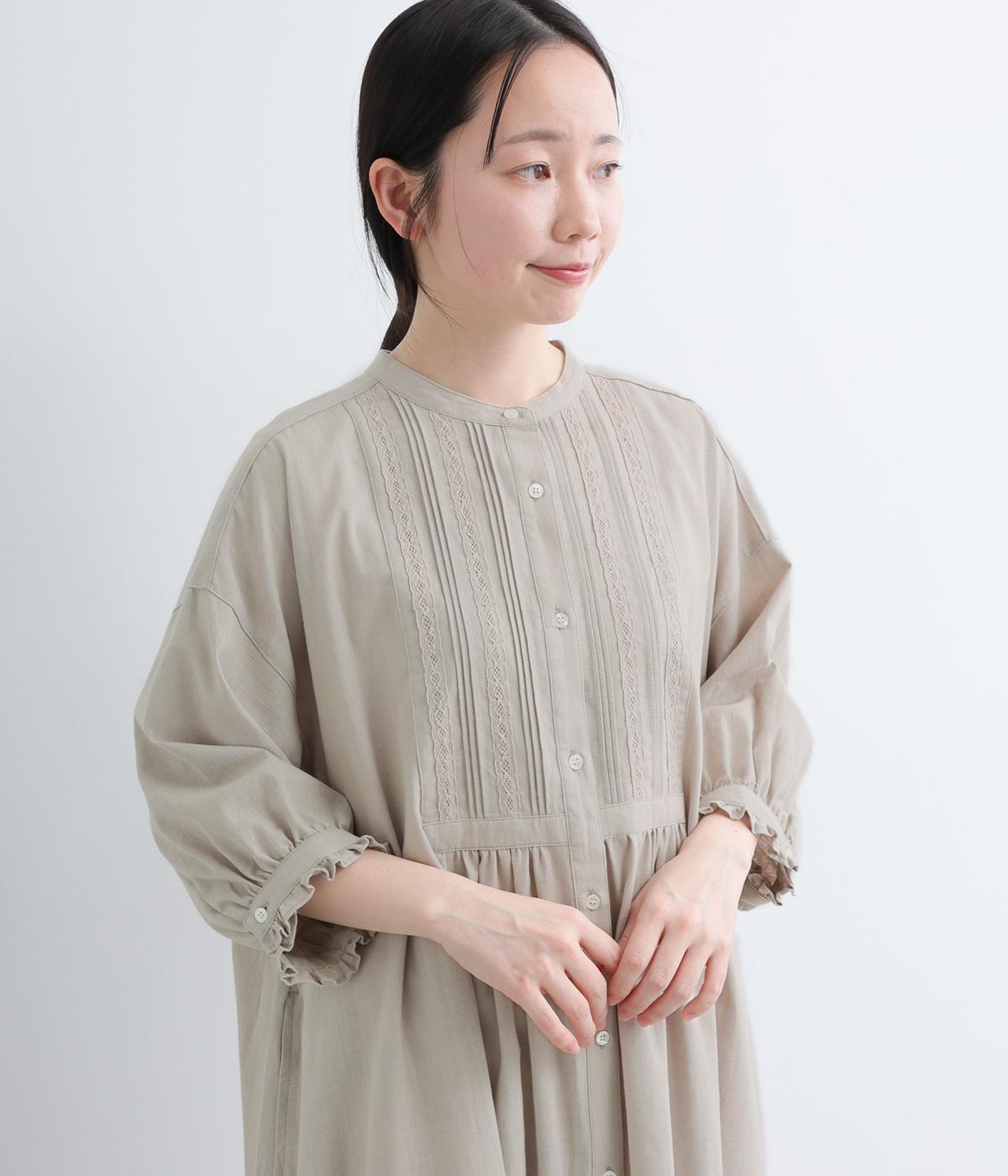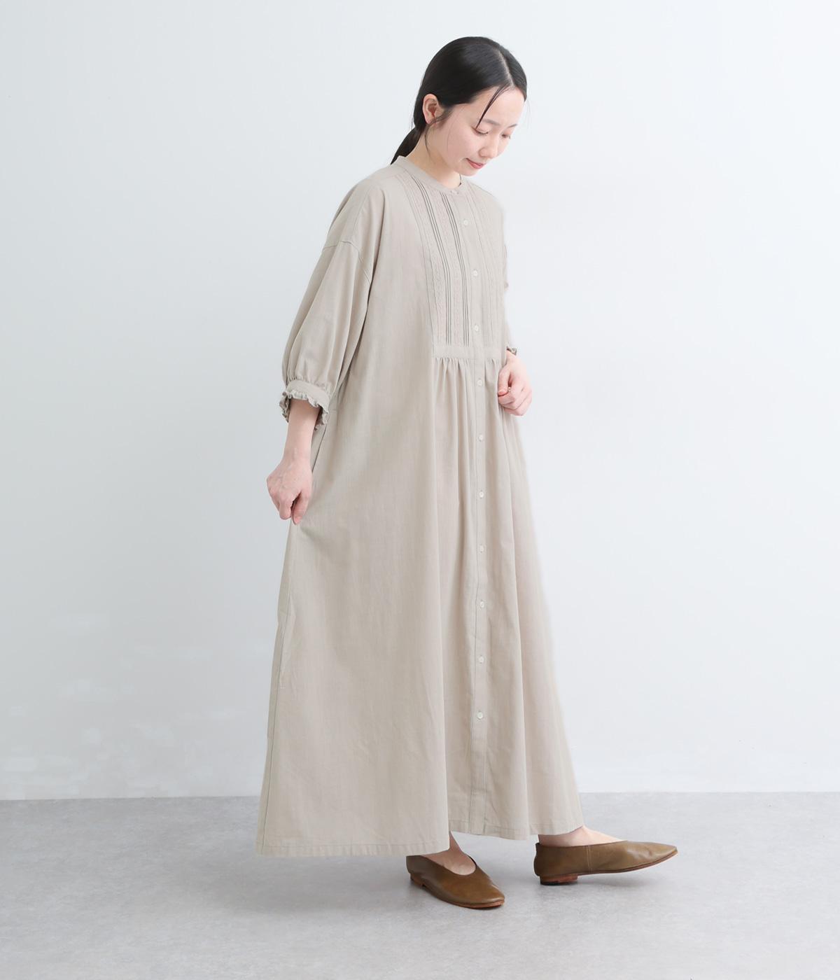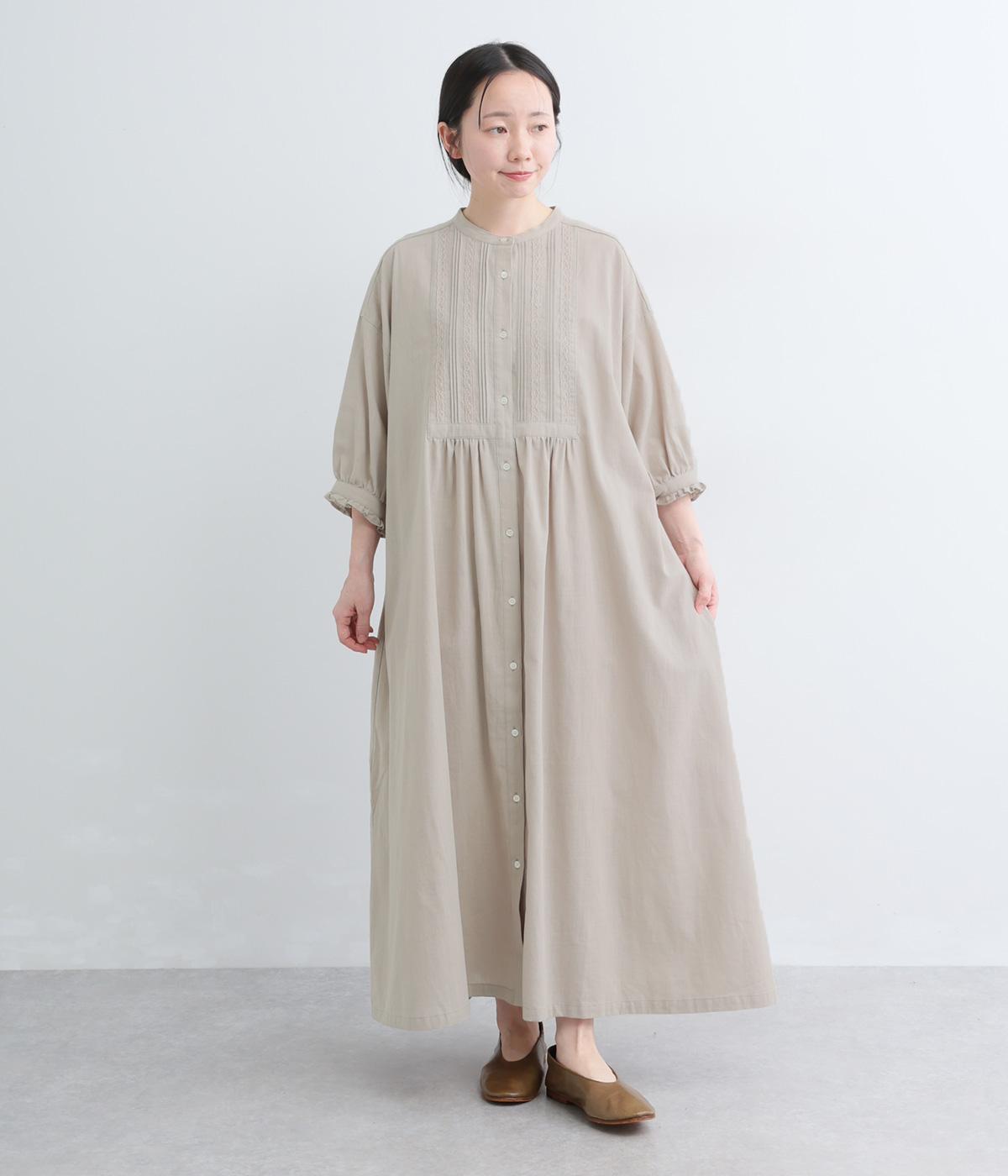 前身頃のレースやピンタック、袖口のフリルが大人の佇まいを演出します。肘が隠れる七分袖が落ち着いた印象を添え、天然素材の風合いが甘さを抑制。凛とした可愛らしさをまとう、装いの主役になるワンピースです。