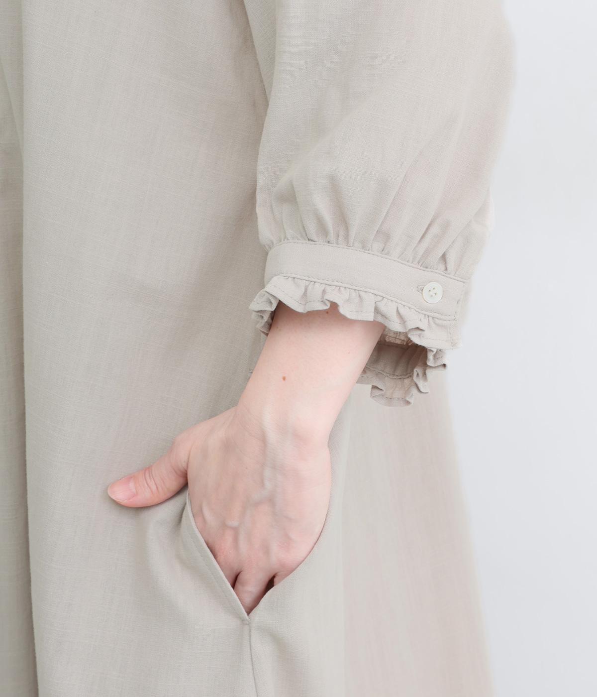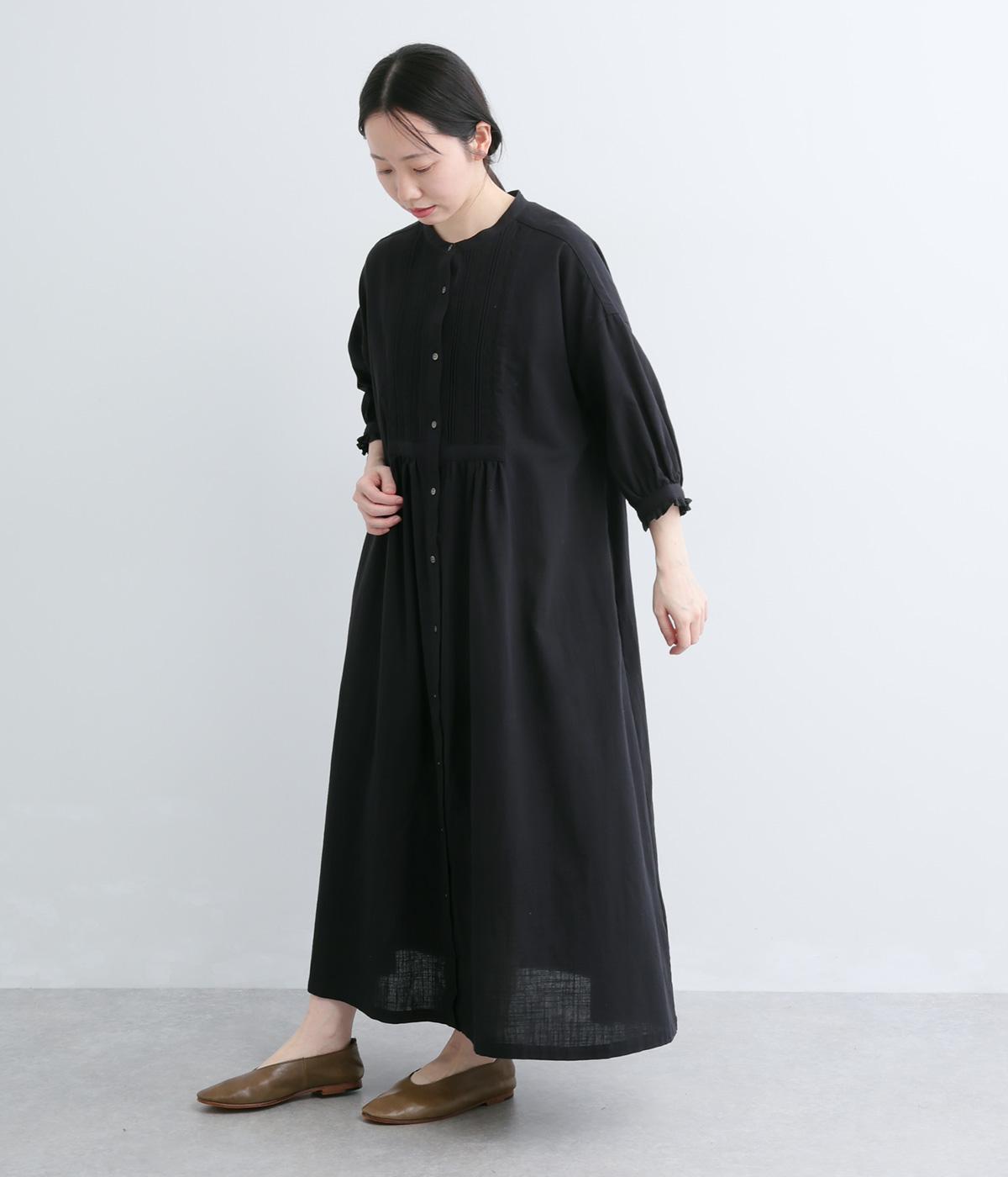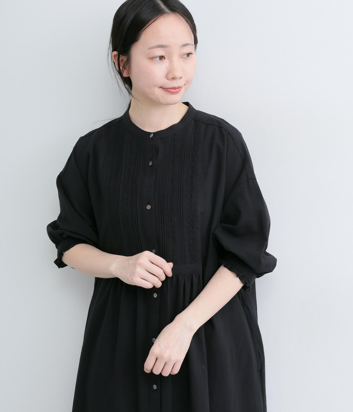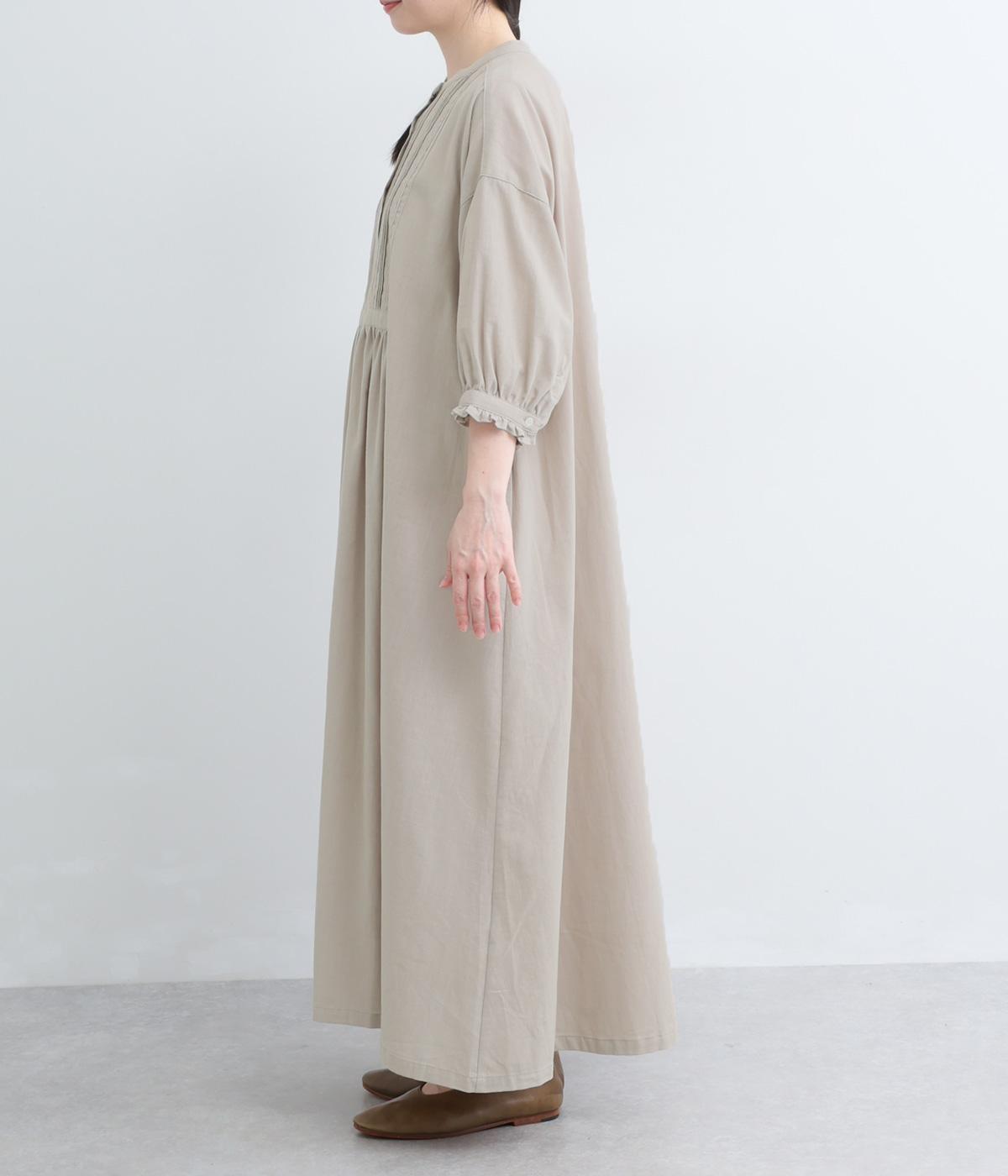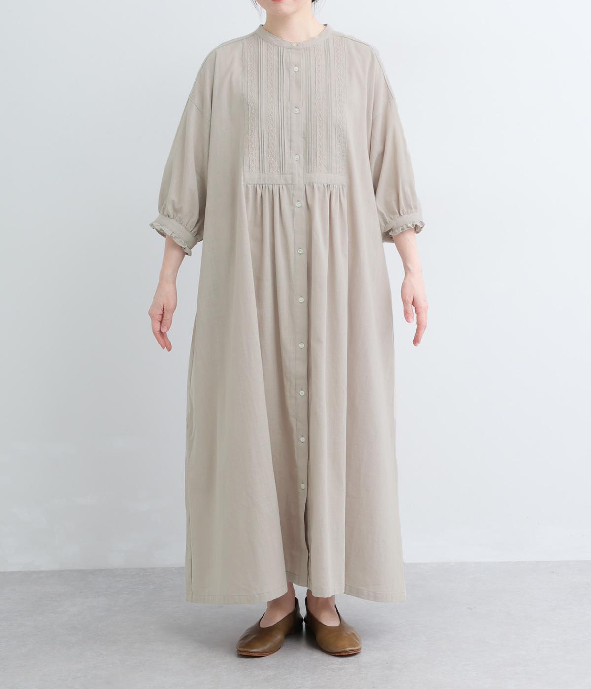 前身頃のレースやピンタック、袖口のフリルが大人の佇まいを演出します。肘が隠れる七分袖が落ち着いた印象を添え、天然素材の風合いが甘さを抑制。凛とした可愛らしさをまとう、装いの主役になるワンピースです。