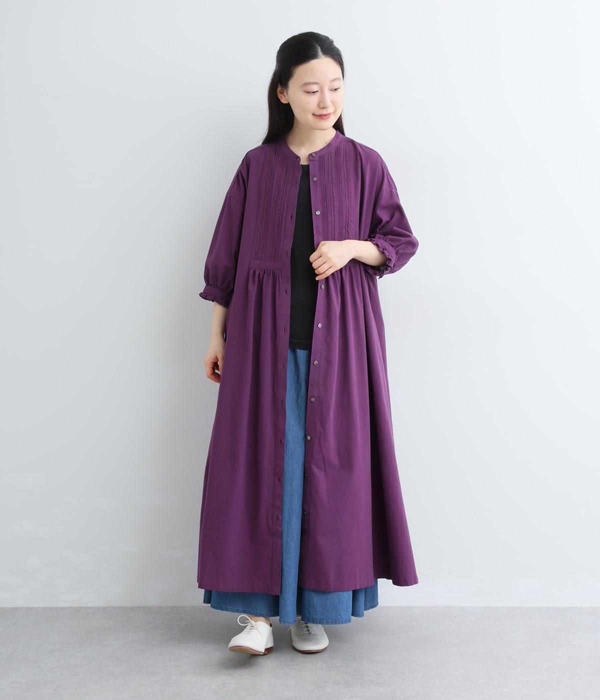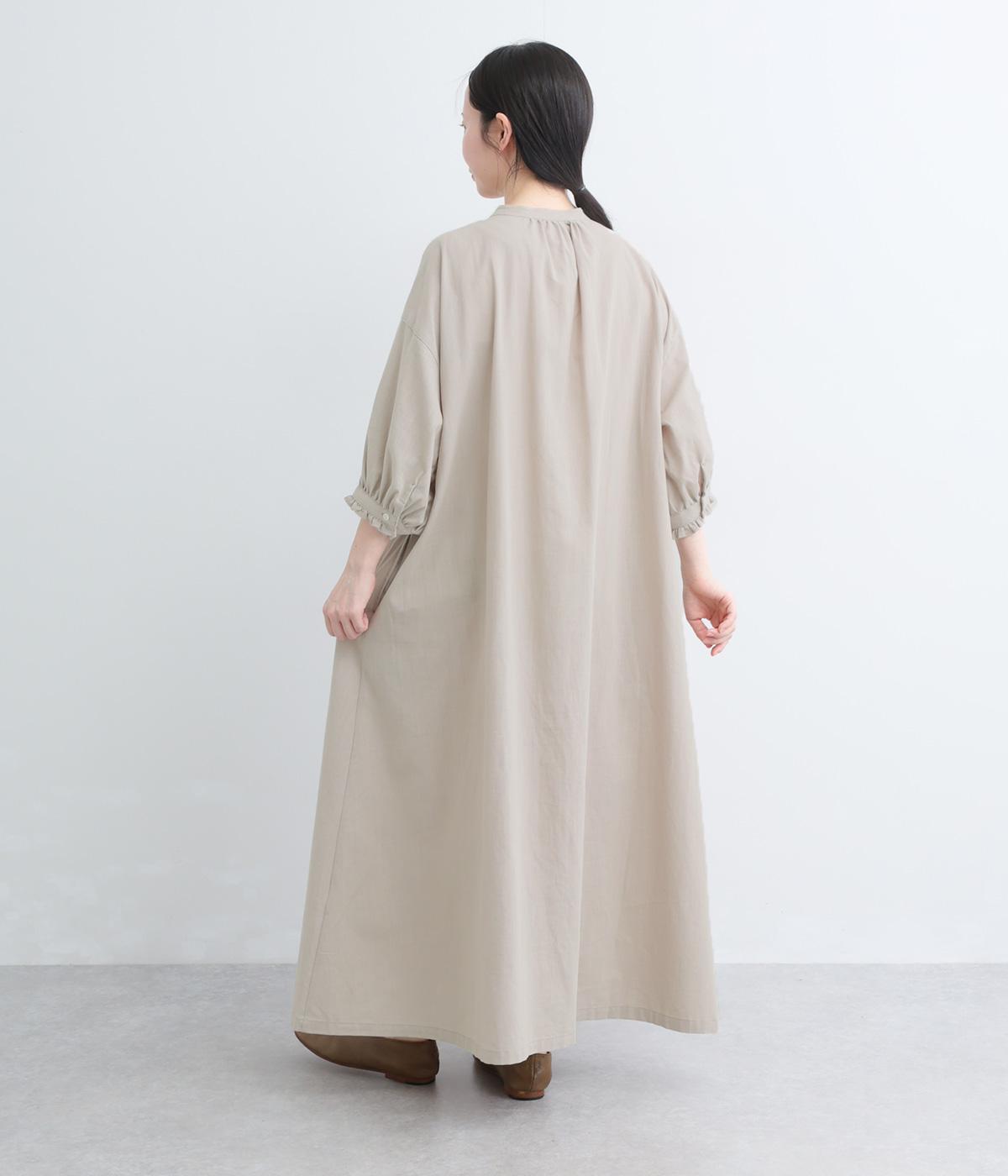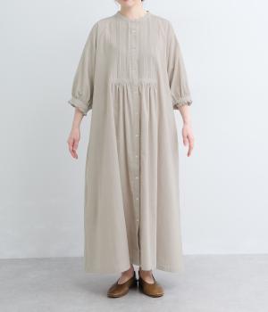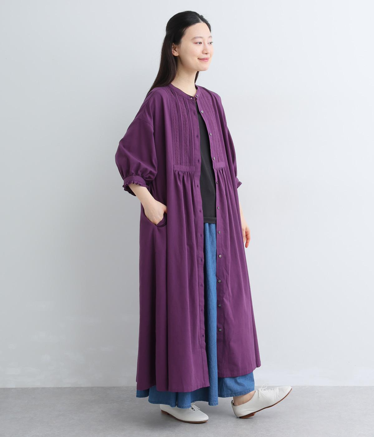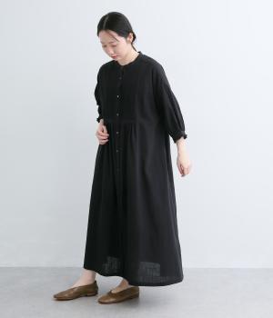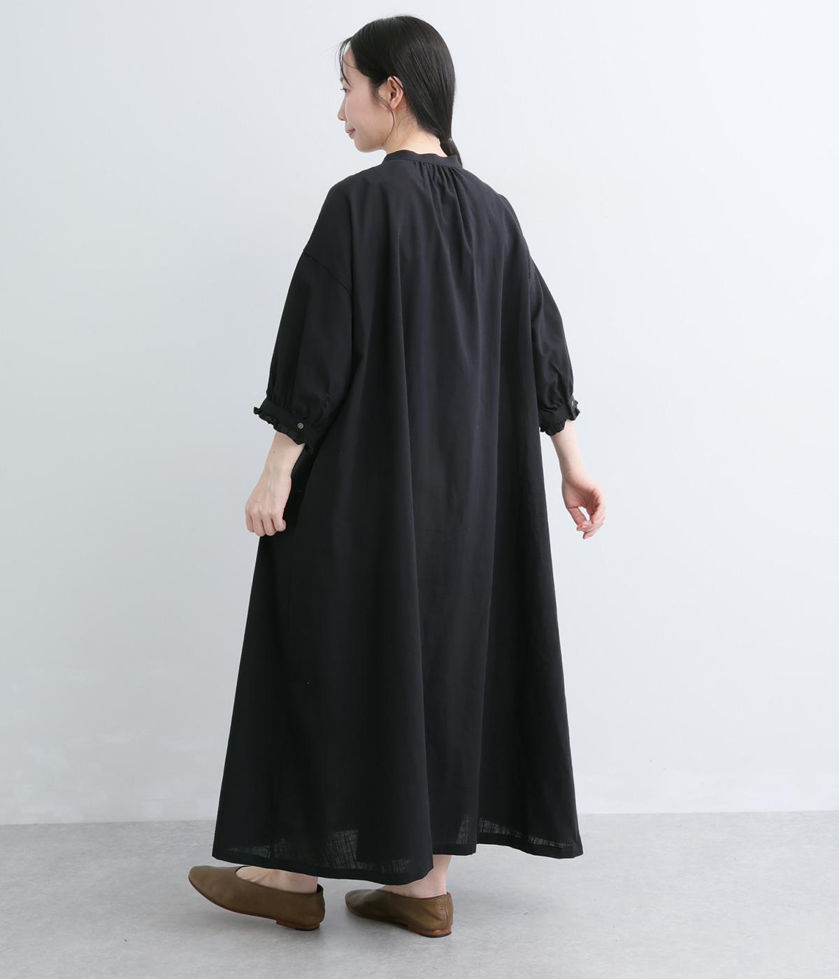 前身頃のレースやピンタック、袖口のフリルが大人の佇まいを演出します。肘が隠れる七分袖が落ち着いた印象を添え、天然素材の風合いが甘さを抑制。凛とした可愛らしさをまとう、装いの主役になるワンピースです。