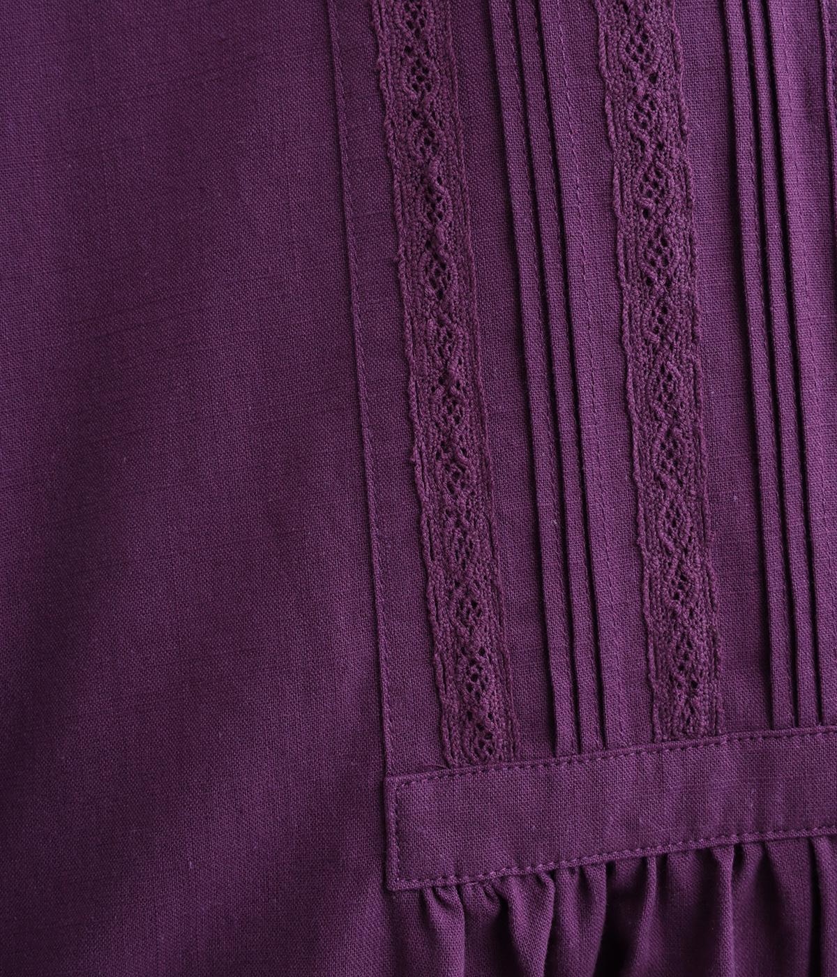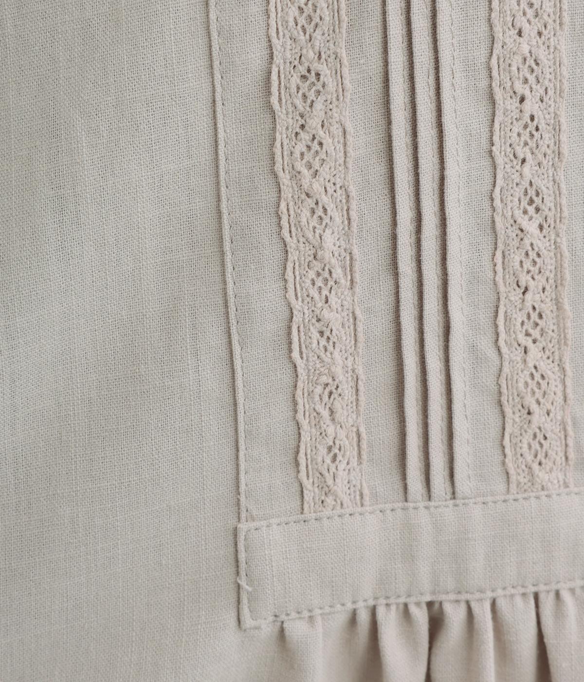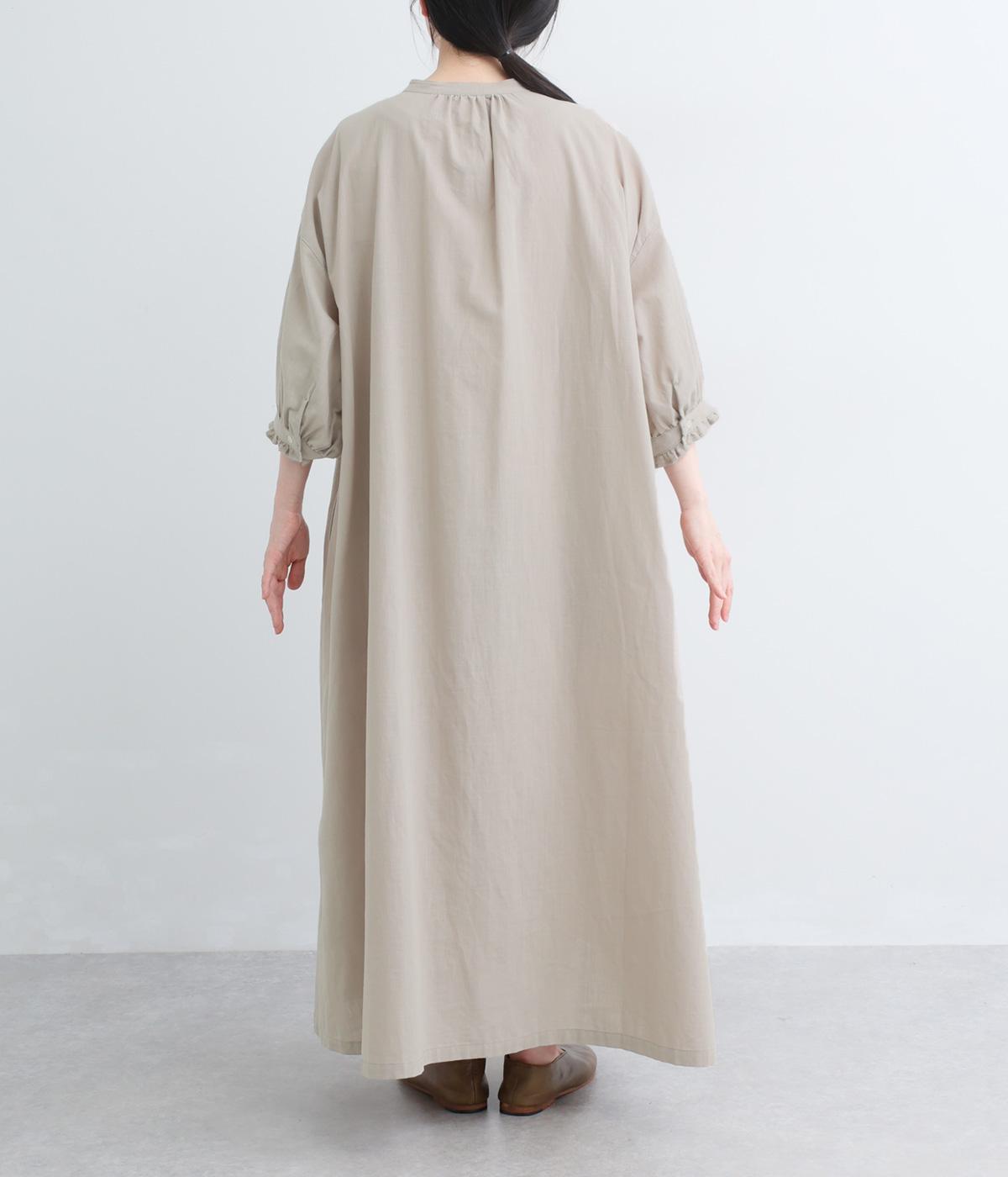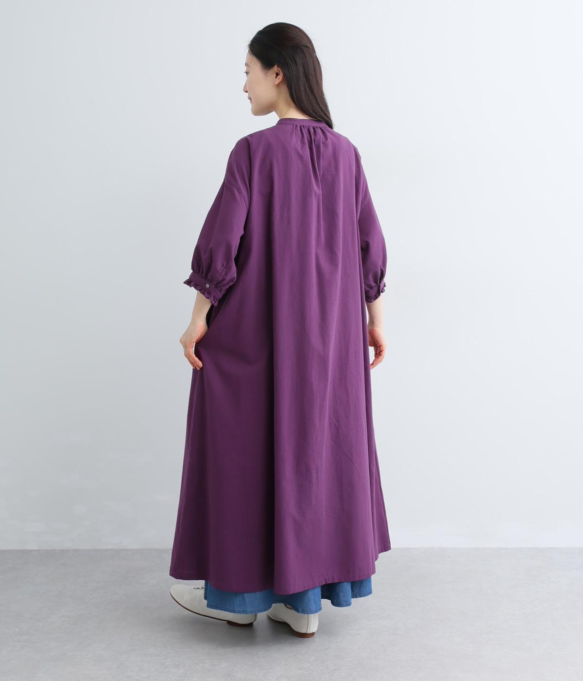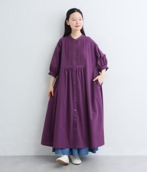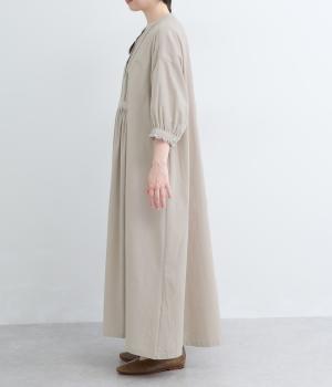 前身頃のレースやピンタック、袖口のフリルが大人の佇まいを演出します。肘が隠れる七分袖が落ち着いた印象を添え、天然素材の風合いが甘さを抑制。凛とした可愛らしさをまとう、装いの主役になるワンピースです。