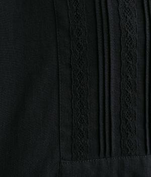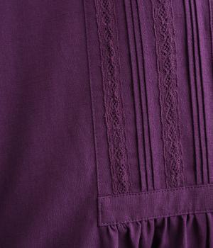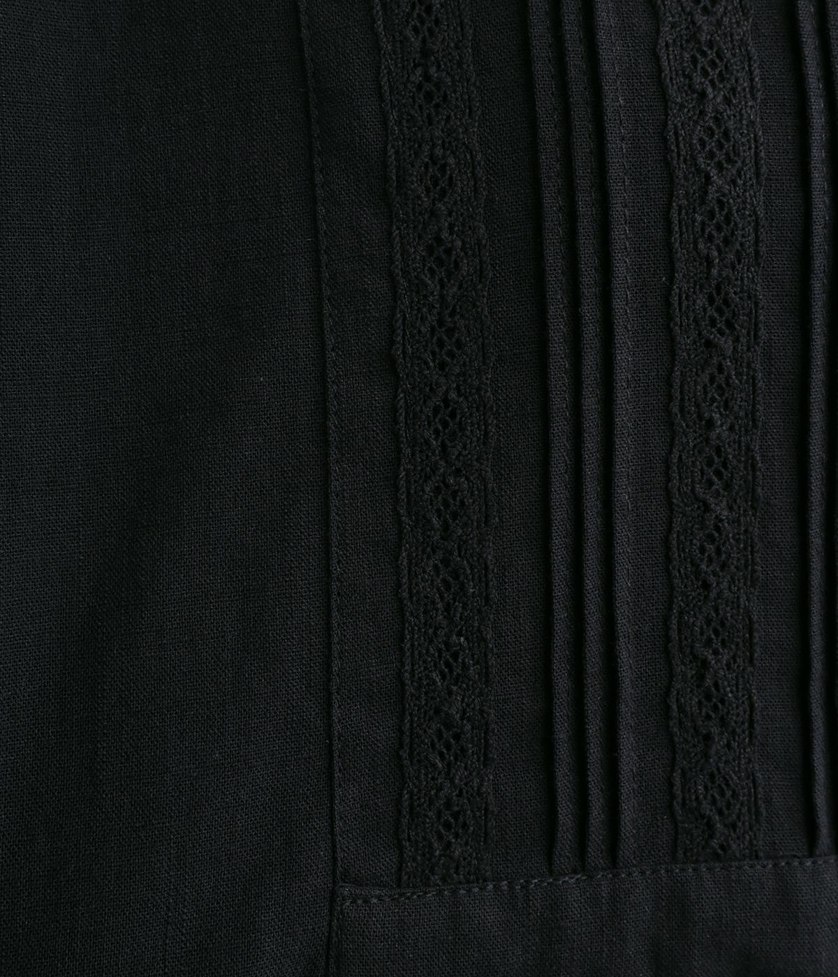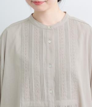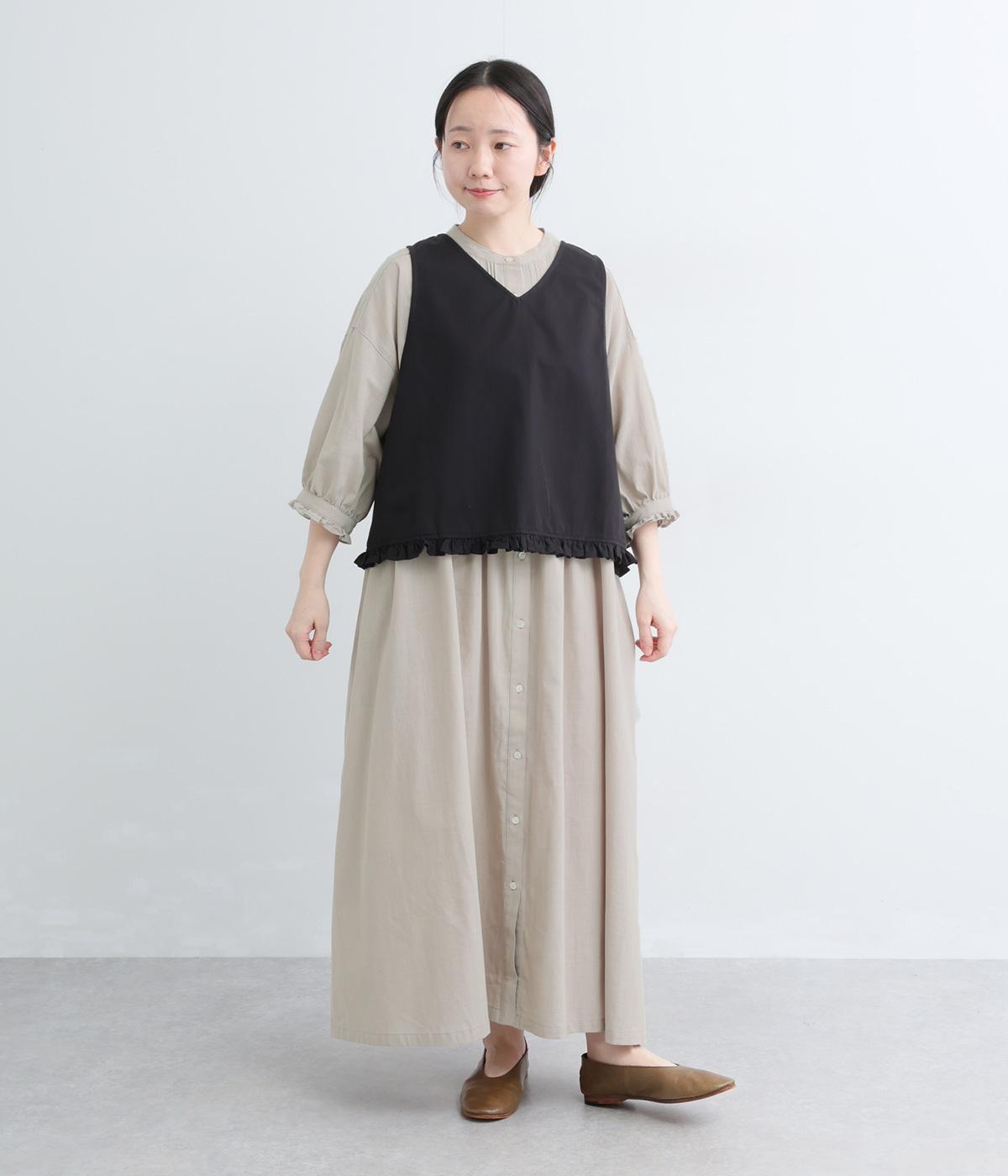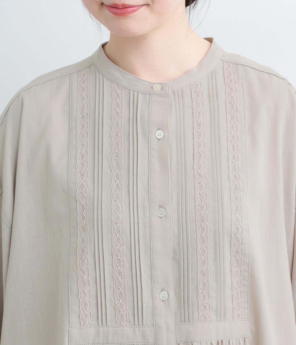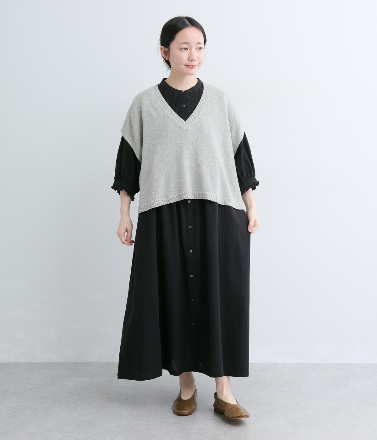 前身頃のレースやピンタック、袖口のフリルが大人の佇まいを演出します。肘が隠れる七分袖が落ち着いた印象を添え、天然素材の風合いが甘さを抑制。凛とした可愛らしさをまとう、装いの主役になるワンピースです。