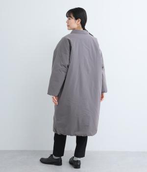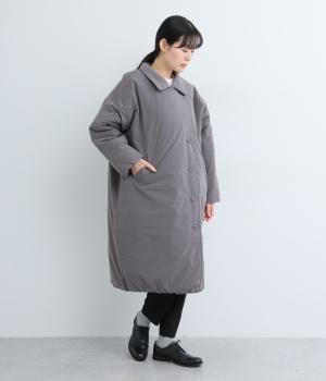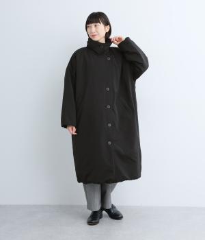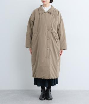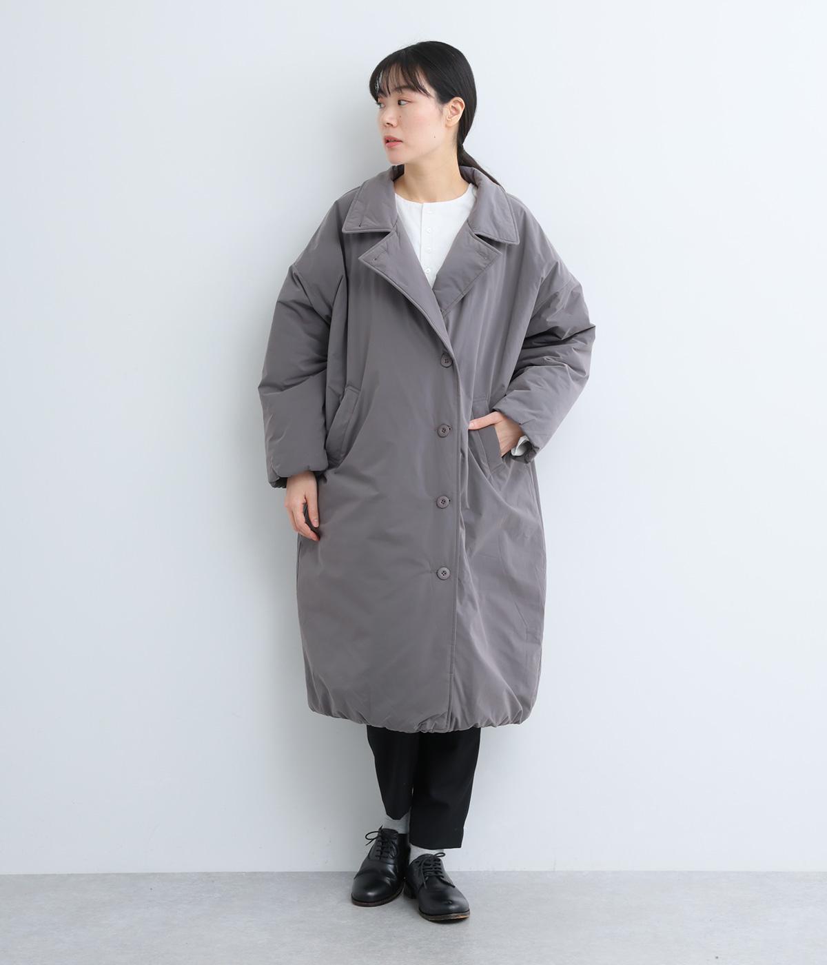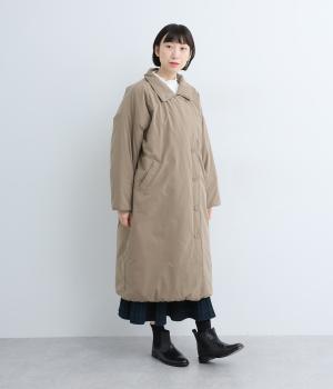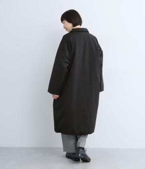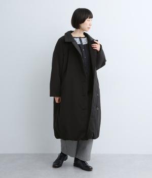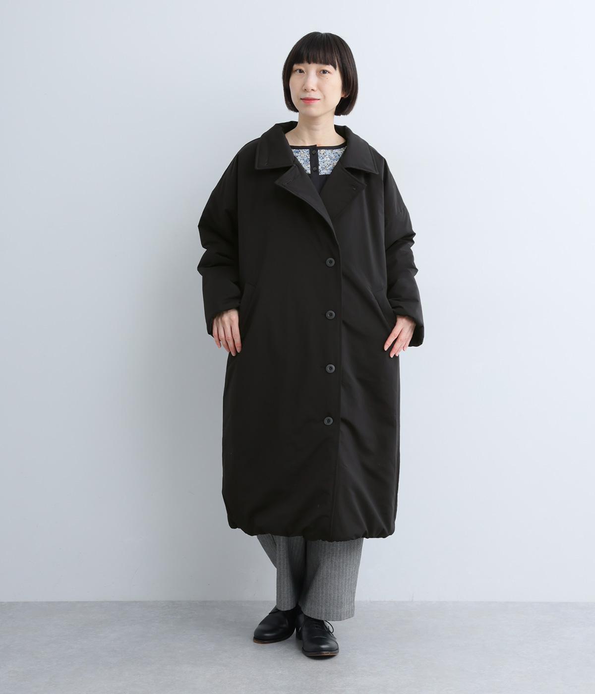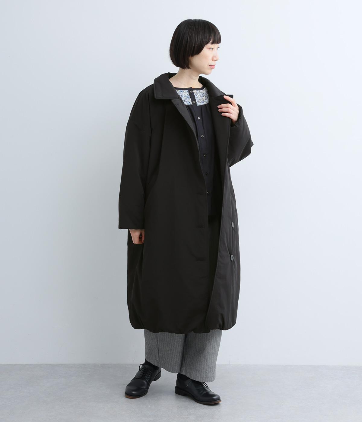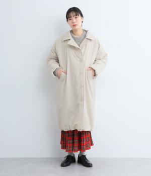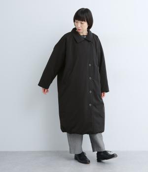 襟つき前ボタンの中綿入りロングコート。袖口と裾はシャーリング仕様で丸みのあるシルエットが作れます。身幅はゆとりがあり、厚手のニットなどもしっかり着こみやすいサイズ感。衿の形が3パターンアレンジでき、表情を変えられます。