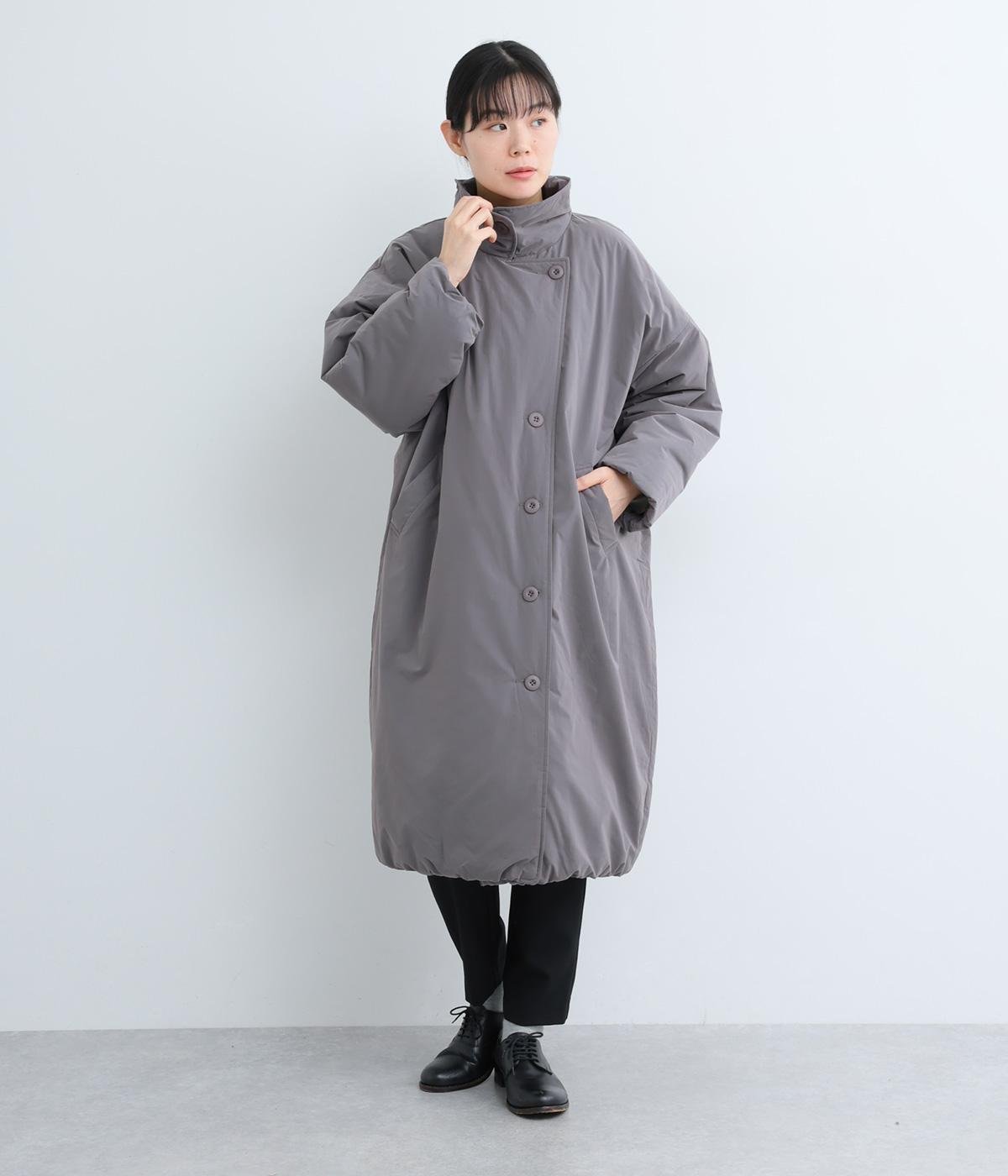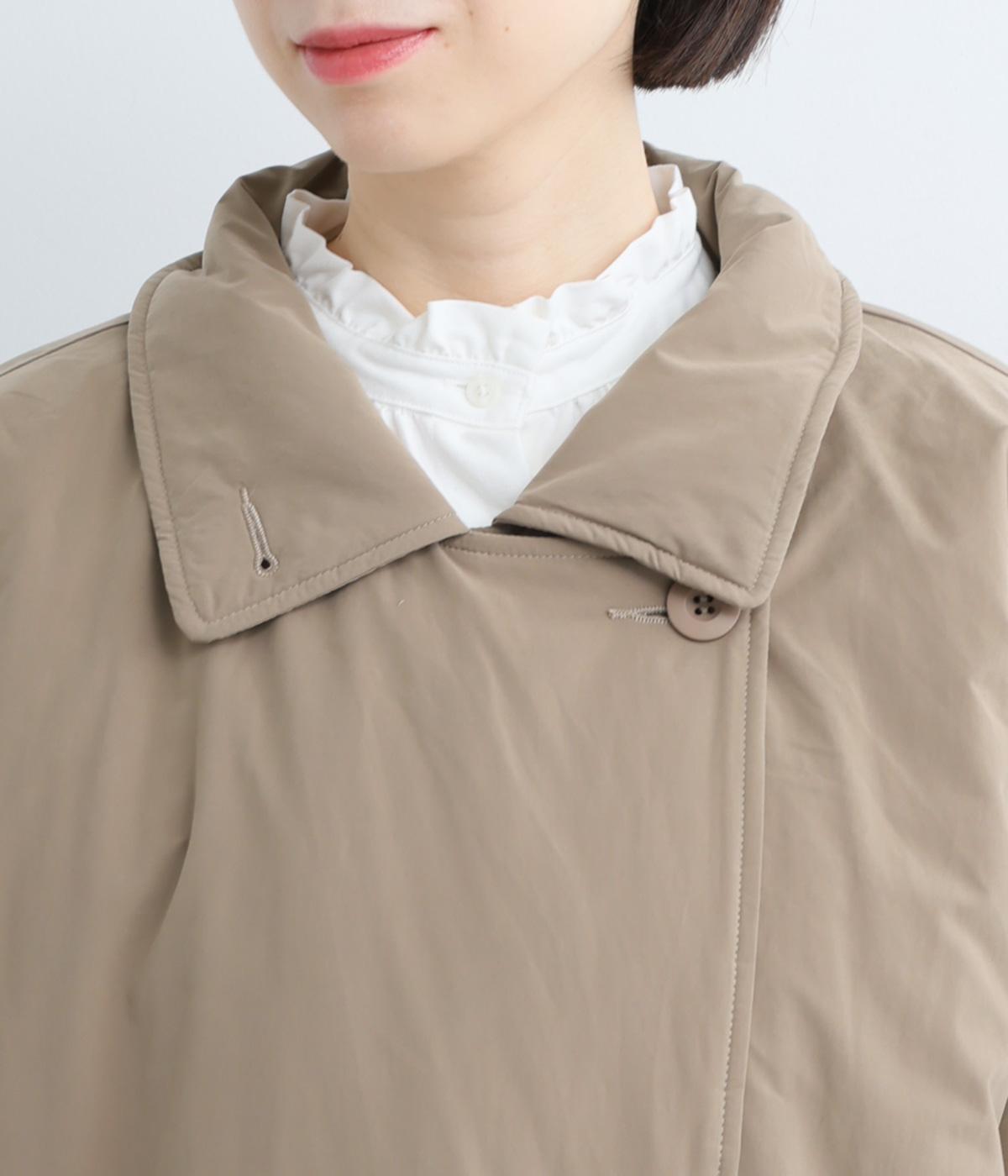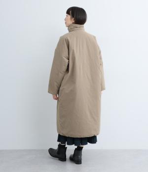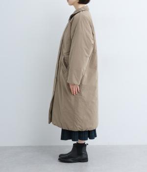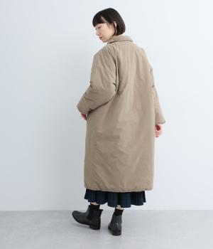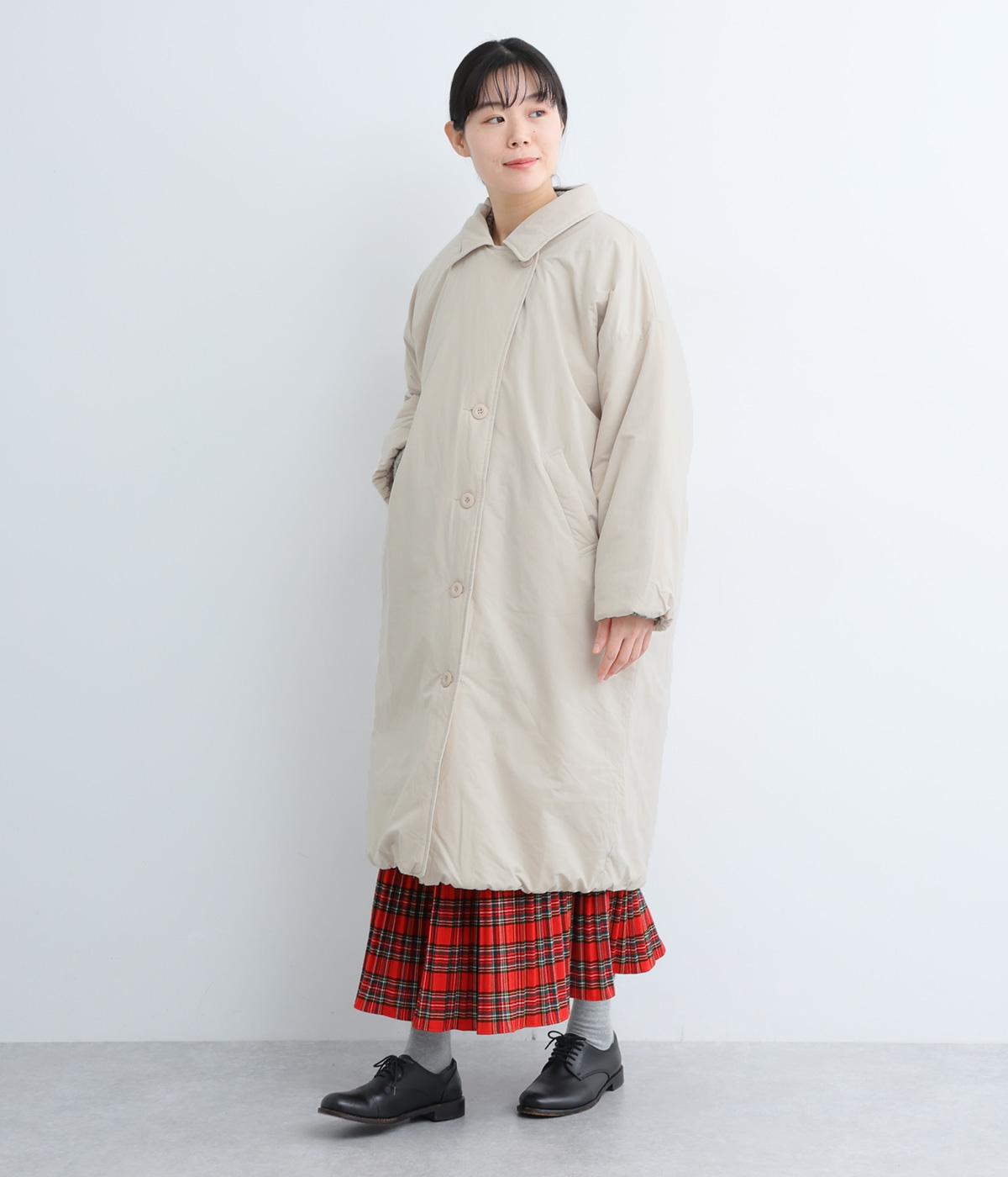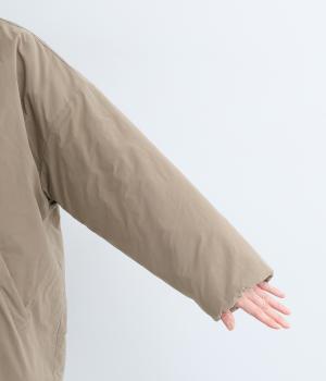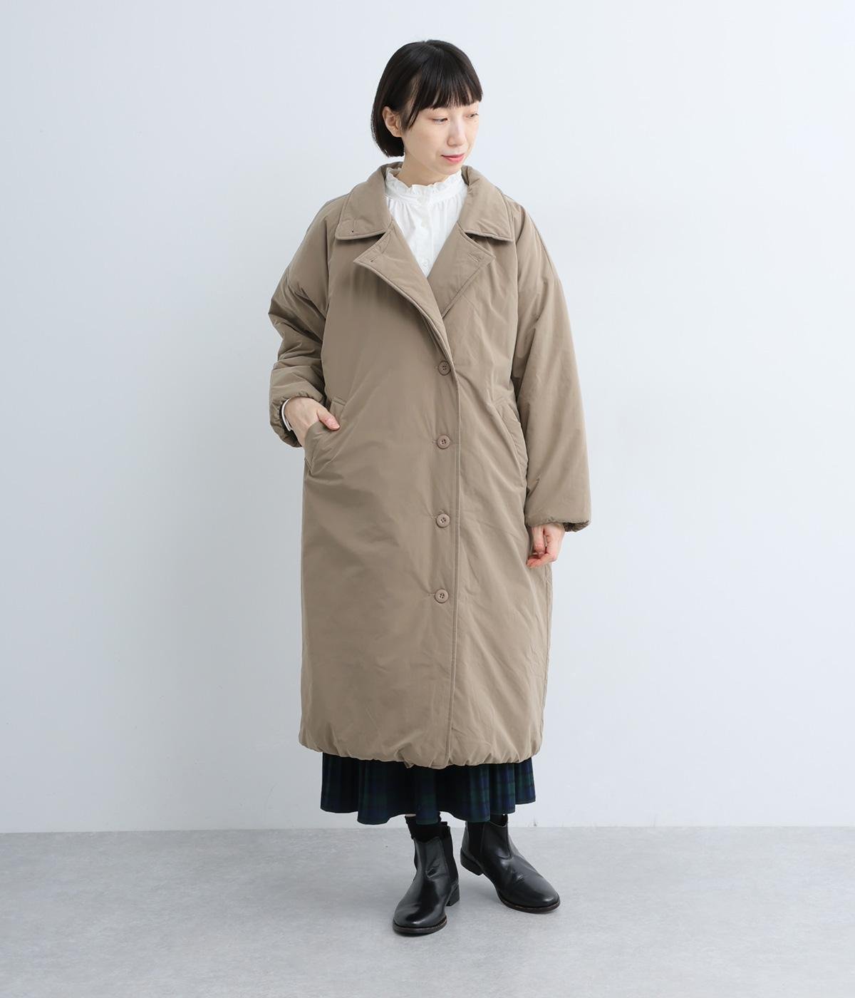 襟つき前ボタンの中綿入りロングコート。袖口と裾はシャーリング仕様で丸みのあるシルエットが作れます。身幅はゆとりがあり、厚手のニットなどもしっかり着こみやすいサイズ感。衿の形が3パターンアレンジでき、表情を変えられます。