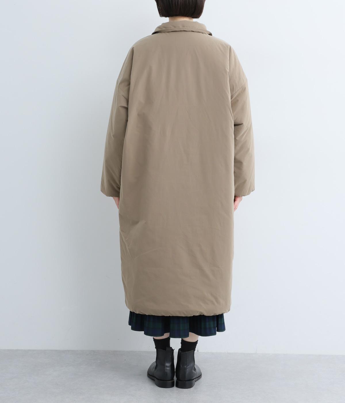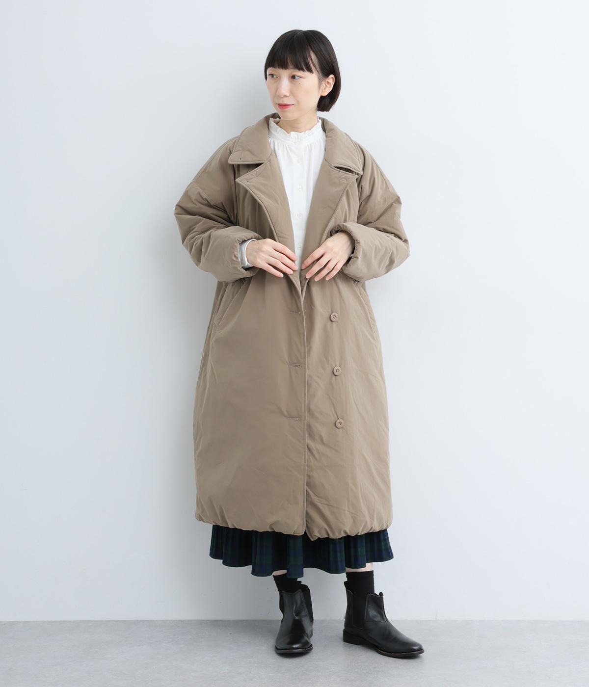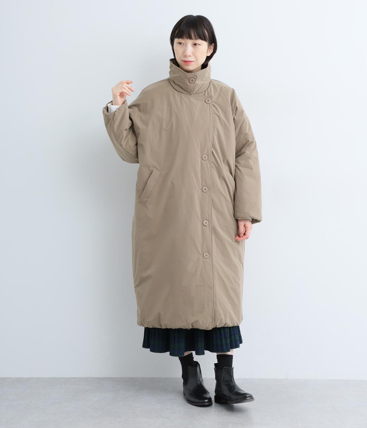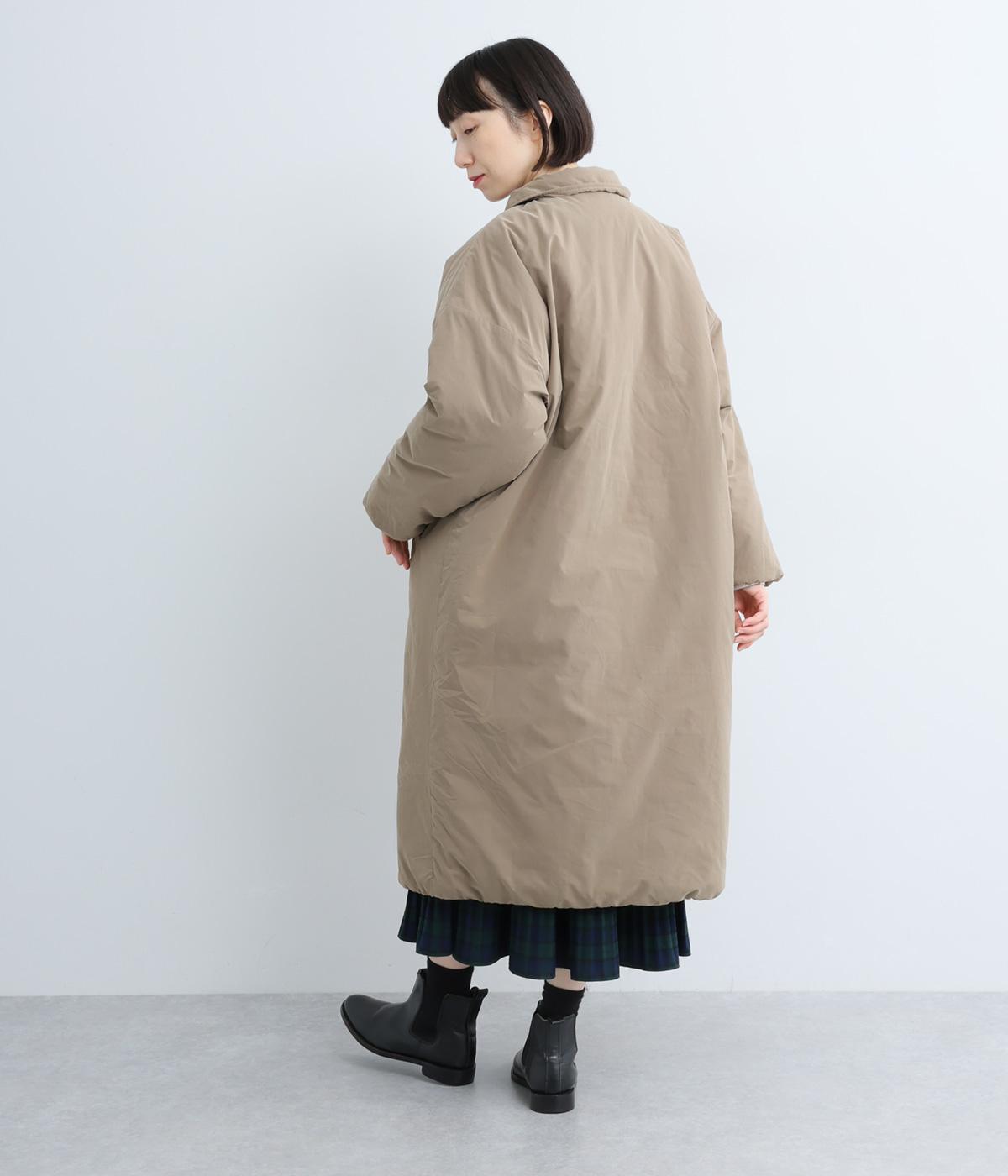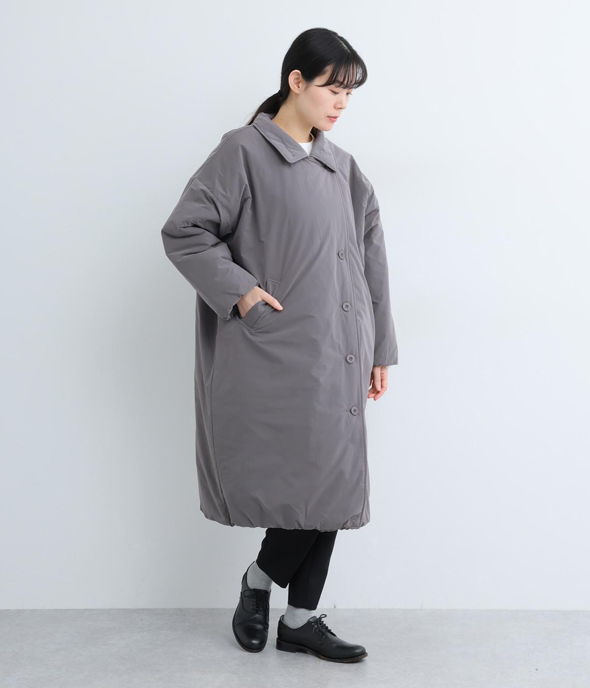 襟つき前ボタンの中綿入りロングコート。袖口と裾はシャーリング仕様で丸みのあるシルエットが作れます。身幅はゆとりがあり、厚手のニットなどもしっかり着こみやすいサイズ感。衿の形が3パターンアレンジでき、表情を変えられます。