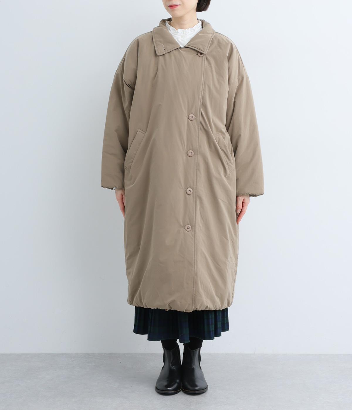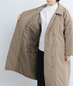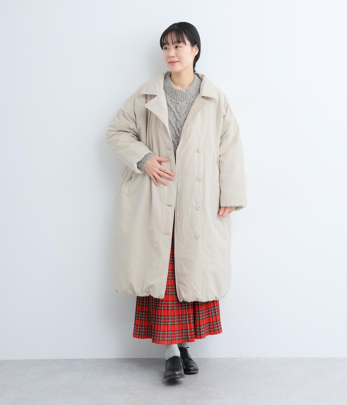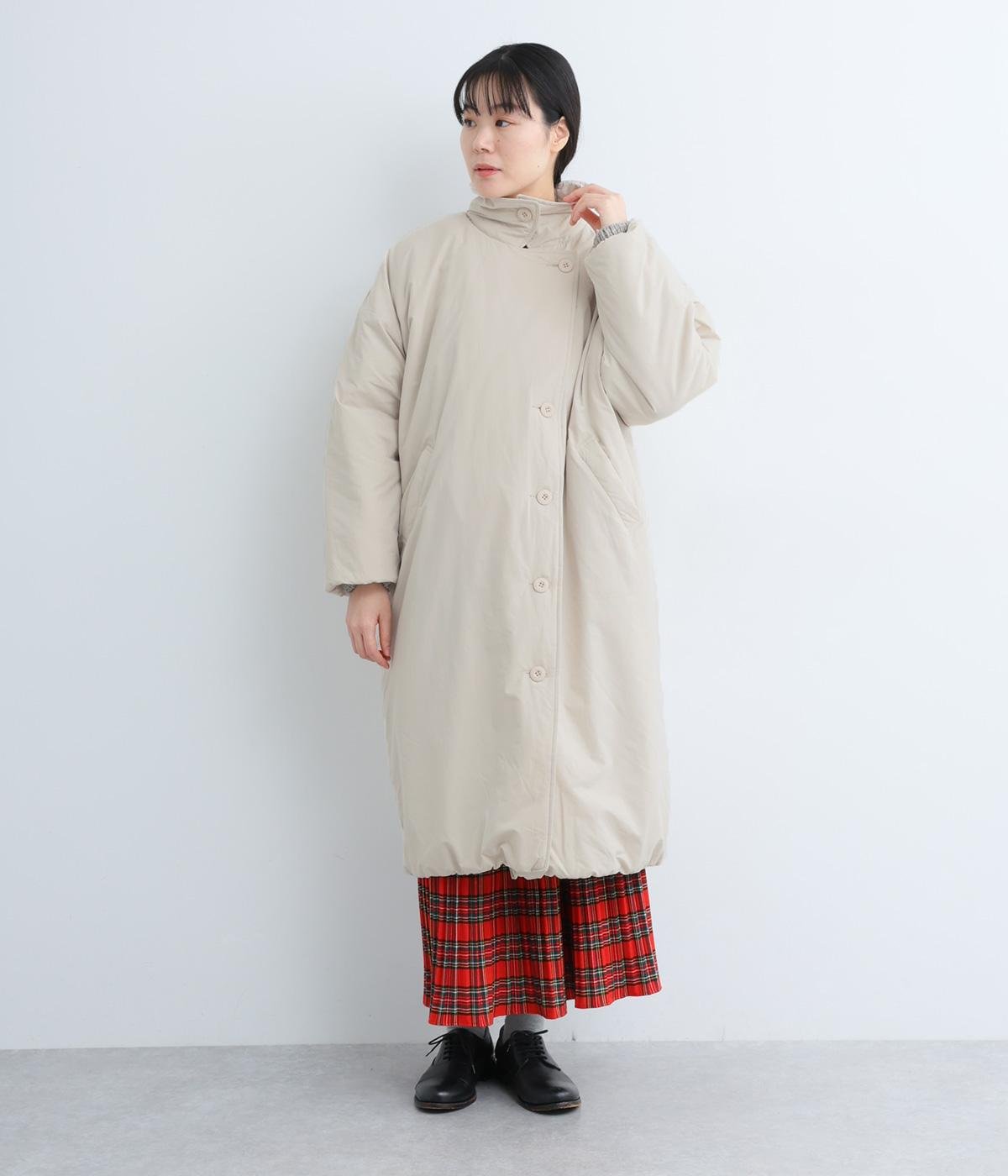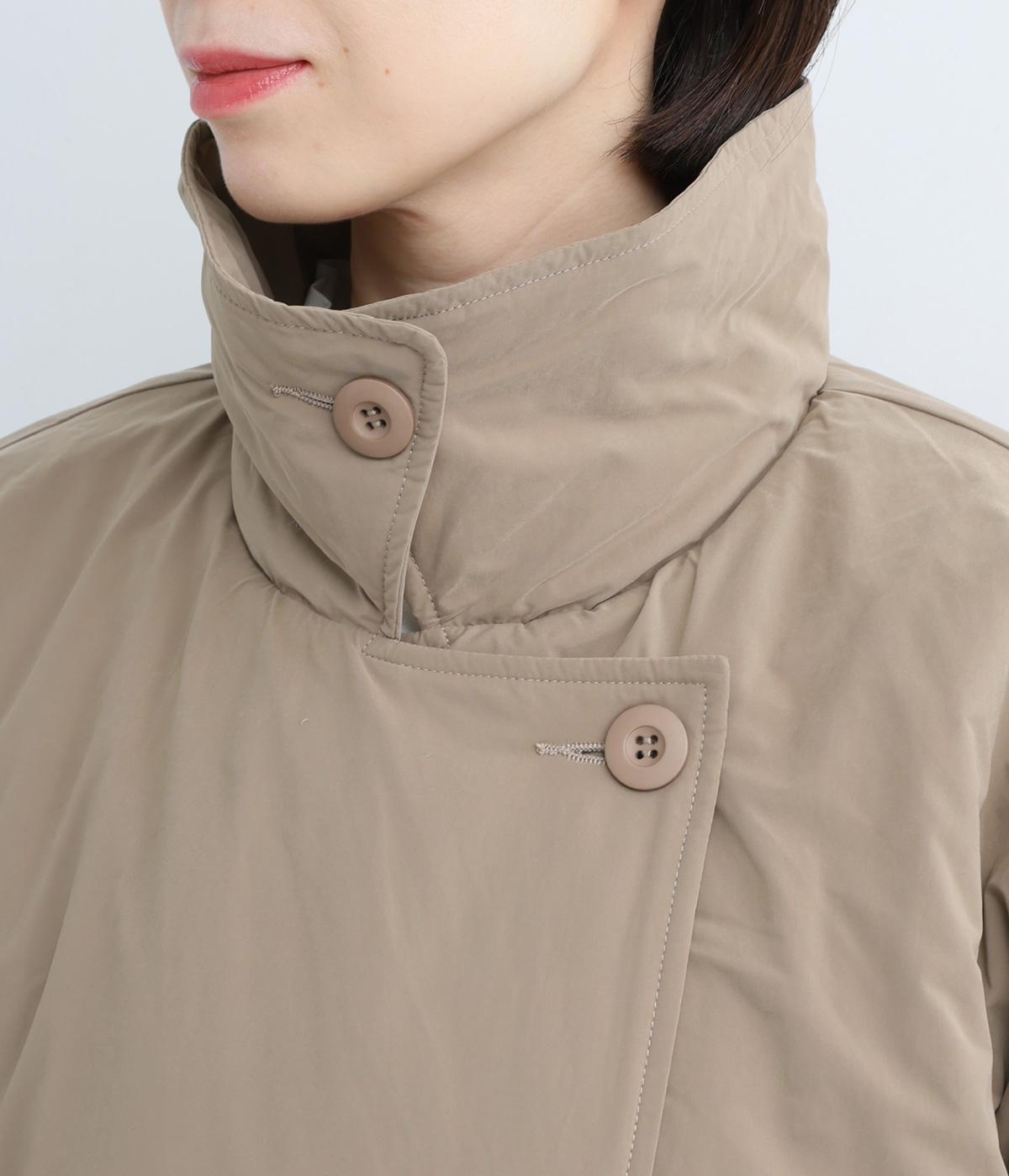 襟つき前ボタンの中綿入りロングコート。袖口と裾はシャーリング仕様で丸みのあるシルエットが作れます。身幅はゆとりがあり、厚手のニットなどもしっかり着こみやすいサイズ感。衿の形が3パターンアレンジでき、表情を変えられます。