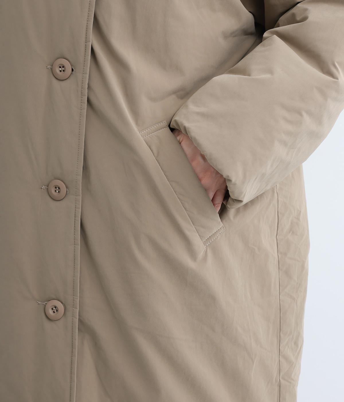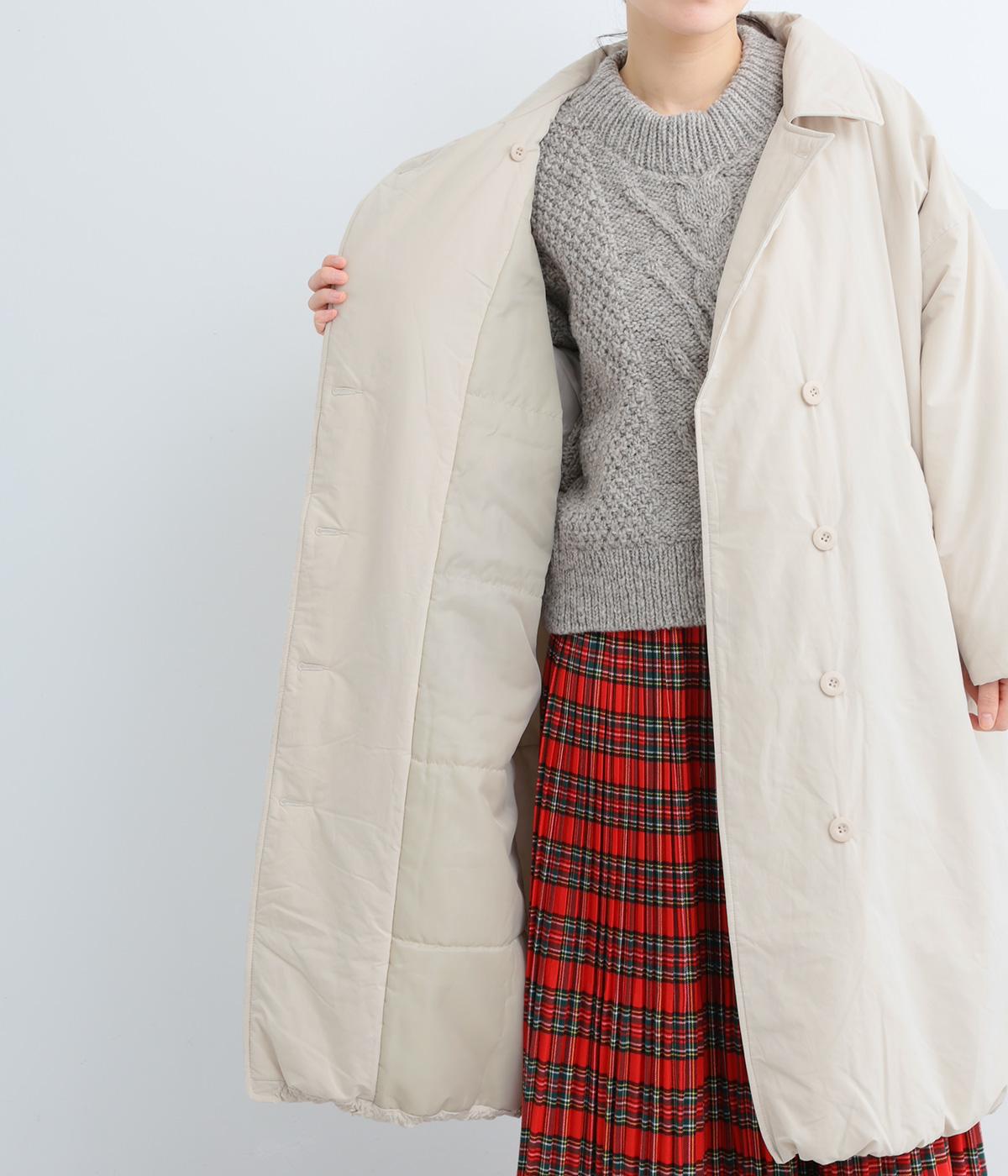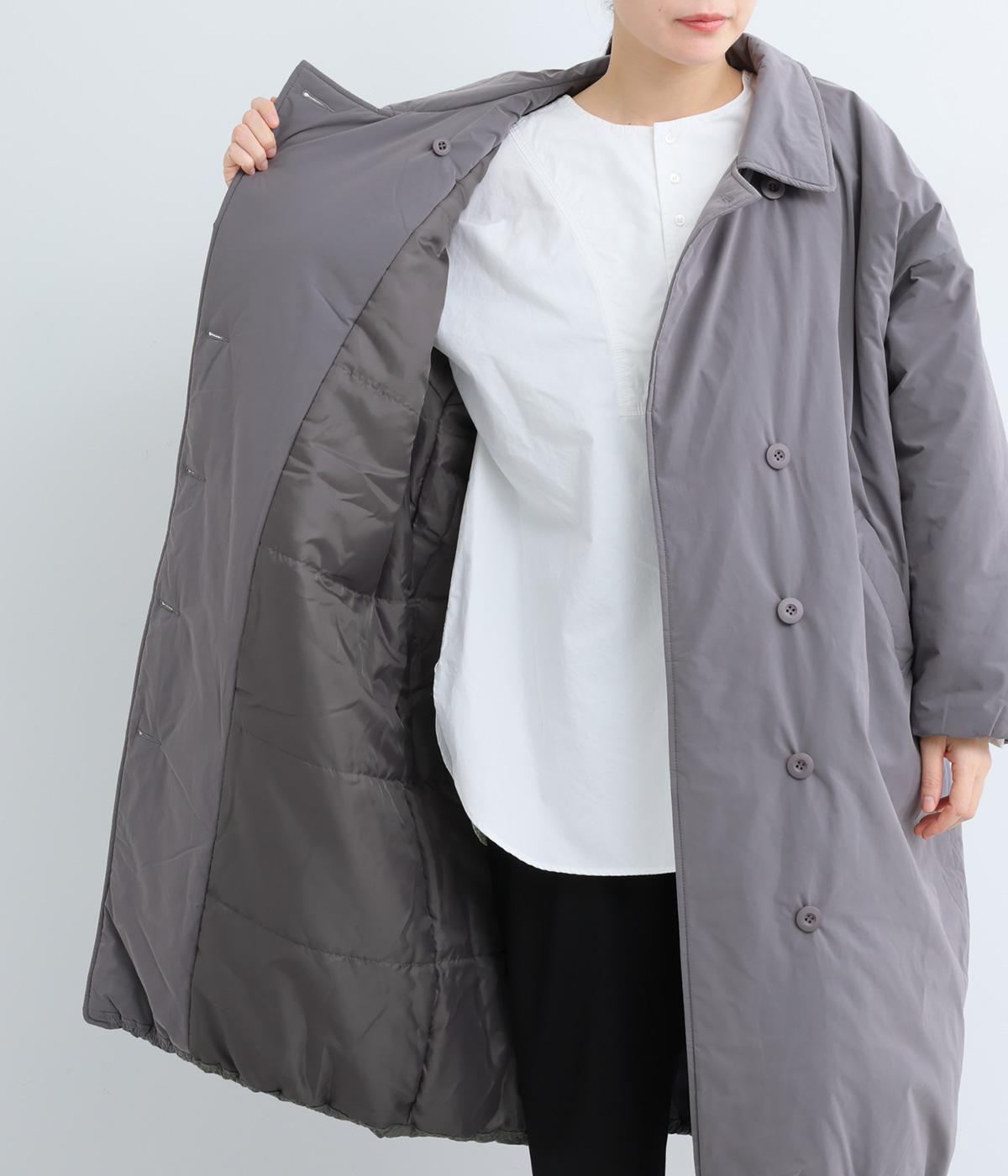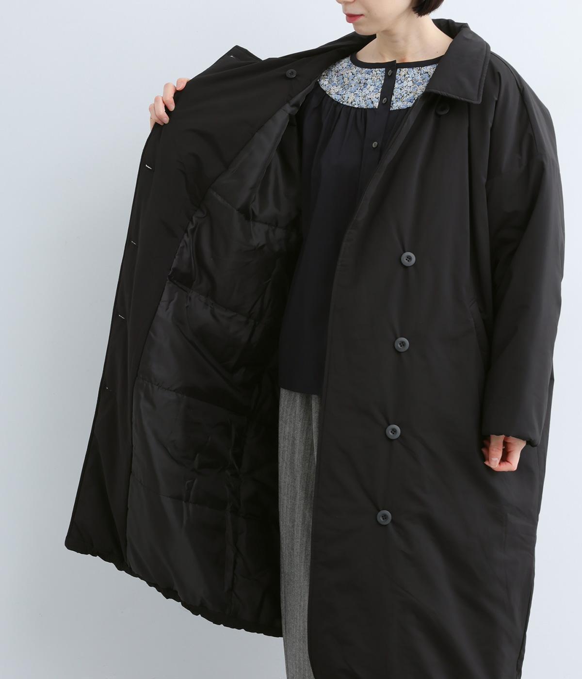 襟つき前ボタンの中綿入りロングコート。袖口と裾はシャーリング仕様で丸みのあるシルエットが作れます。身幅はゆとりがあり、厚手のニットなどもしっかり着こみやすいサイズ感。衿の形が3パターンアレンジでき、表情を変えられます。