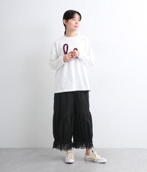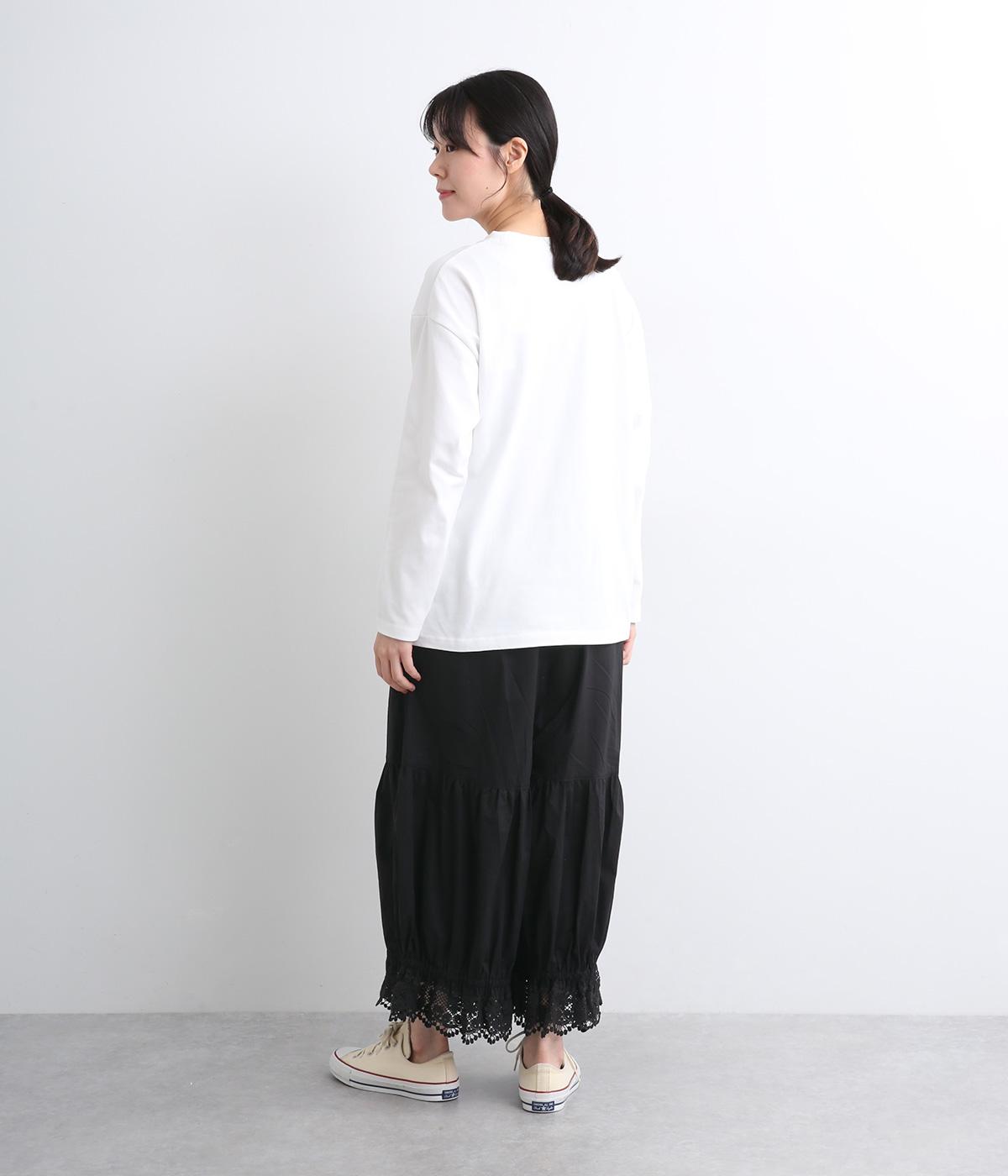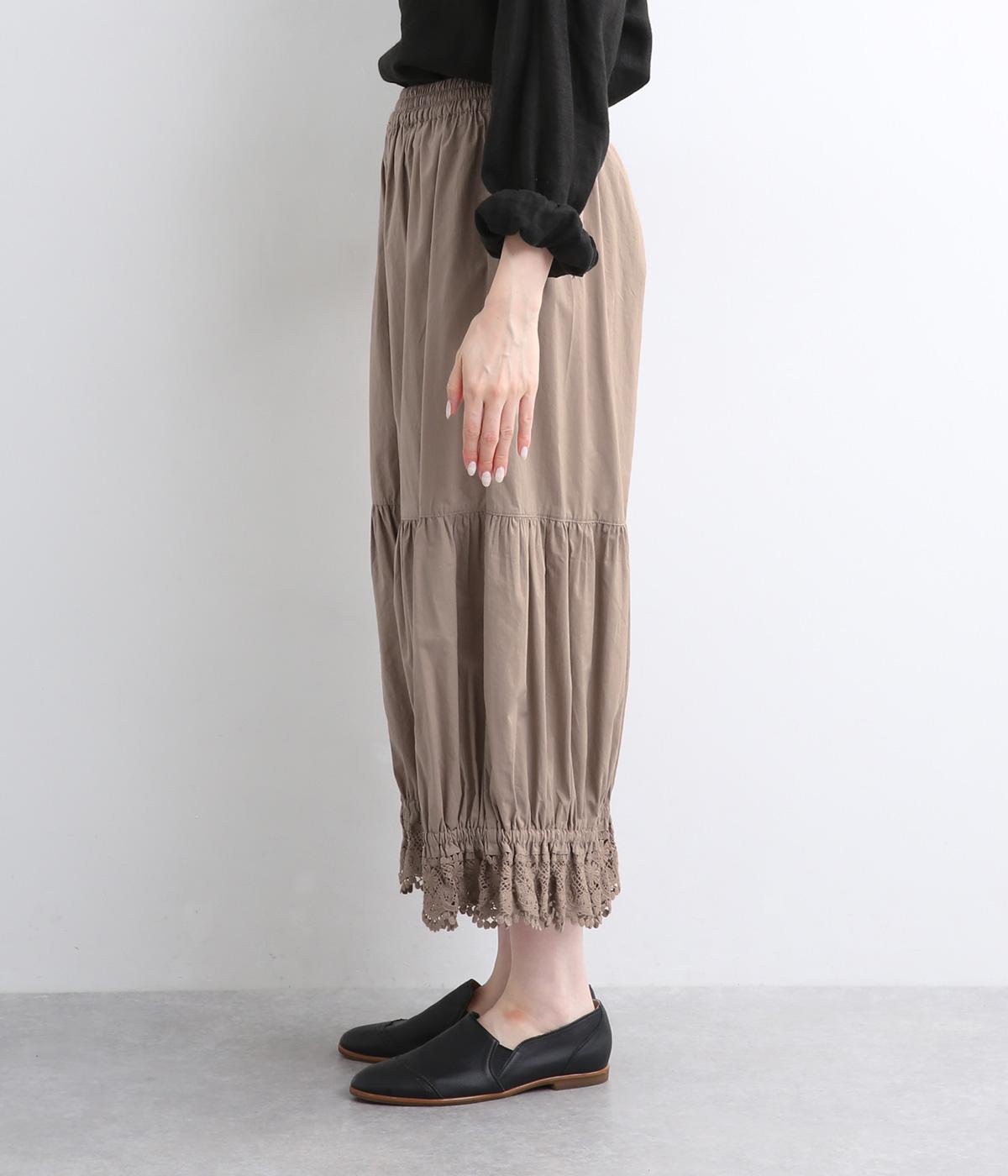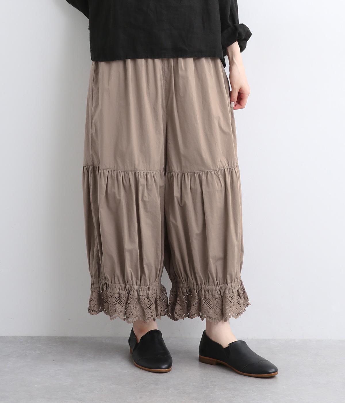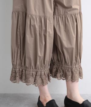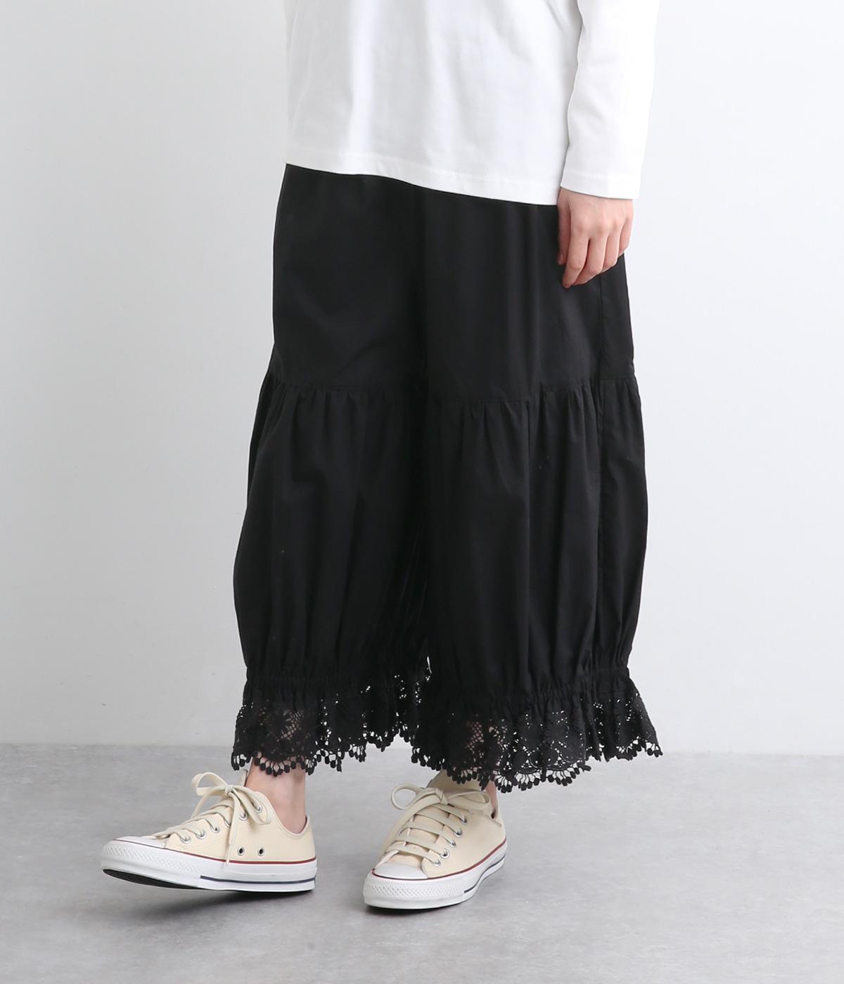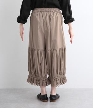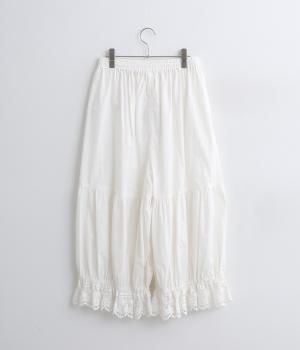 裾スカラップレースがアクセントのレースペチコートパンツです。ふっくらとボリュームがあり、ワンピースの下などにもぴったり。ウエストはオールゴムに内紐つき。裾のギャザーはゴム入りで、ショートブーツの上から合わせたりと汎用がききます。