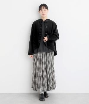 前立てから裾にかけた丸みのあるラインに、後ろタックで体を包み込むようなバルーンシルエットが目を惹きます。前裾は短くなっているのでワンピース合わせにもおすすめ。すっきりした丸首で襟つきアイテムとも好相性です。