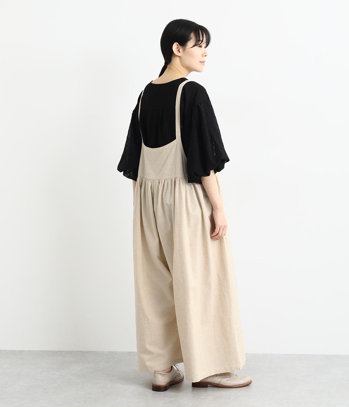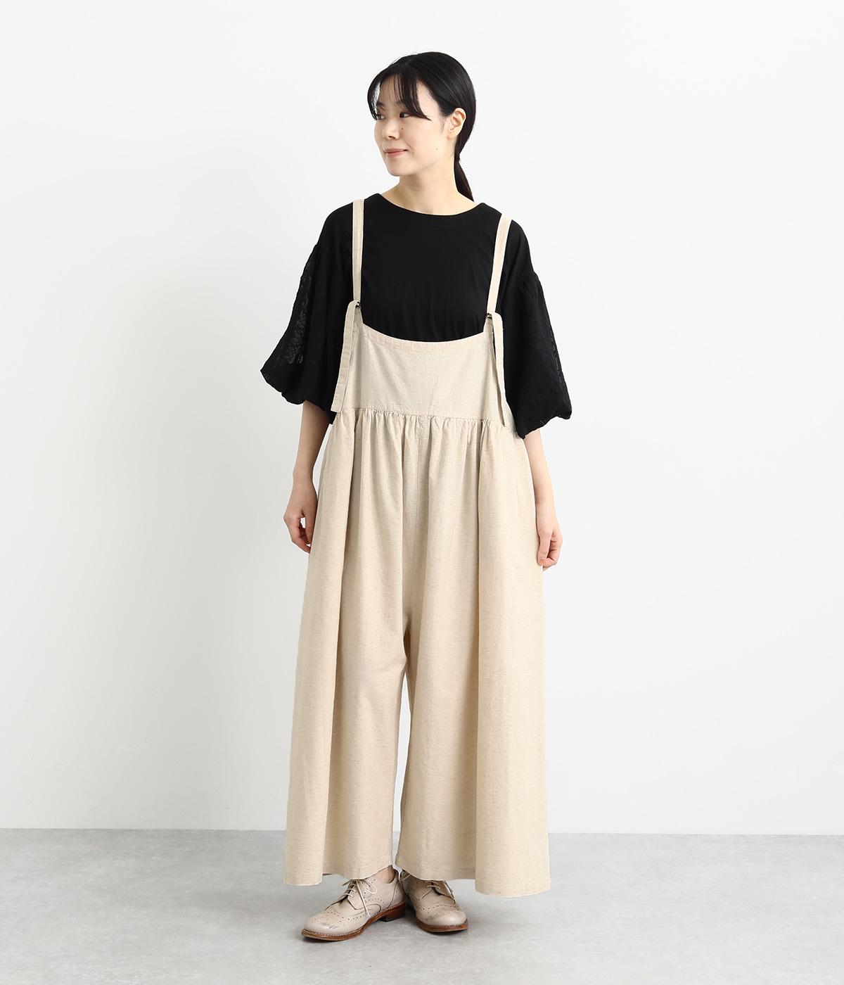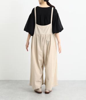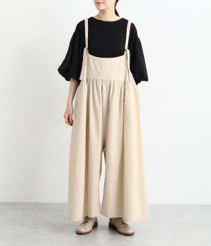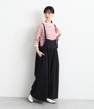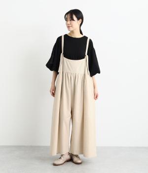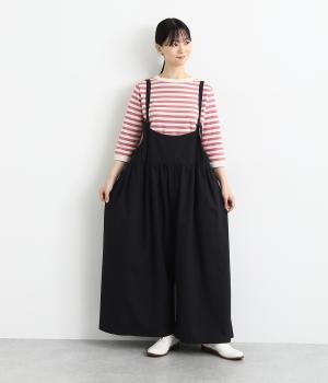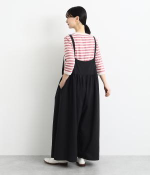 ウエスト切り替えにたっぷりとギャザーを施した、落ち感のあるシルエットのサロペットパンツ。肩部分はアジャスター付きで、身長に合わせて長さの調整が可能です。柄トップスとのコーディネートもおすすめ。