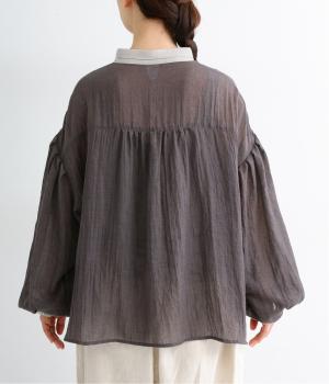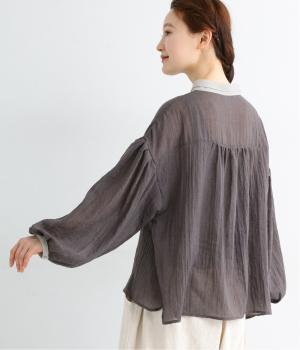 小ぶりの襟と、ころっとしたハトメくるみボタンが愛らしいブラウス。ゆったりとしたシルエットが、ガーゼ生地と相まってより軽やかな印象を与えてくれます。タックやギャザー使いにもこだわった、どこから見ても着映えが叶う一枚です。