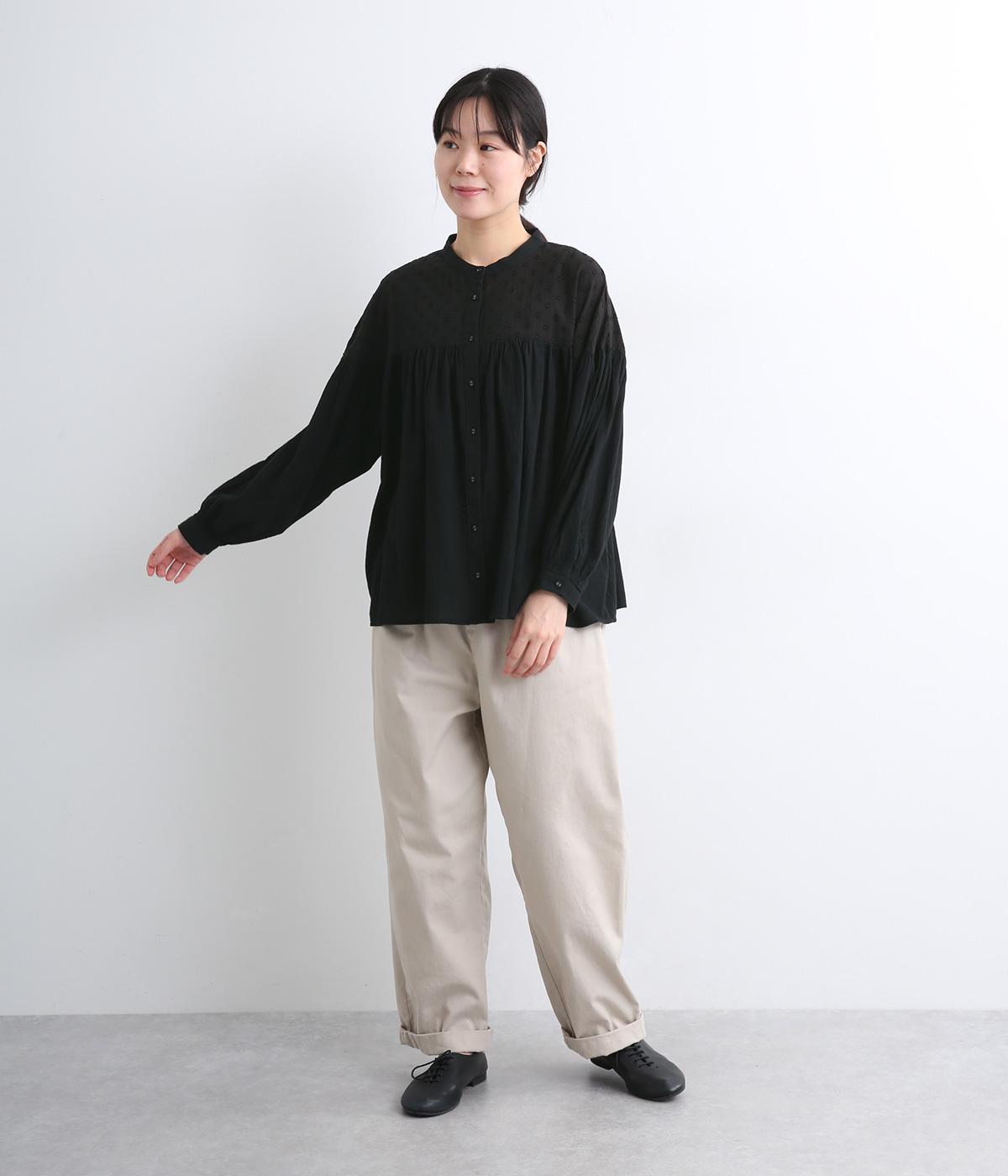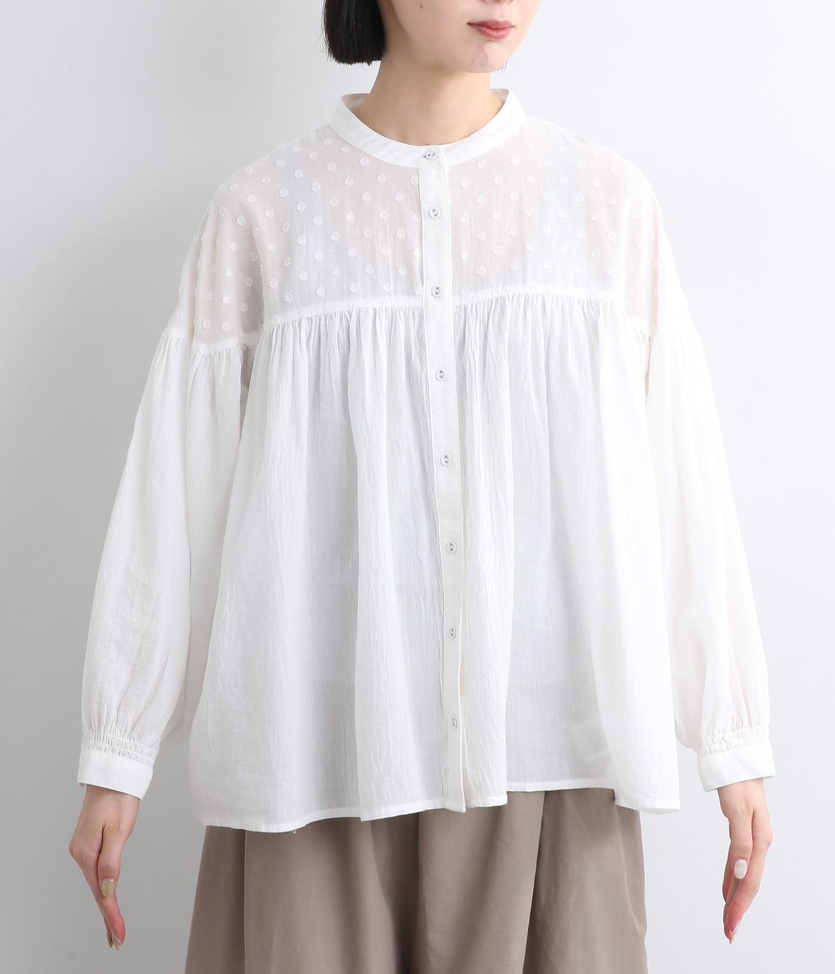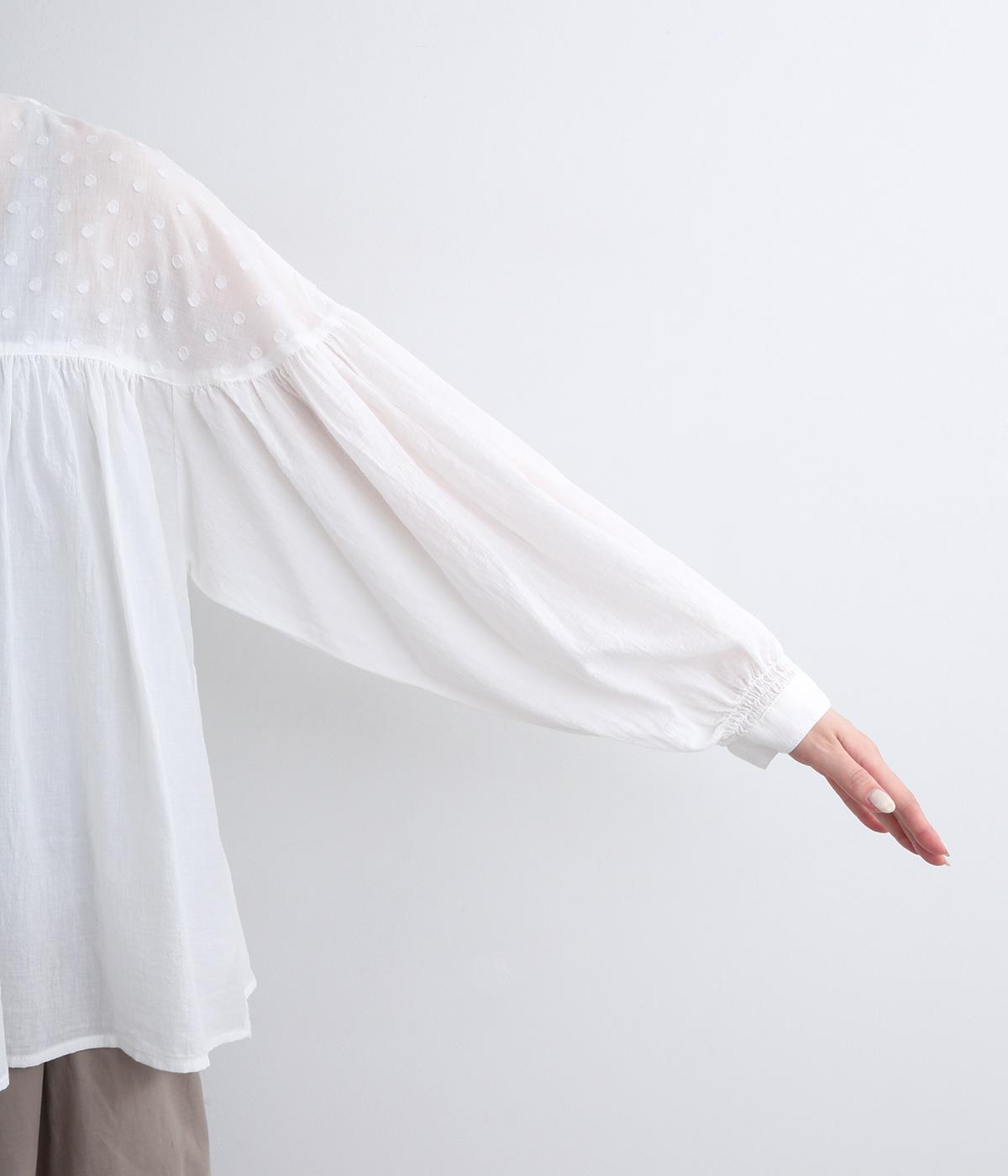 自然なシワ感がナチュラルさを演出するコットンローンと、さり気なく表情をつけてくれるドビードットを切り替えました。どちらも軽やかでやわらかく快適に着用できます。