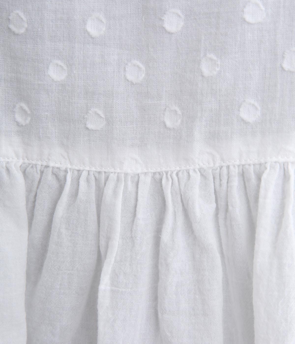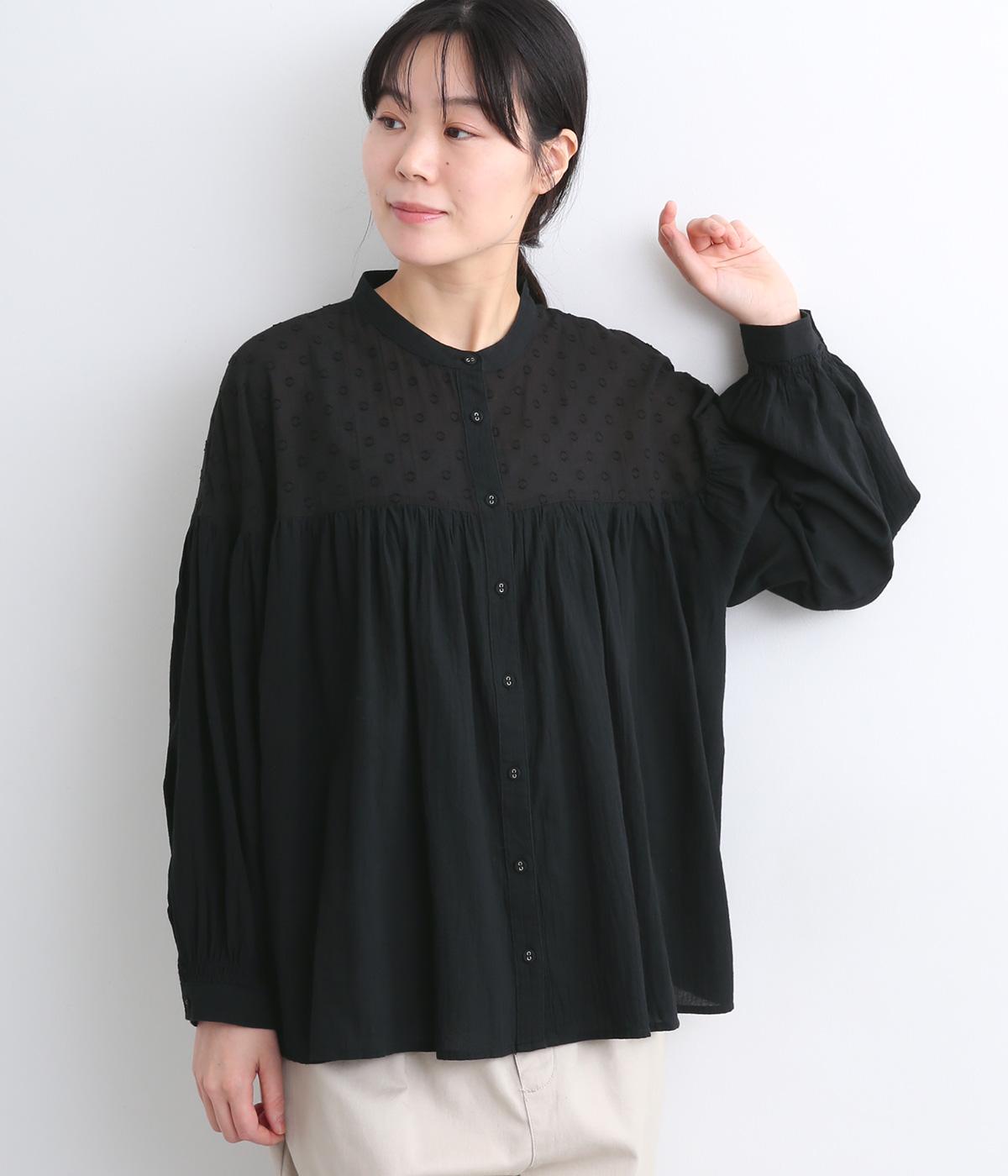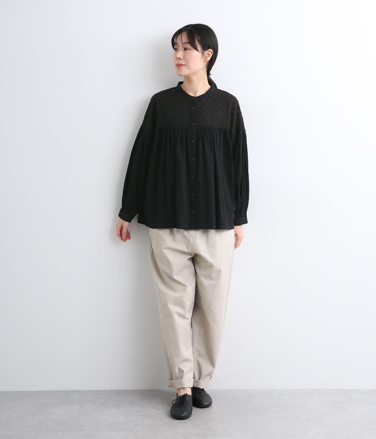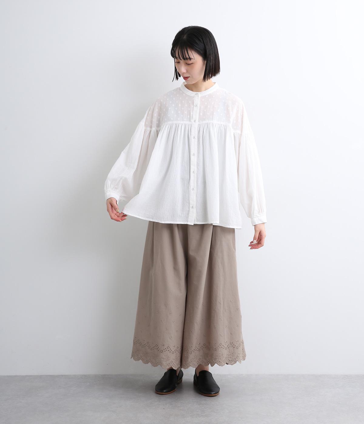 自然なシワ感がナチュラルさを演出するコットンローンと、さり気なく表情をつけてくれるドビードットを切り替えました。どちらも軽やかでやわらかく快適に着用できます。